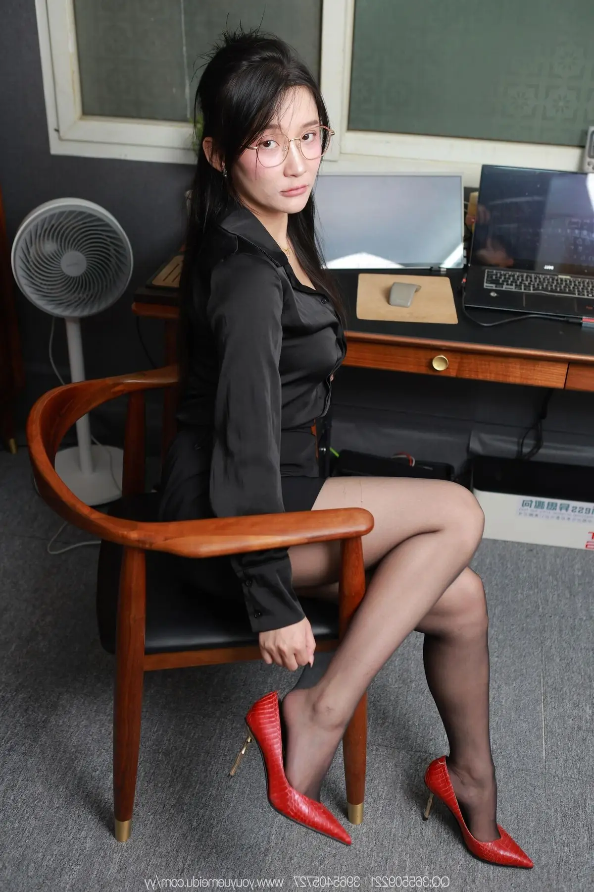 In the IESS SXJ No.2101 photo series, model Qiu Qiu captivates with her confident demeanor and elegant beauty. She dons a sophisticated black satin shirt paired with a chic short skirt, accentuating her long slender legs in alluring sheer stockings. Vibrant red high heels add a striking pop of color, completing a look that is both professional and undeniably seductive. Posed gracefully within a modern office setting, Qiu Qiu exudes an irresistible charm, perfectly blending Asian aesthetic with a high-fashion business style. Her gaze is direct and confident, drawing viewers into her sophisticated world.#QiuQiu #ChineseModel #IESS #OfficeFashion #SheerStockings #HighHeels #OfficeLady #OL
