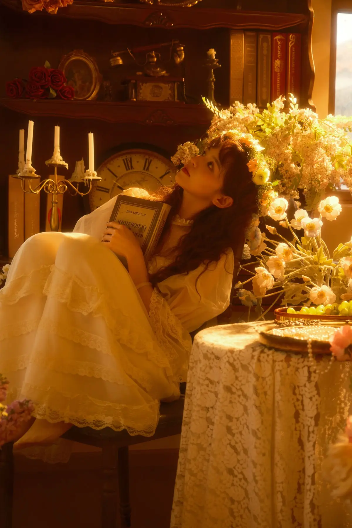 Immerse yourself in the enchanting beauty of Qiu Qiu from the YiTuYu Vol.8546 collection, where photographic art truly flourishes. This image captures Qiu Qiu in a moment of serene contemplation, adorned with a delicate flower crown and a flowing vintage-inspired white dress. She is gracefully seated amidst an abundance of soft-hued blossoms, bathed in a warm, golden light that creates a dreamy Tyndall effect, enhancing her ethereal charm. Every detail, from the lace-covered table to the antique decorative elements, contributes to a romantic tableau, inviting viewers into a timeless fairytale. This piece beautifully blends natural grace with artistic composition, evoking a sense of peaceful elegance and poetic charm.#QiuQiu #YiTuYu #VintageBeauty #GoldenHour #ArtPhotography