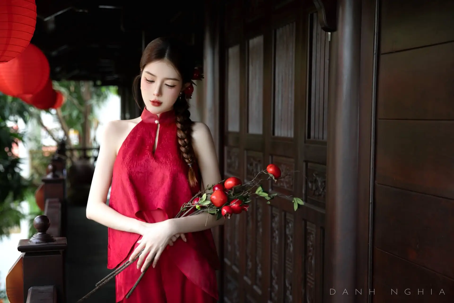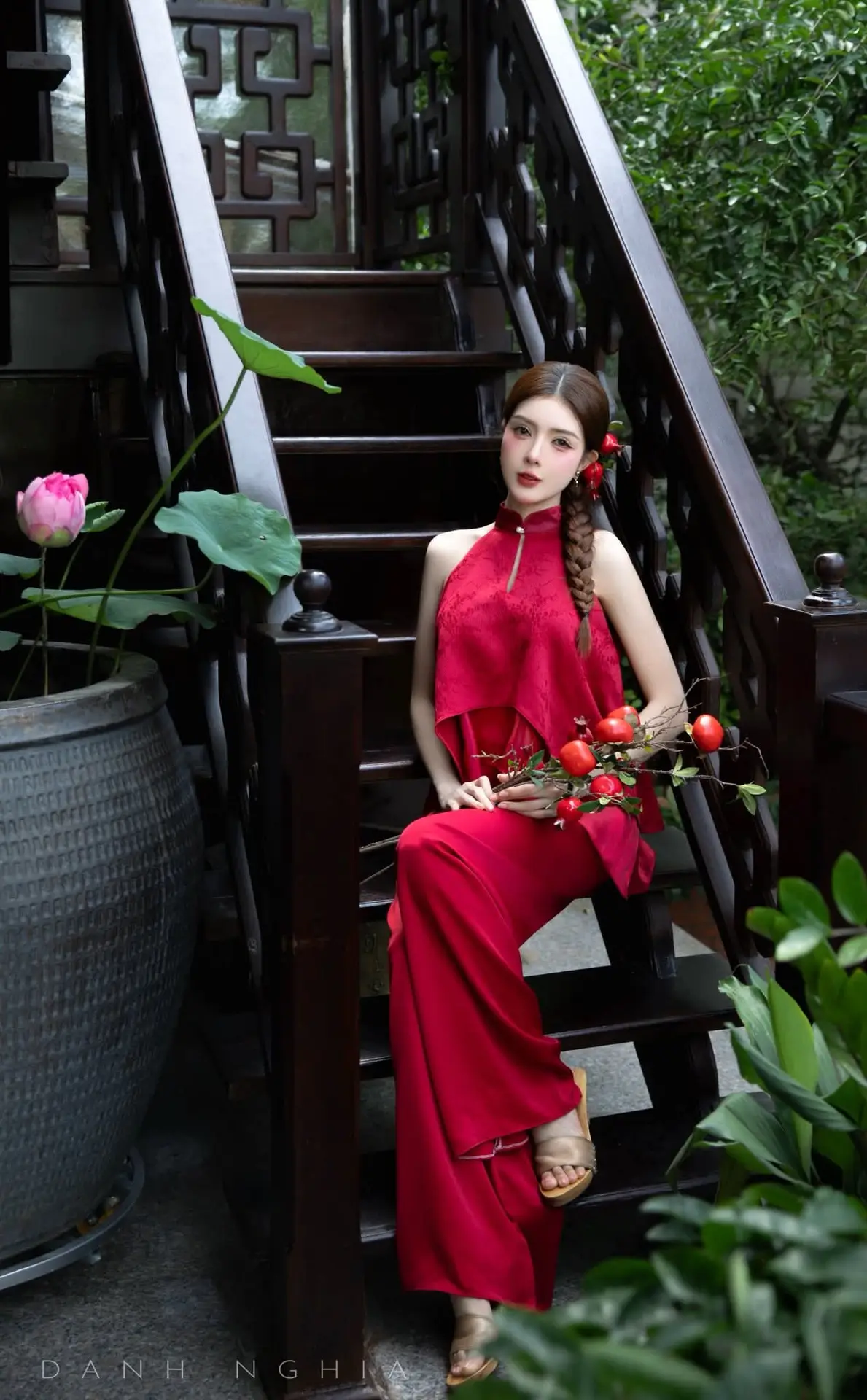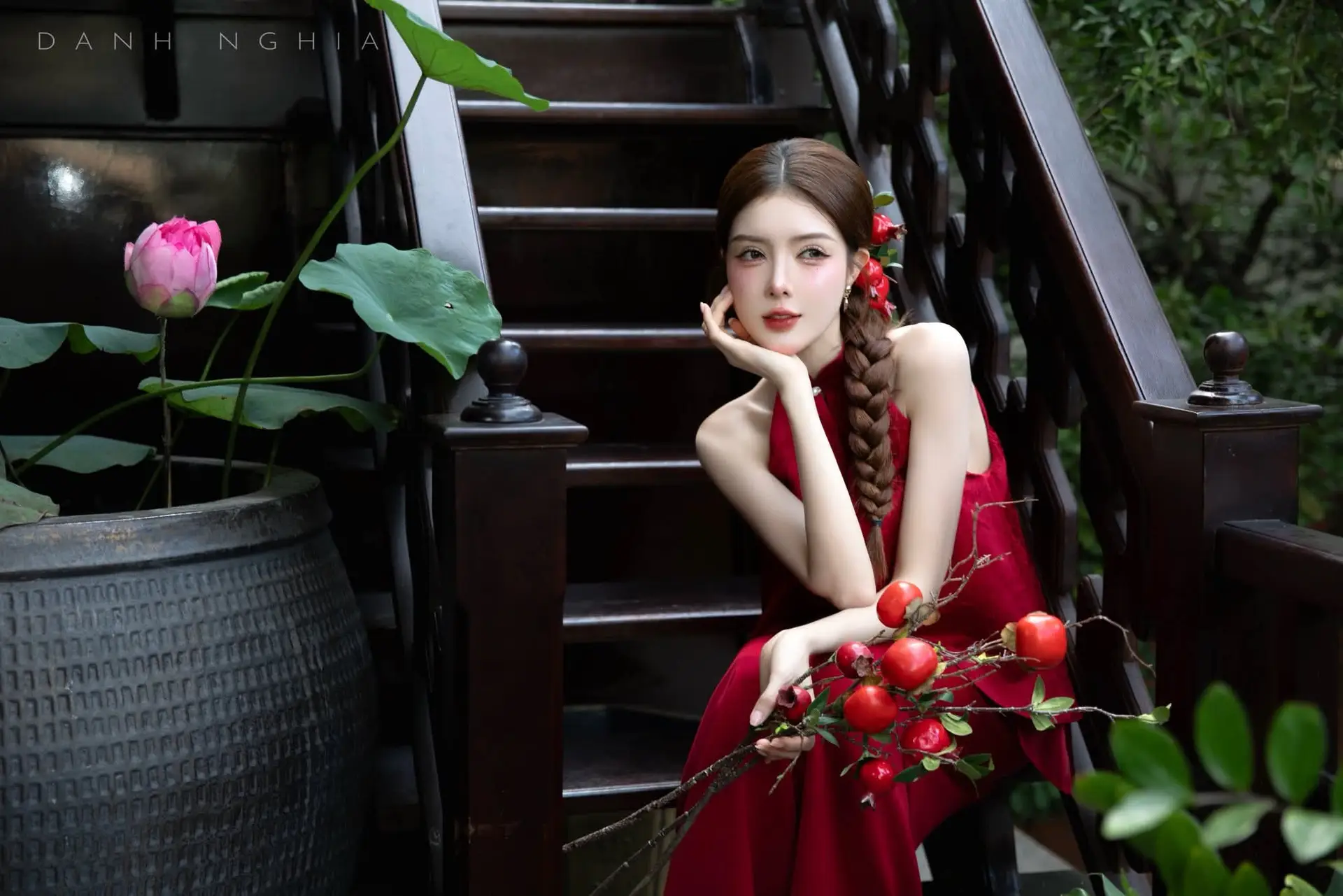 This stunning photograph captures the enchanting Asian beauty of a young woman in a striking red dress. She sits gracefully on rustic wooden stairs, exuding an elegant and contemplative aura. Beside her, a vibrant pink lotus flower blooms, symbolizing purity and traditional charm. Her deep gaze and intricately braided hair adorned with small red berries create a harmonious and captivating composition. More than just a portrait, this is a work of art that transports viewers to a peaceful space where time seems to stand still, celebrating the eternal beauty of women and nature. A truly artistic shot evoking classic style.#AsianBeauty #RedDress #LotusFlower #ArtisticPhotography #TraditionalVibes