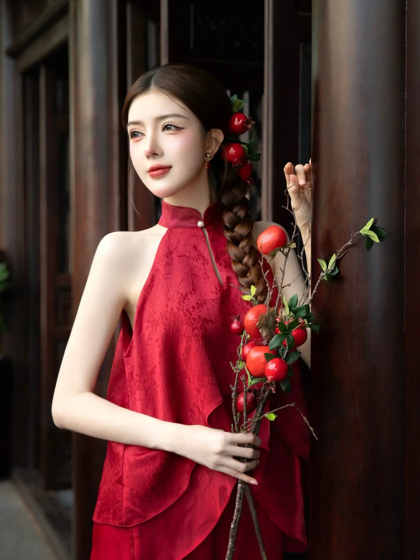 This captivating image features a youthful and beautiful woman exuding an enchanting charm. She adorns a striking red dress, exquisitely designed with a halter neck and flowing ruffles, creating an aura of grace and sophistication. The vibrant red hue not only enhances her fair complexion but also radiates confidence and allure. Her dark hair is adorned with a matching red headband, further accentuating her fresh and gentle demeanor. She stands amidst a traditional setting, complete with meticulously pruned bonsai trees and ancient architecture in the background, forming a harmonious and picturesque backdrop. Her gentle gaze downwards conveys a thoughtful yet captivating expression, evoking a sense of tranquility and elegance. This portrayal beautifully embodies modern Asian beauty, blending traditional elements with contemporary style.#AsianBeauty #RedDressStyle #ElegantWoman #TraditionalCharm #ModernTradition