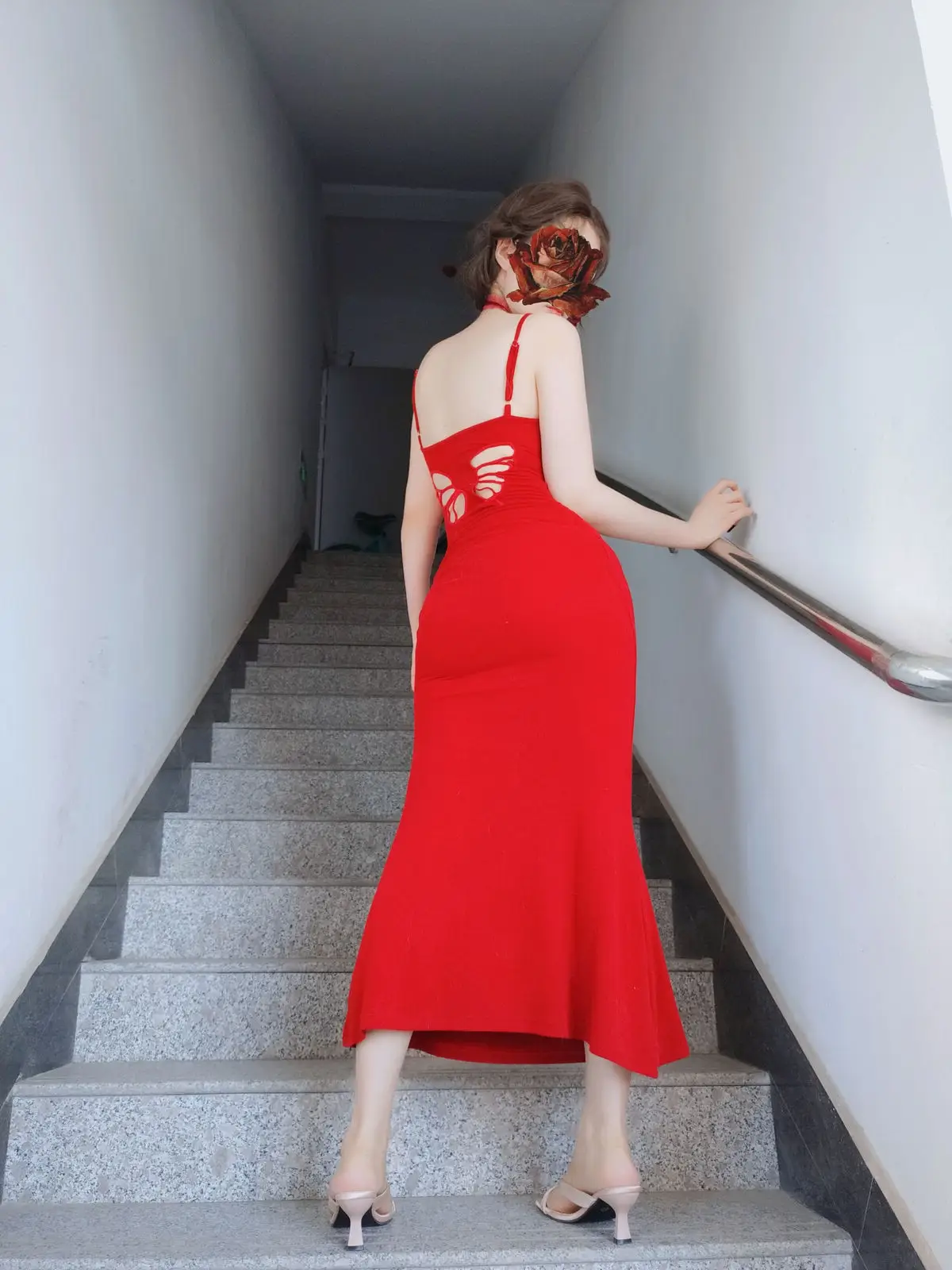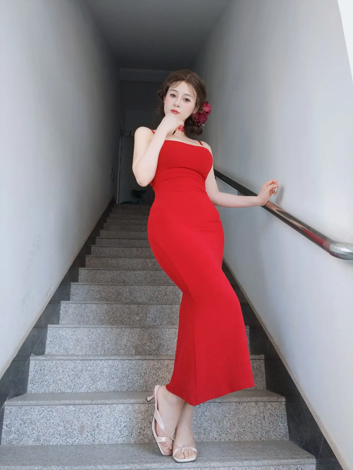 In this captivating image, Coser Baiyin radiates enchanting beauty, adorned in a form-fitting red dress that accentuates her graceful silhouette. The elegant attire not only highlights her alluring curves but also embodies the sophisticated and confident demeanor of a mature woman. Each step on the staircase exudes a magnetic charm, drawing every eye. A delicate red flower in her hair adds a refined touch, emphasizing her regal and vibrant appearance. This photograph transcends a mere pose; it conveys a story of self-assuredness, timeless grace, and irresistible appeal. It beautifully captures the unique style and personality that define Coser Baiyin.#CoserBaiyin #RedDressFashion #MatureBeauty #ElegantStyle #FantiaCoser