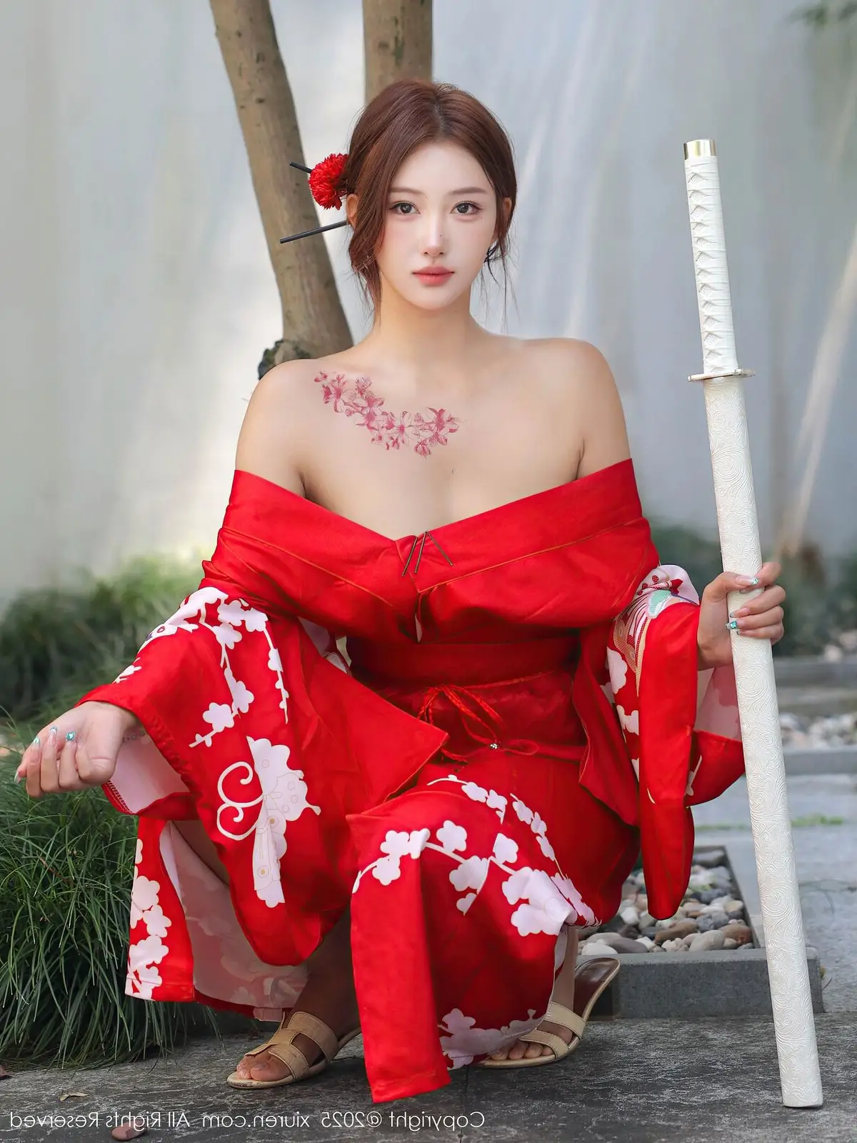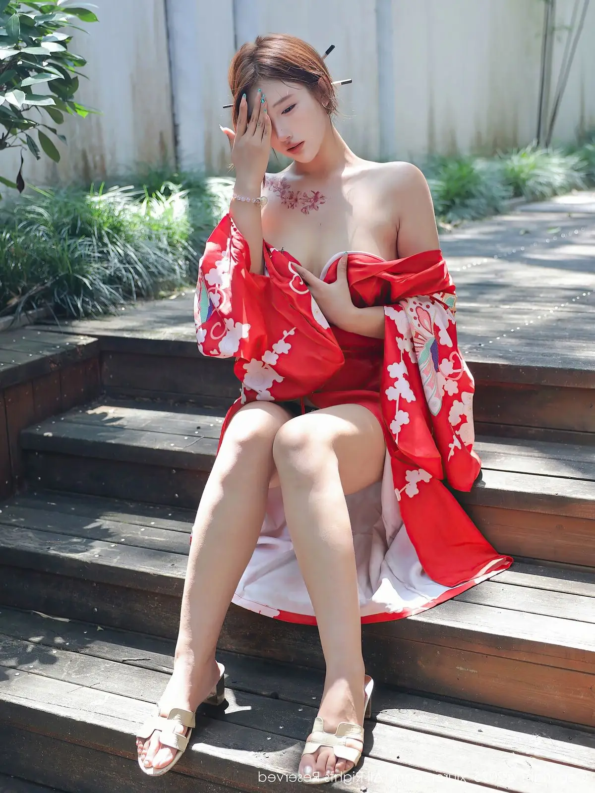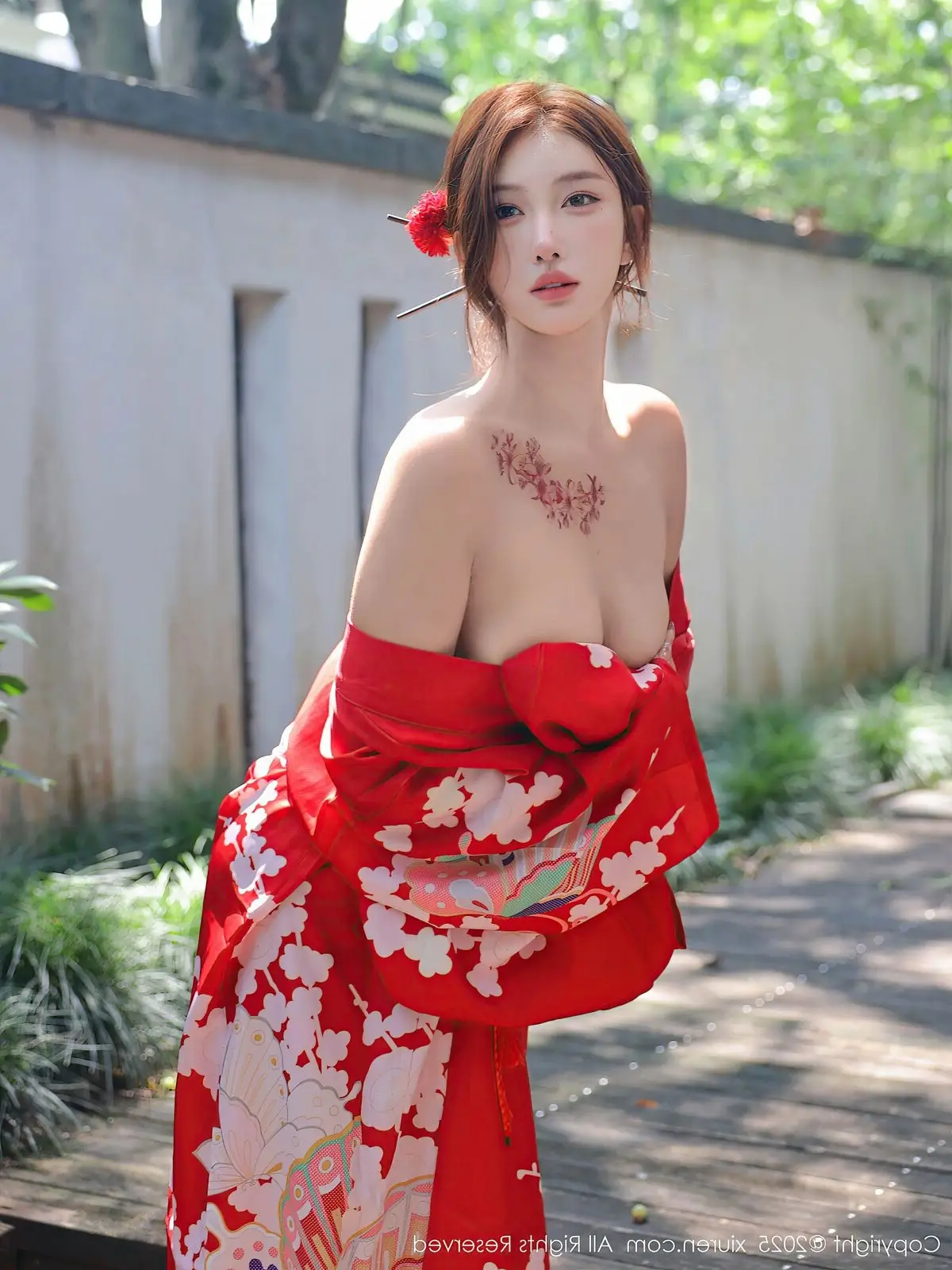 Jin Yun Xi Yuki radiates brilliantly in a traditional red kimono, yet styled with captivating allure. The striking red hue, adorned with delicate white floral patterns, highlights her graceful and elegant beauty. The kimono is artfully draped, revealing alluring bare shoulders, creating a harmonious blend of classic charm and modern appeal. Jin Yun Xi Yuki’s captivating gaze and confident demeanor make it impossible for viewers to look away. She stands on wooden steps amidst a lush green setting, forming a picturesque and enchanting scene. This is not merely a fashion photograph but a sophisticated expression of East Asian beauty, exuding an irresistible charm.#JinYun #XiYuki #RedKimono #AsianBeauty #XiuRenNo10683 #SeductiveFashion