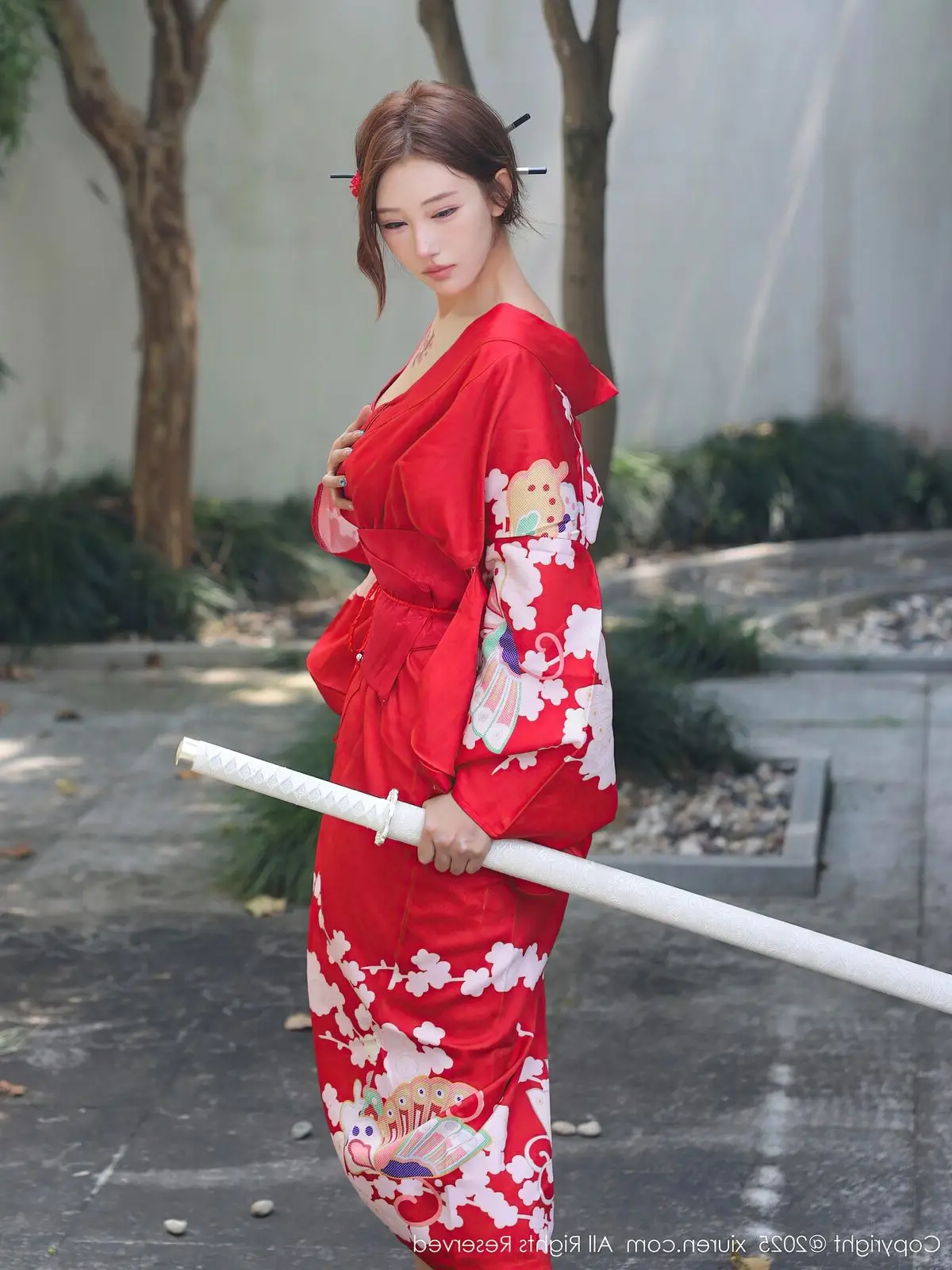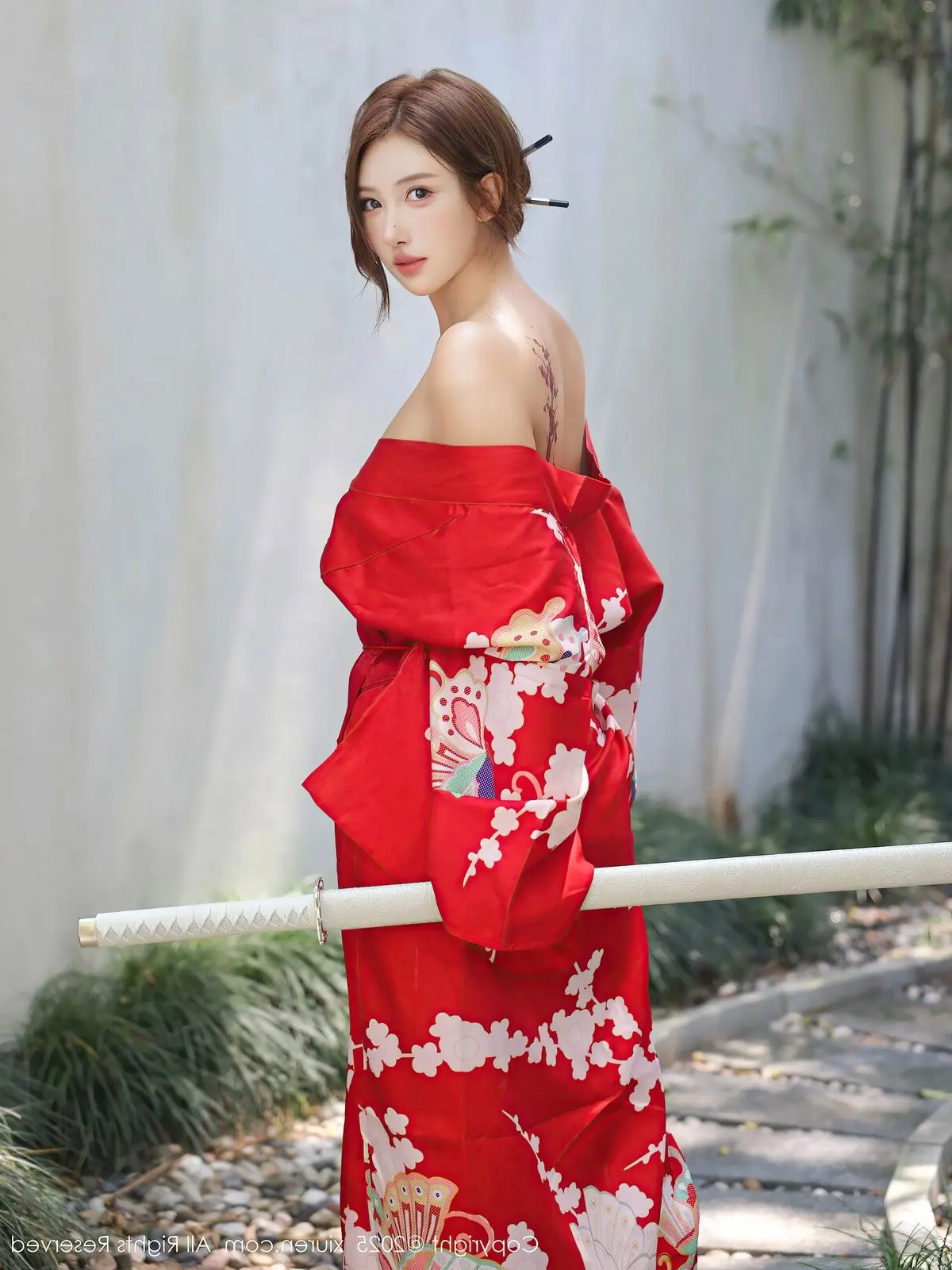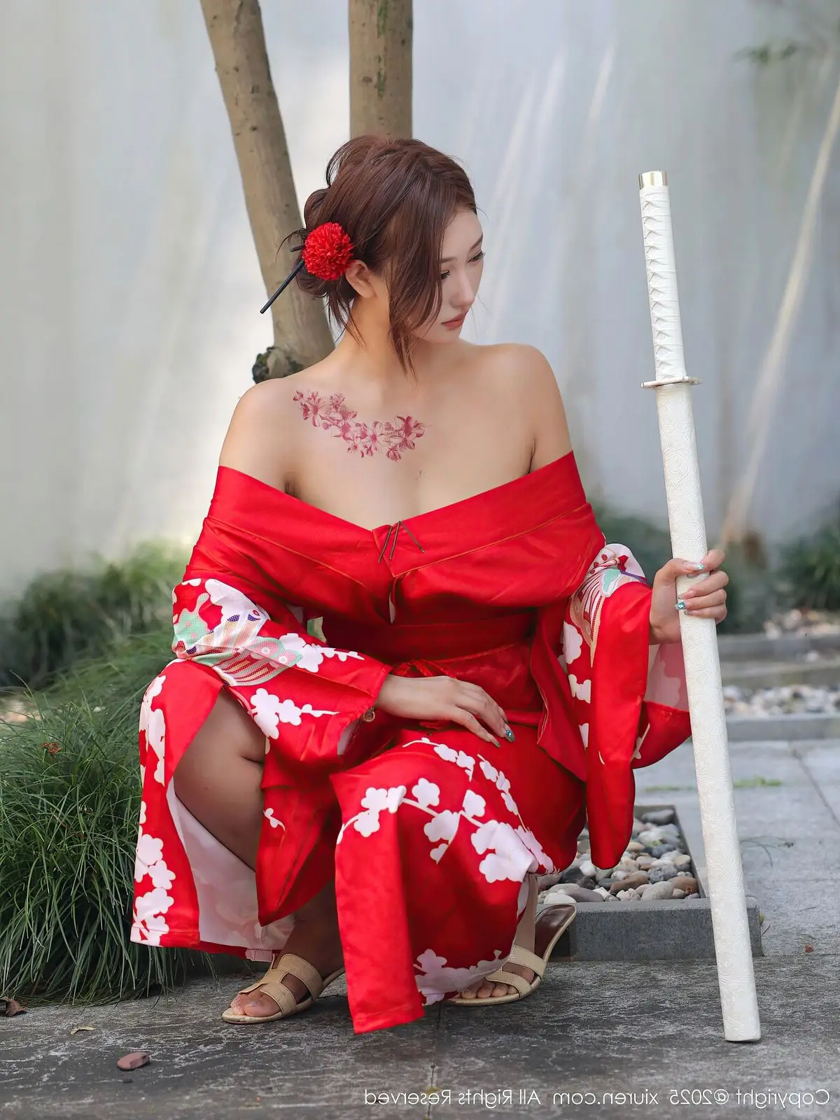 Jin Yun Xi Yuki radiates brilliantly in a traditional red kimono, yet styled with captivating allure. The striking red hue, adorned with delicate white floral patterns, highlights her graceful and elegant beauty. The kimono is artfully draped, revealing alluring bare shoulders, creating a harmonious blend of classic charm and modern appeal. Jin Yun Xi Yuki’s captivating gaze and confident demeanor make it impossible for viewers to look away. She stands on wooden steps amidst a lush green setting, forming a picturesque and enchanting scene. This is not merely a fashion photograph but a sophisticated expression of East Asian beauty, exuding an irresistible charm.#JinYun #XiYuki #RedKimono #AsianBeauty #XiuRenNo10683 #SeductiveFashion