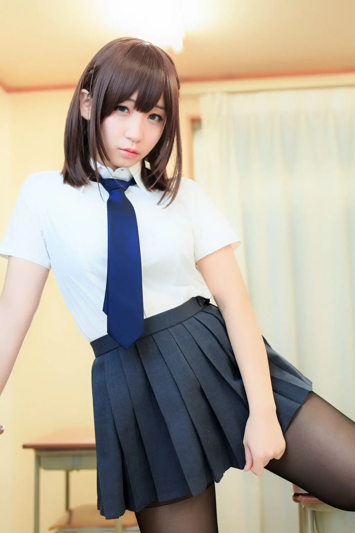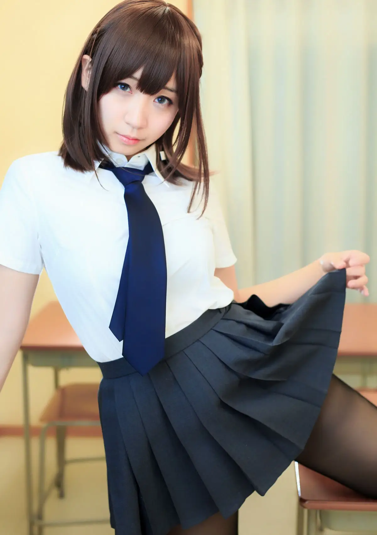 This captivating image captures a moment of youthful charm with Moe Iori (伊織萌) in a classic school uniform. Seated at a wooden desk her neatly styled short hair and tie create an energetic yet innocent look. Her gaze holds a touch of contemplation evoking the image of a schoolgirl lost in her thoughts perhaps during a break or after a demanding class. The blend of her natural beauty and the school setting offers an authentic relatable portrayal of "Monday's Child" (月曜日のあの子). Every detail from the earbud to the drink on the desk contributes to a vivid snapshot of student life inviting viewers to appreciate this serene scene.#MoeIori #IoriMoe #SchoolUniform #JapaneseSchoolgirl #YouthfulVibes