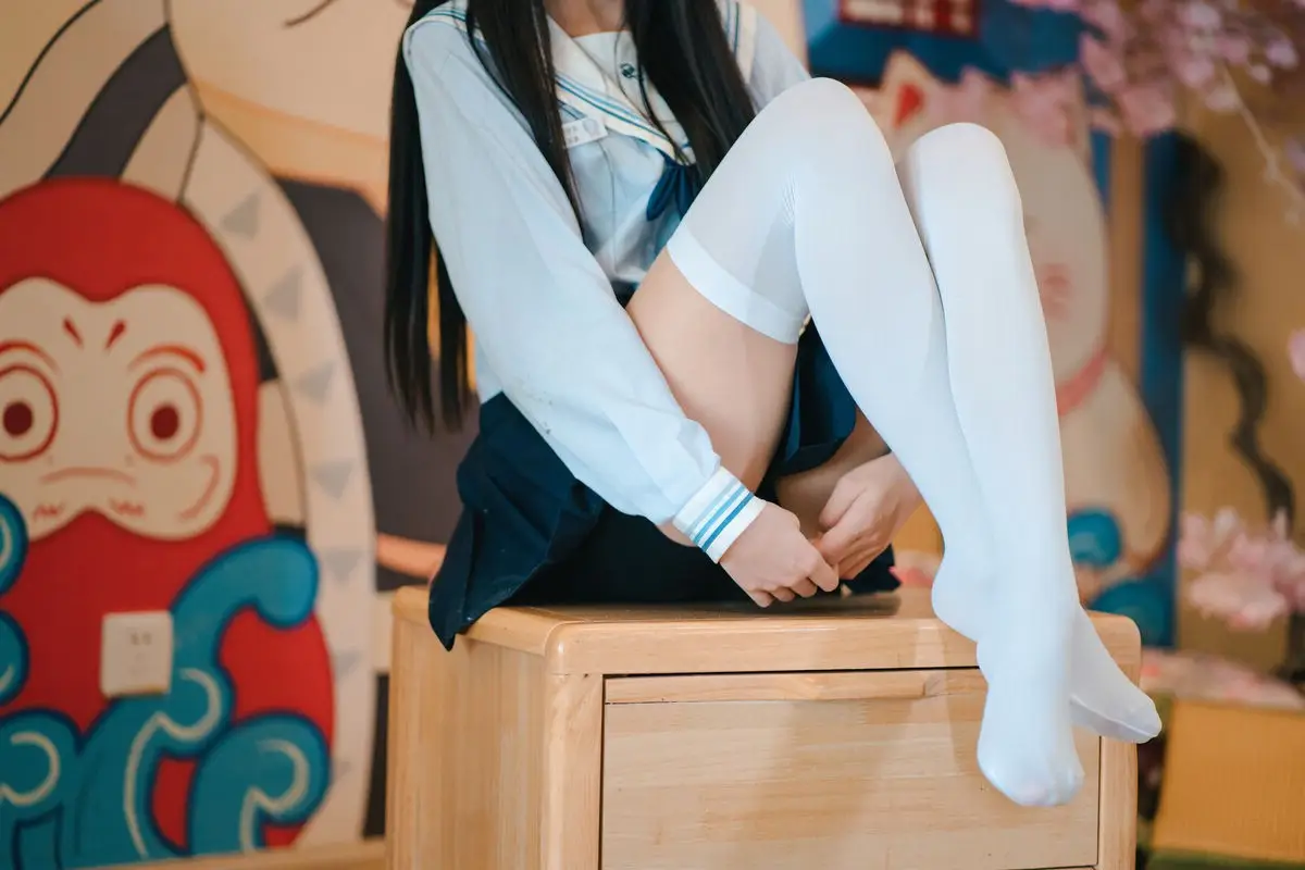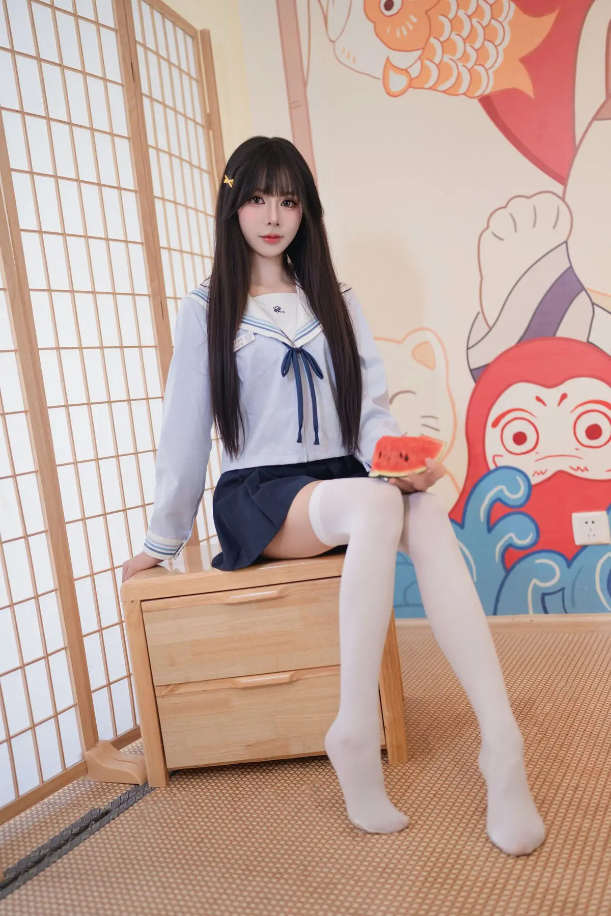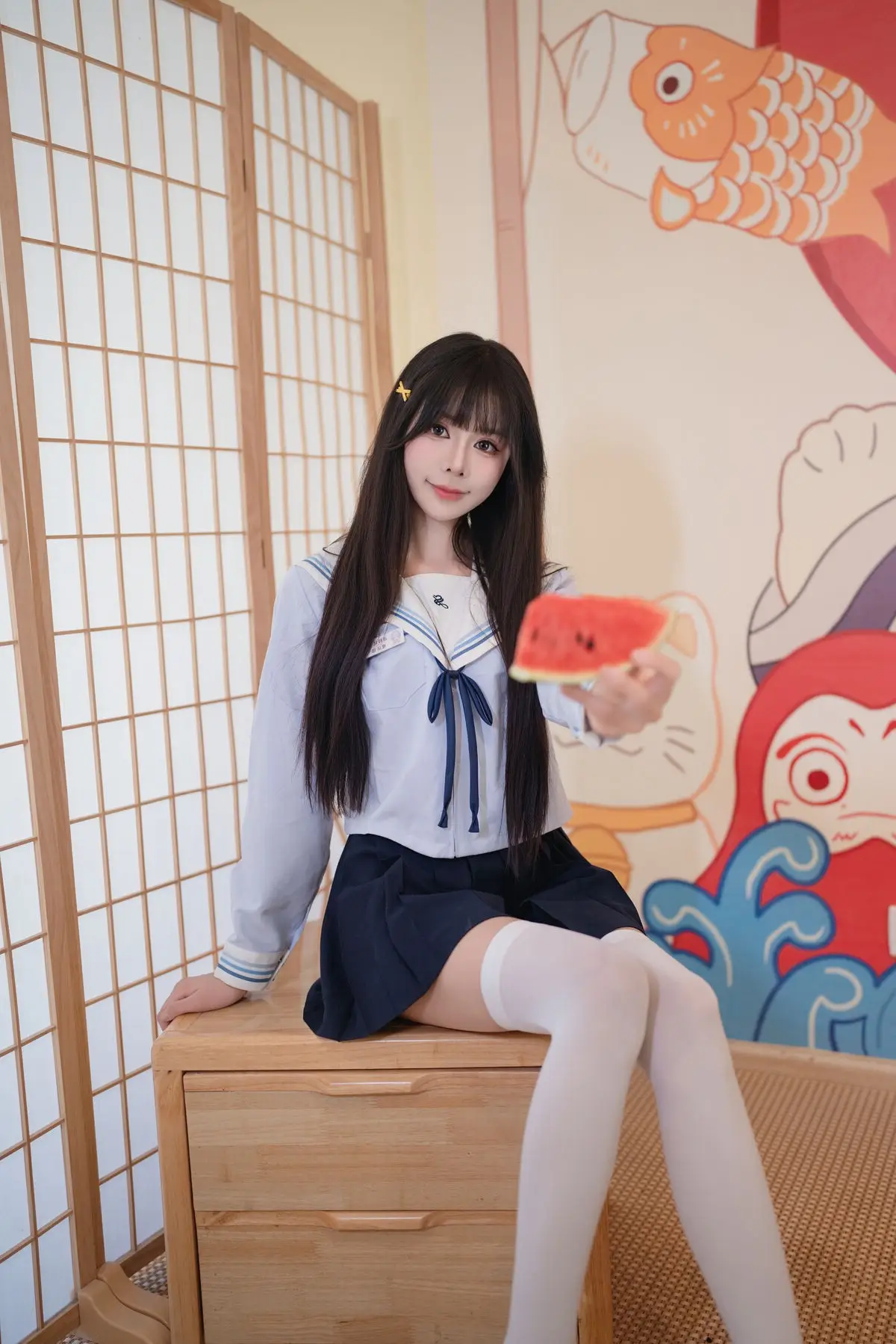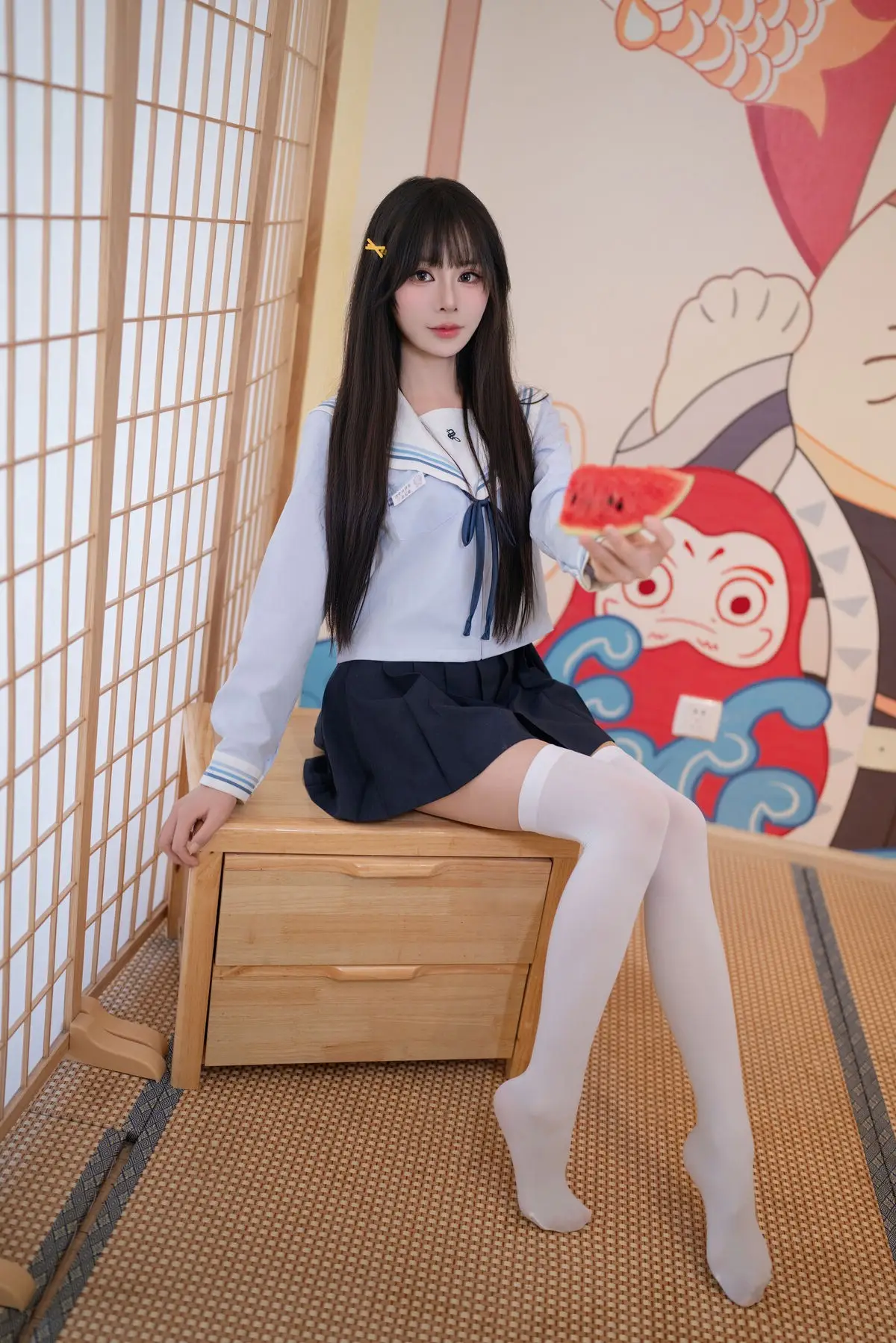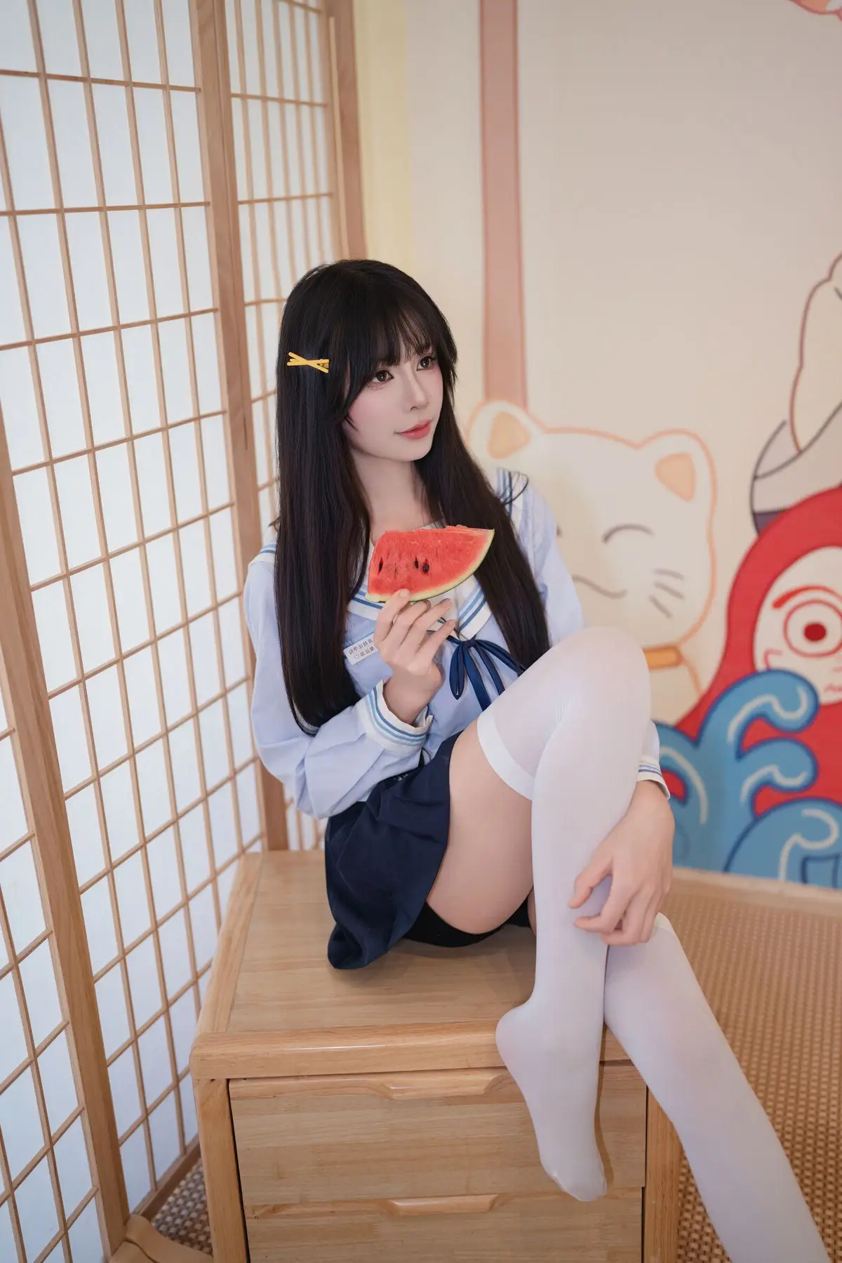 Coser Chi Le Ge Chi shines brightly in a traditional Japanese school uniform, featuring a pristine white shirt, a dark pleated skirt, and elegant white thigh-high socks. Posing gracefully on a wooden bench within a distinctly Japanese-style setting, she exudes a charming blend of innocence and allure. The image of her holding a juicy slice of red watermelon not only evokes the refreshing essence of summer but also highlights her pure and lovely nature. This picture is a sweet snapshot from Summer Soliloquy (夏日呓语) Part03, where youthful beauty and gentle charm intertwine, captivating the viewer. Every detail, from her soft gaze to her subtle smile, contributes to a romantic and poetic moment that truly enchants.#Coser #ChiLeGeChi #JapaneseSchoolgirl #SchoolUniform #SummerDream #YouthfulBeauty