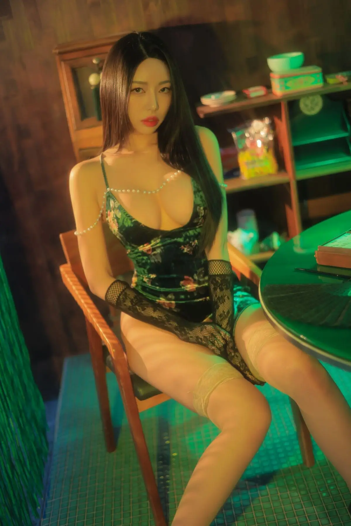 In the captivating Dongeuran Hong Kong Part01 series, model Dongeuran emerges as an embodiment of allure and mystery beneath the ethereal neon glow. She dons a sensuous floral outfit, elegantly paired with long black gloves and sheer stockings, accentuating her graceful silhouette. The soft blue and green ambient lighting exquisitely highlights her fair complexion and sharp features, crafting an enchanting and captivating atmosphere. Every element within this photograph radiates sophistication and a unique flair, inviting viewers to delve into the narrative behind her expressive gaze. This image is undoubtedly a memorable highlight in the Hong Kong collection.#Dongeuran #HongKong #Model #SeductiveFashion #AsianBeauty #GlamourShoot
