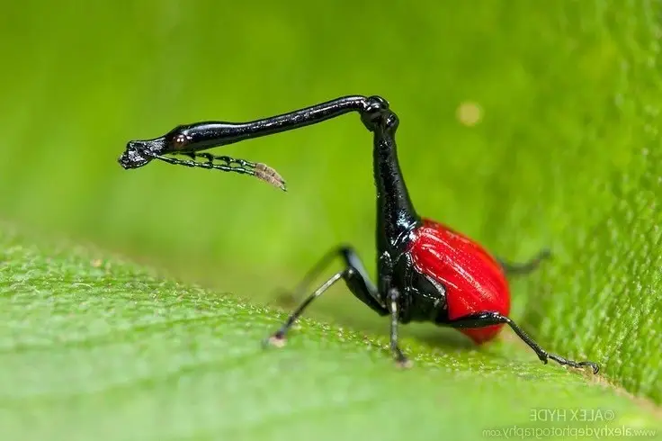 This close-up image features the striking giraffe weevil Trachelophorus giraffa characterized by its vibrant red wing covers and sleek black body. Its most captivating attribute is the uniquely elongated neck making it resemble a miniature giraffe within the insect kingdom. This peculiar neck is not merely a distinguishing feature but plays a crucial role in the species sexual evolution and its intricate nest-building function. This remarkable insect primarily inhabits Madagascar where its diverse ecosystem has fostered such extraordinary creatures. Males utilize their long necks for competitive mating rituals and skillfully rolling leaves to create protective cocoons for their eggs showcasing sophisticated survival tactics. This adaptation not only fascinates scientists but also contributes significantly to the richness of biodiversity.#GiraffeWeevil #MadagascarInsects #LongNeckInsect #UniqueCreatures #InsectWorld