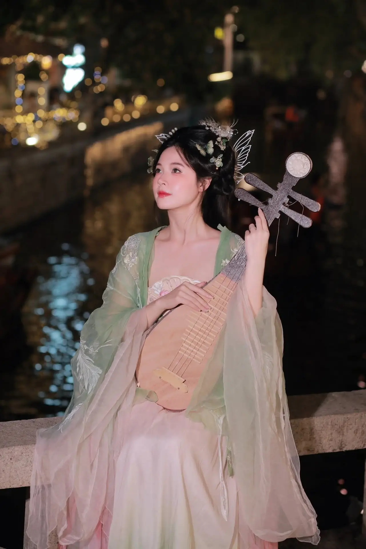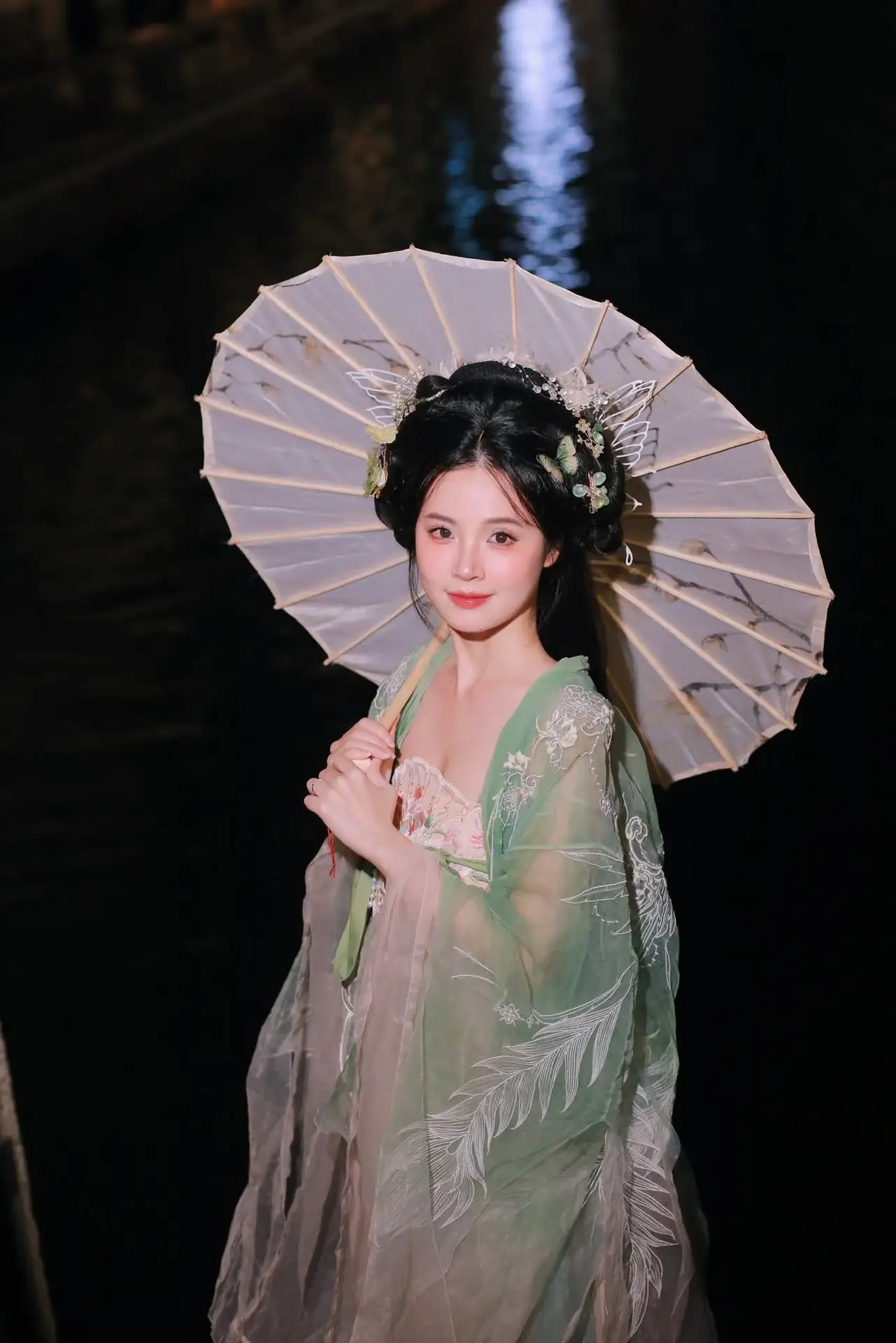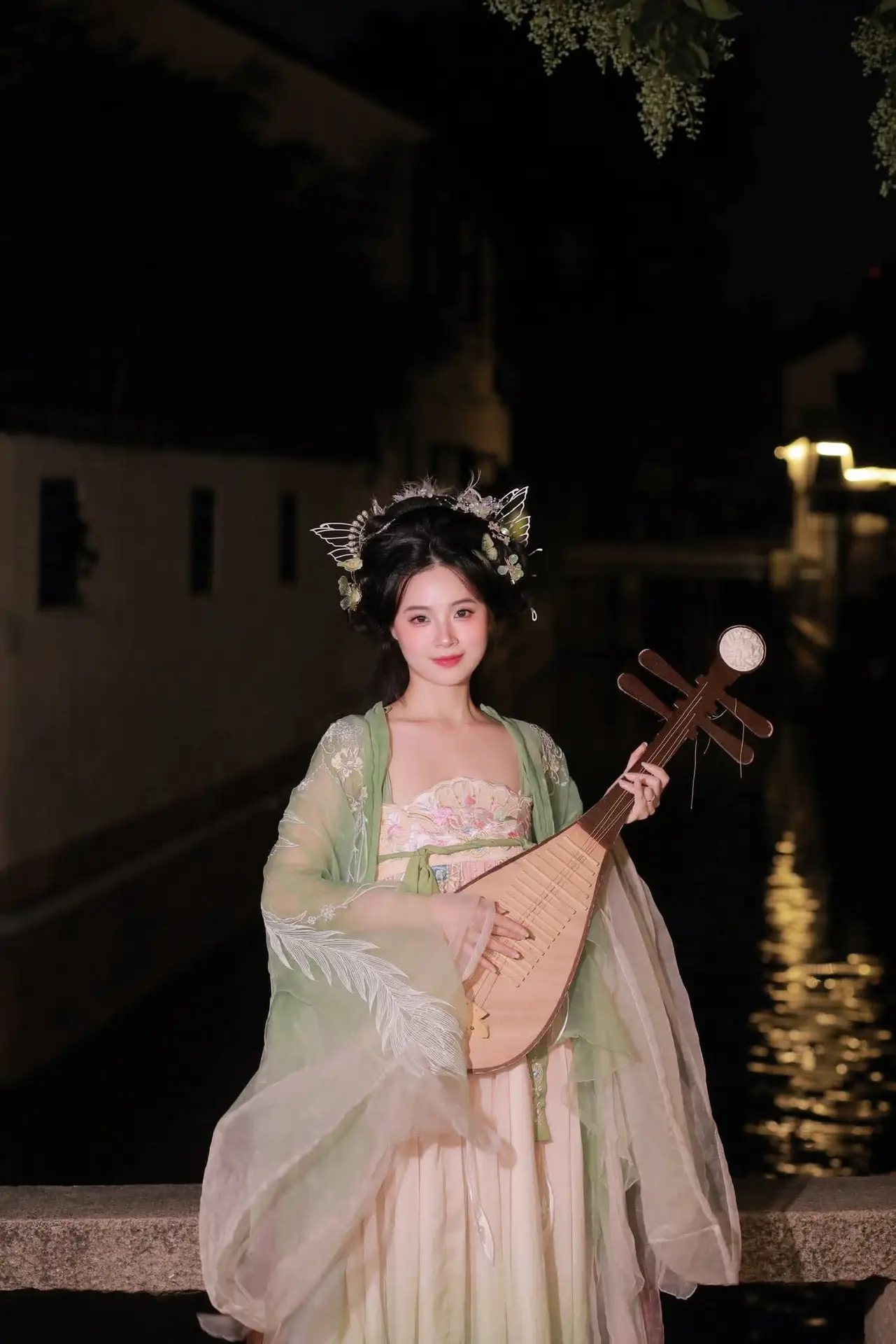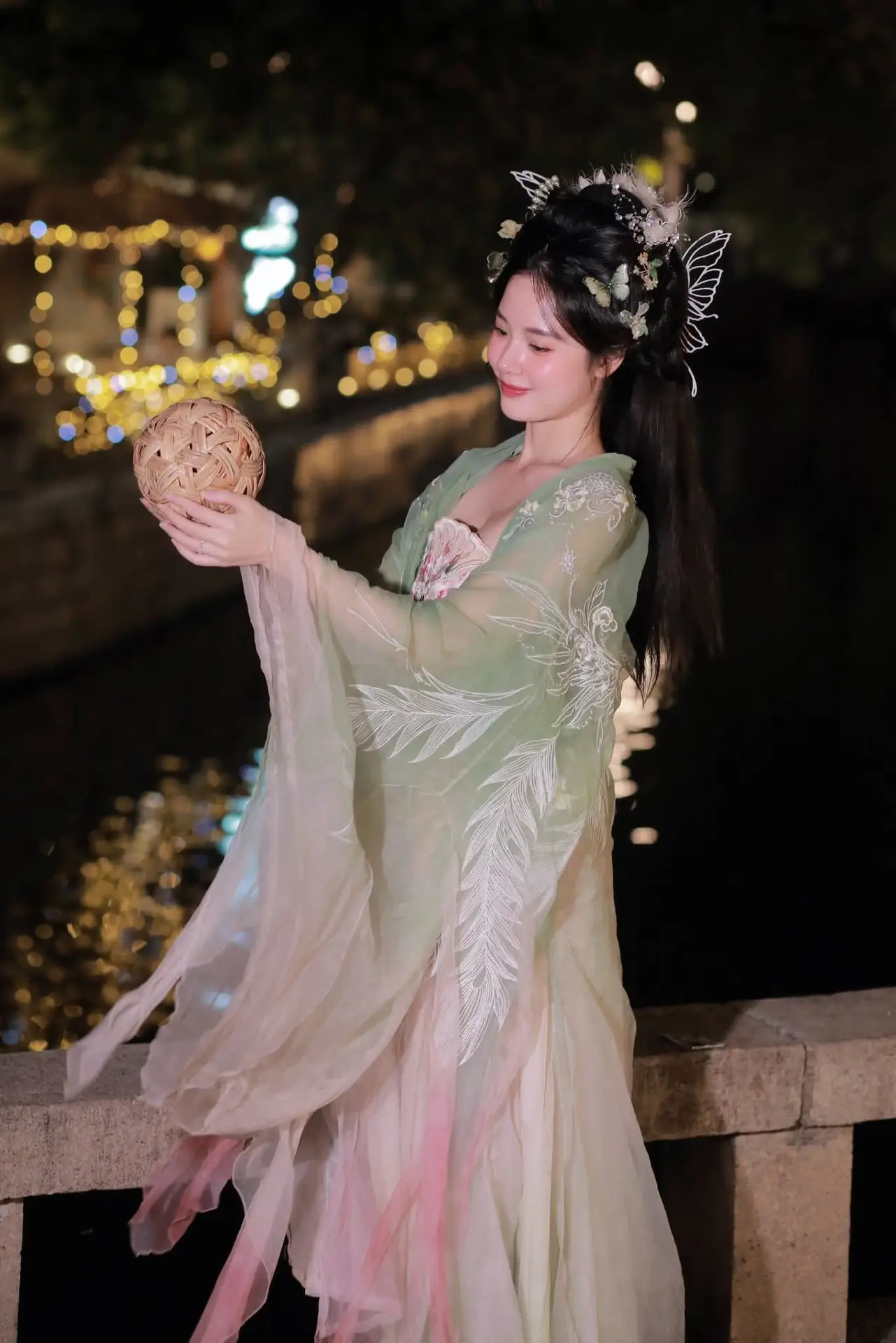 This VGU No.175 image captures the exquisite charm of an Asian muse adorned in a delicate jade green traditional costume. The young woman exudes a gentle and elegant demeanor her hair embellished with shimmering accessories resembling morning dew. She holds a handcrafted spherical object with a soft smile creating a poetic moment. Behind her a dazzling night scene with lights reflecting on the water surface forms an enchanting and romantic ambiance. The entire photograph is a perfect blend of traditional beauty and modern allure evoking a sense of tranquility and dreaminess in the viewer. It is an artistic masterpiece celebrating the cultural elegance and serene grace of an Asian woman against the night sky.#Muse #TraditionalAttire #NightBeauty #Elegance #CulturalHeritage
