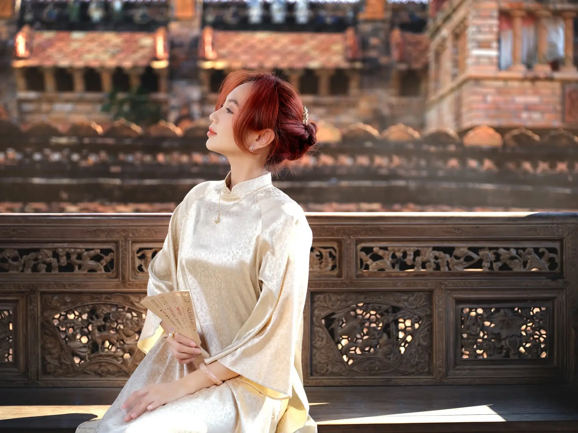 This stunning photograph beautifully captures the elegant and graceful charm of a young Vietnamese woman in her traditional Ao Dai. With vibrant reddish hair and a gentle shy smile she radiates an captivating East Asian beauty. The cream-colored Ao Dai adorned with delicate patterns gracefully accentuates her slender figure highlighting her refined and gentle demeanor. She leans against the intricately carved wooden railing of an ancient structure evoking a sense of traditional cultural values. Warm golden sunlight filters through the foliage creating a poetic and romantic backdrop that illuminates the space and celebrates the pure beauty of Vietnamese women. This image is not just a photo but a connection between past and present honoring Vietnam's rich cultural heritage.