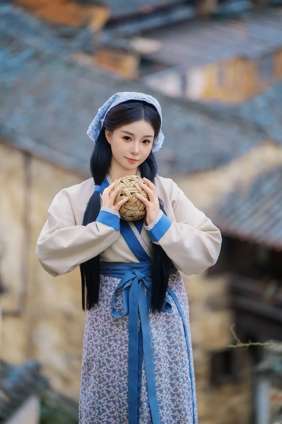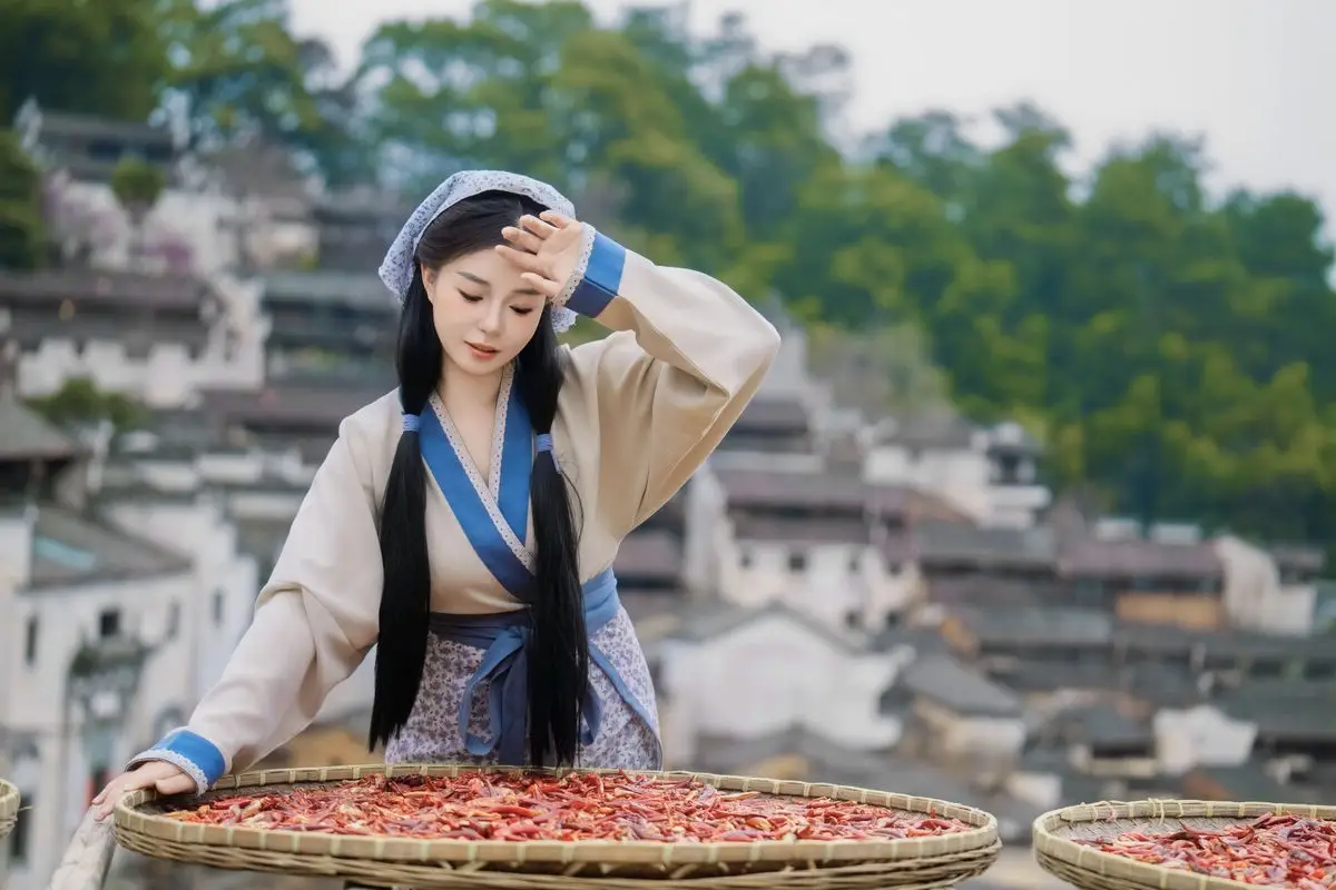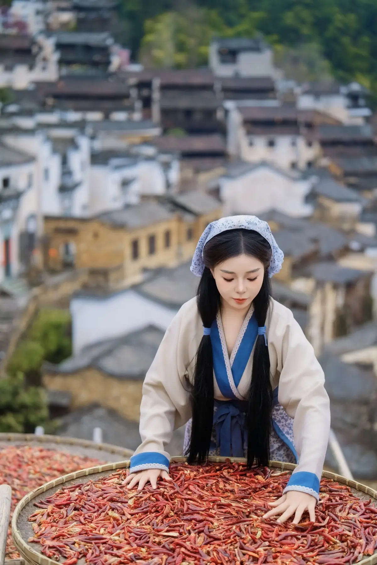 This captivating image showcases Zhang Ying embodying the serene charm of a humble farm girl. Dressed in simple yet elegant traditional attire, complete with a headscarf and light tunic, she diligently tends to drying produce under the golden sun. The tranquil village backdrop, featuring ancient rooftops and lush green hills, accentuates her graceful and contemplative presence. Her thoughtful gaze and the gesture of wiping her brow hint at a life of simple labor and profound meaning. This beautiful snapshot transports viewers to a traditional cultural setting, where human beauty harmonizes seamlessly with nature, evoking a sense of timeless elegance and rustic authenticity.