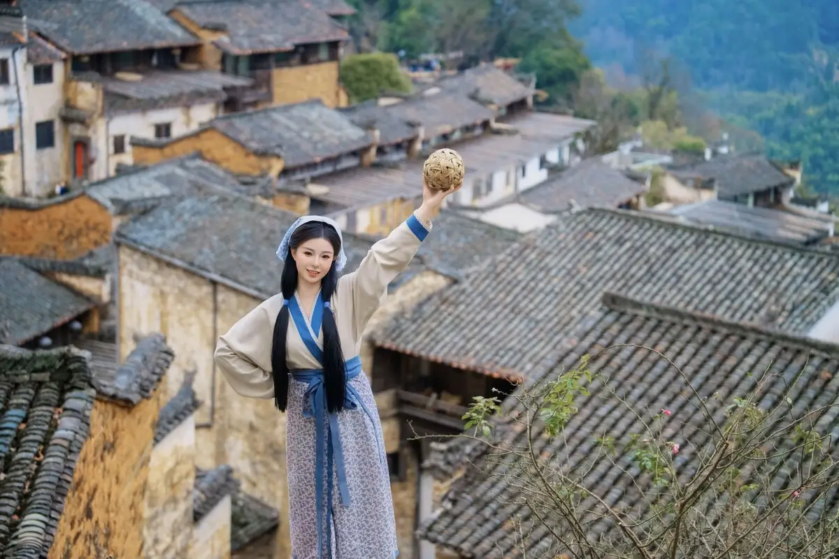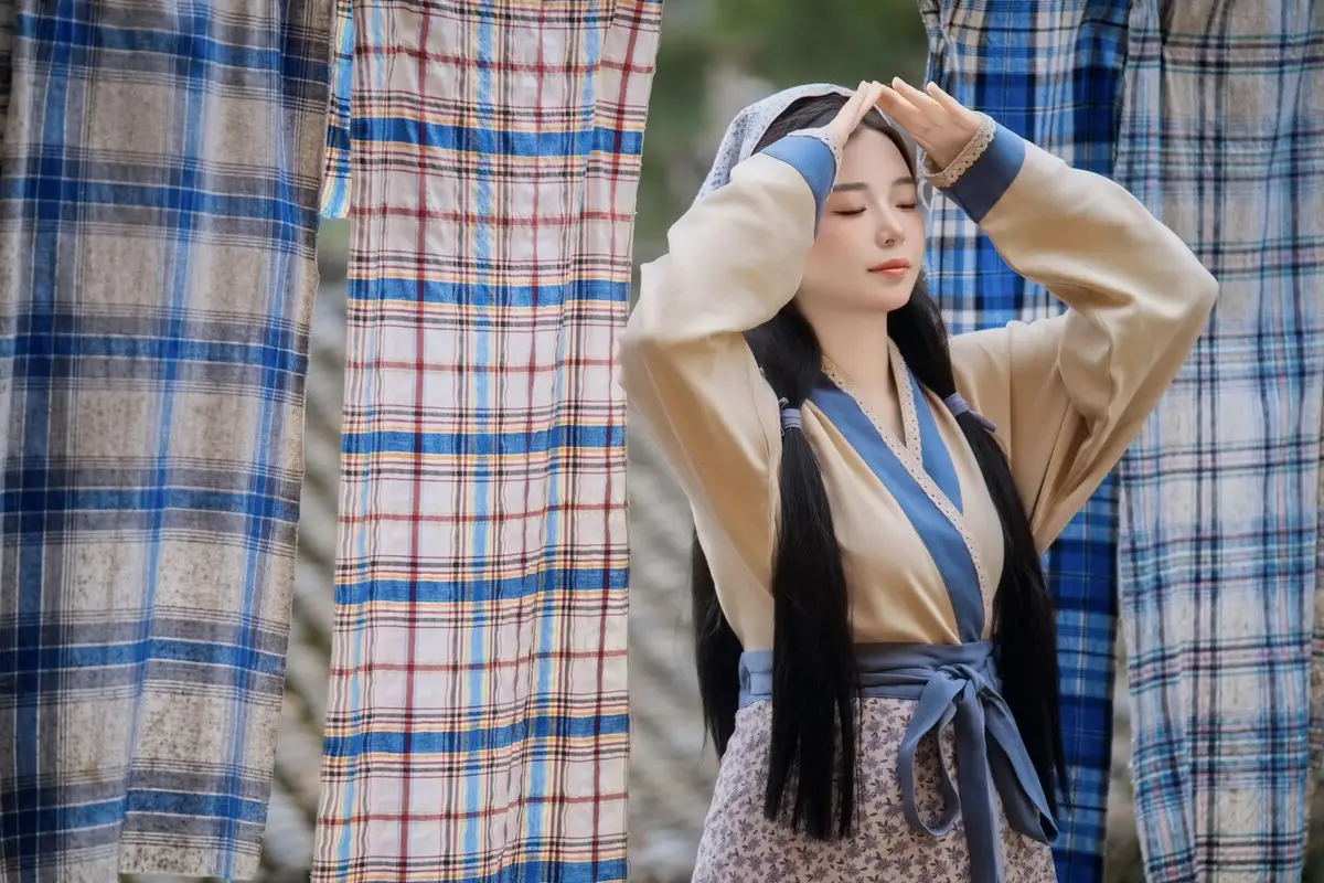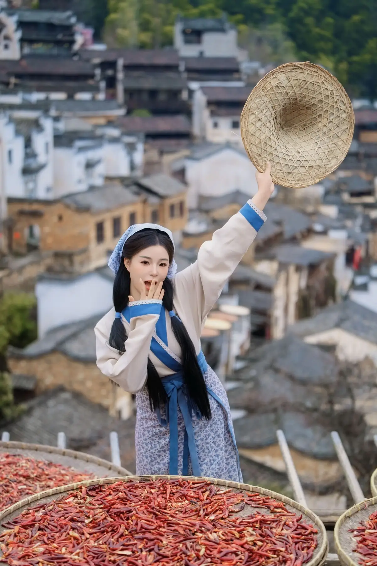 This captivating image showcases Zhang Ying embodying the serene charm of a humble farm girl. Dressed in simple yet elegant traditional attire, complete with a headscarf and light tunic, she diligently tends to drying produce under the golden sun. The tranquil village backdrop, featuring ancient rooftops and lush green hills, accentuates her graceful and contemplative presence. Her thoughtful gaze and the gesture of wiping her brow hint at a life of simple labor and profound meaning. This beautiful snapshot transports viewers to a traditional cultural setting, where human beauty harmonizes seamlessly with nature, evoking a sense of timeless elegance and rustic authenticity.
