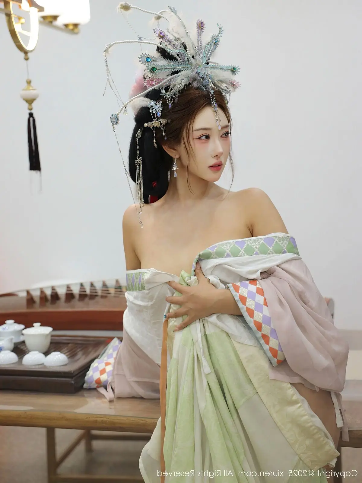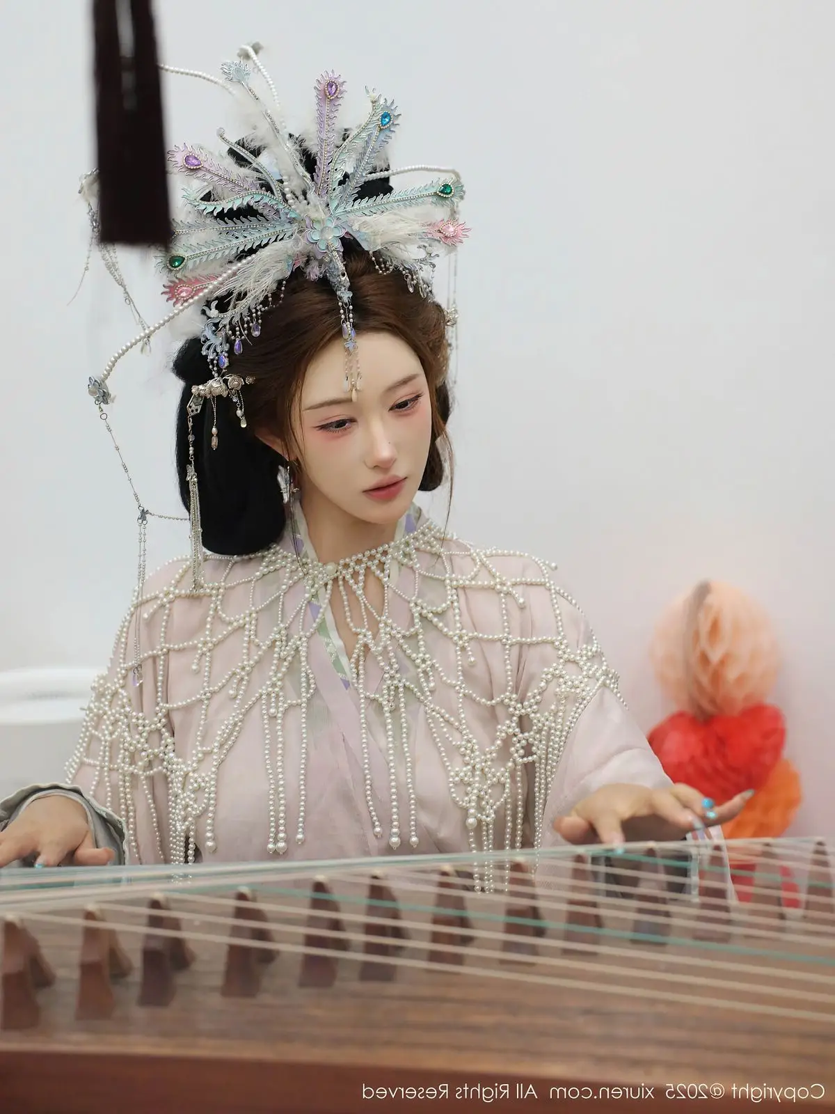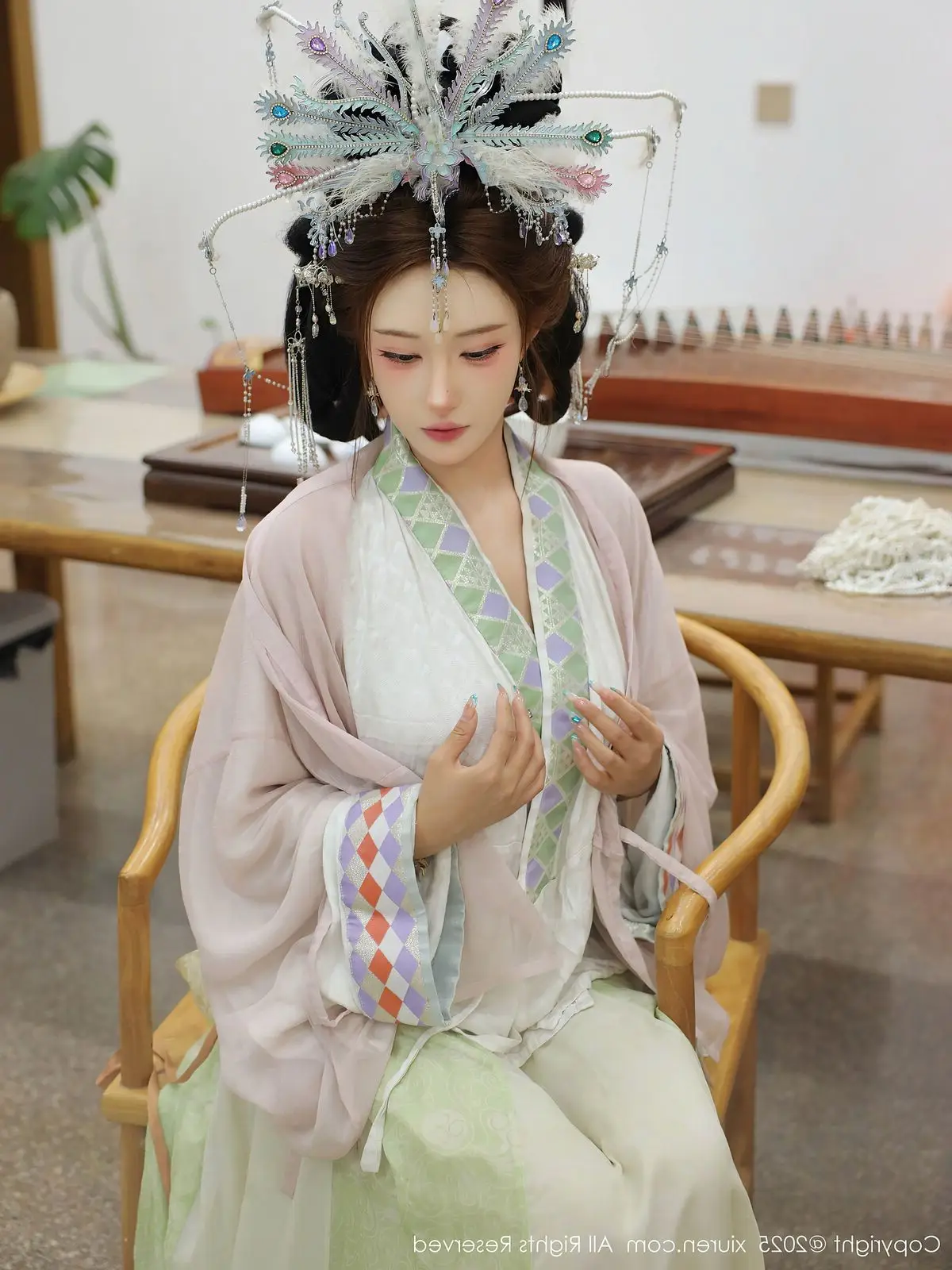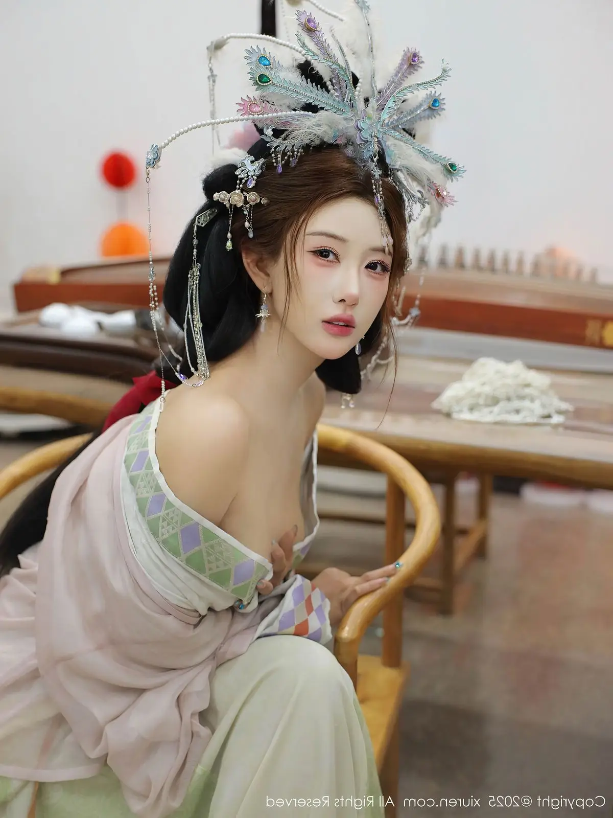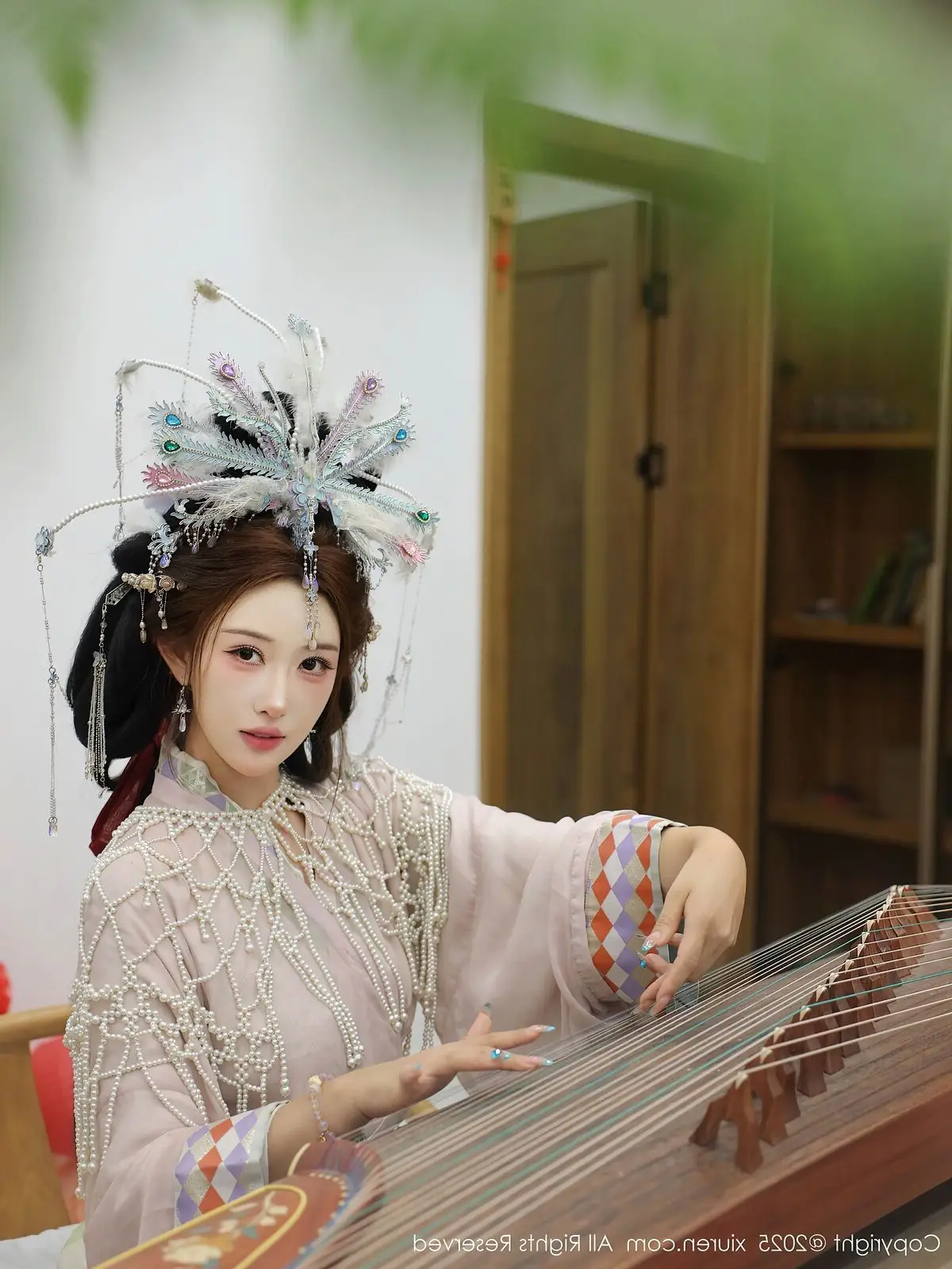 In the XiuRen No.10736 collection, model Li Shuang Er captivates with an enchanting and ethereal presence. She is adorned in exquisite traditional attire, featuring an intricate and graceful headpiece that highlights the classic beauty of an East Asian woman. Her posture while seated beside the Guzheng Chinese zither reveals deep concentration and passion for traditional music. Each finger delicately glides across the strings, weaving melodious tunes that transport viewers into a poetic cultural realm. Li Shuang Er not only showcases her beauty but also conveys the spirit of an artist, a perfect blend of physical elegance and profound artistic soul. This collection is a must-see for admirers of classical beauty and traditional music.