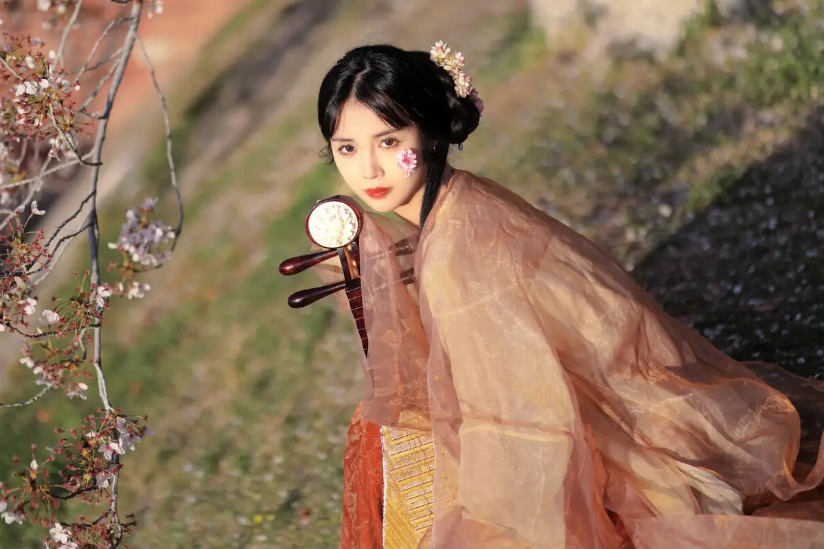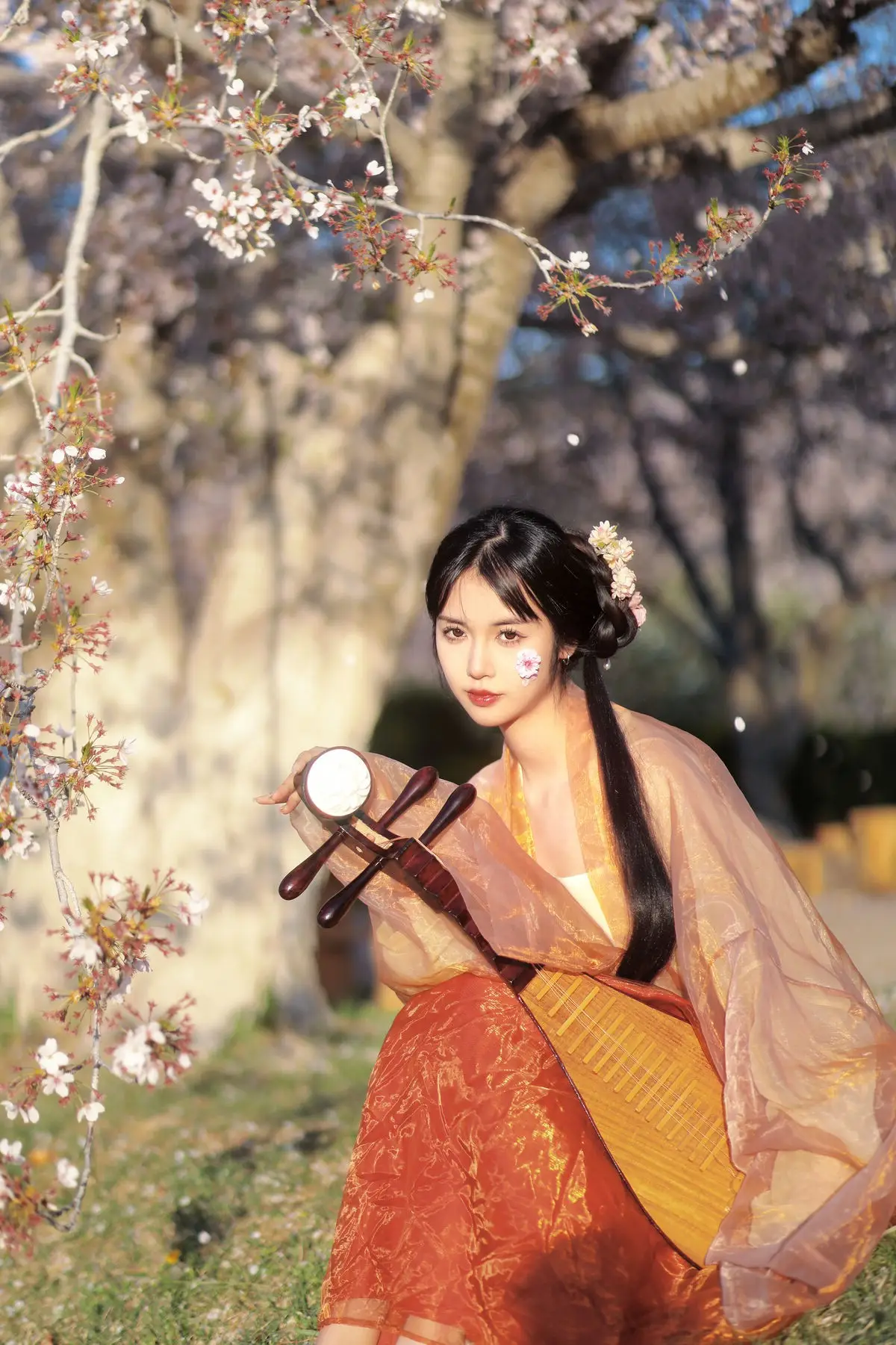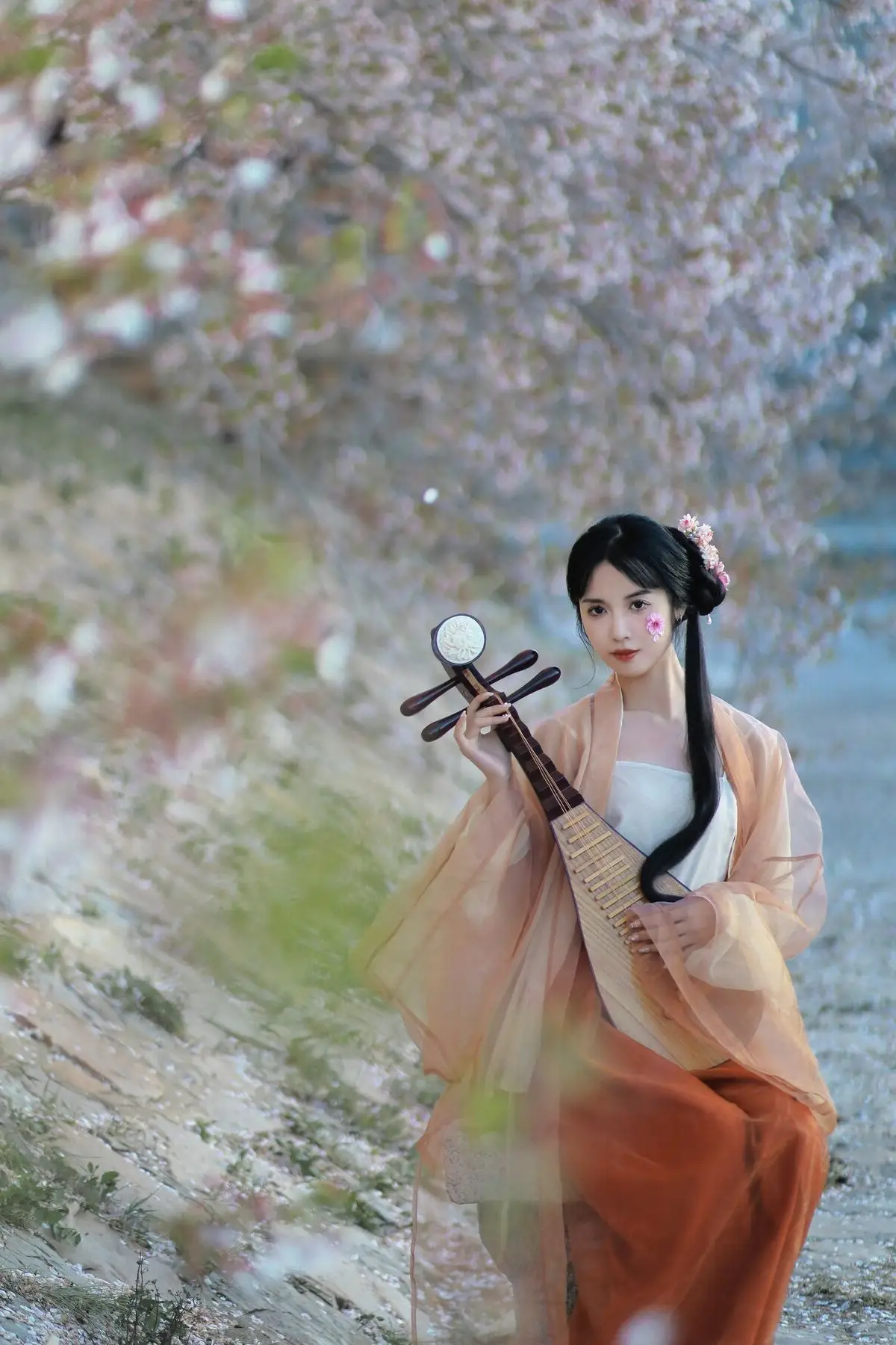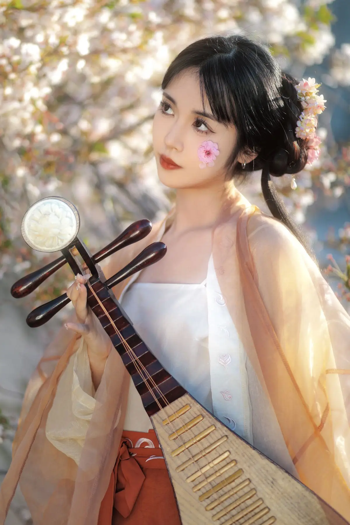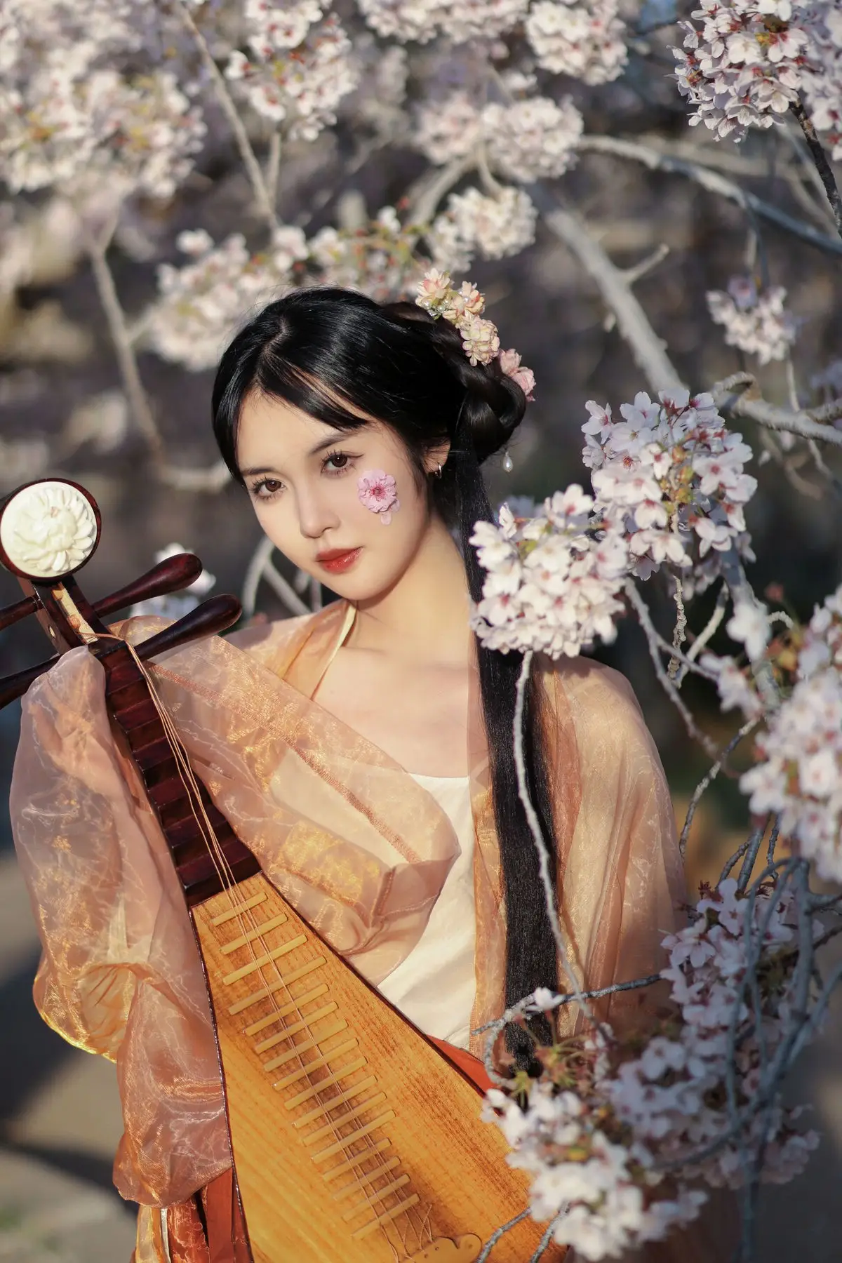 In the YiTuYu Art Language Vol.8617 collection, model Jian Ying Tao Nai emerges as a muse straight from an ancient painting. She gracefully stands beneath blooming cherry blossoms, creating a poetic spring scene. Her traditional attire in warm hues, complemented by an exquisite paper fan, accentuates her delicate beauty and elegant demeanor. A refined face adorned with subtle floral patterns on her cheek and neatly styled dark hair combine to form the image of a classical East Asian beauty. This photograph not only showcases her external allure but also hints at a profound soul, perhaps one who appreciates chess calligraphy or painting as the series intends to convey.