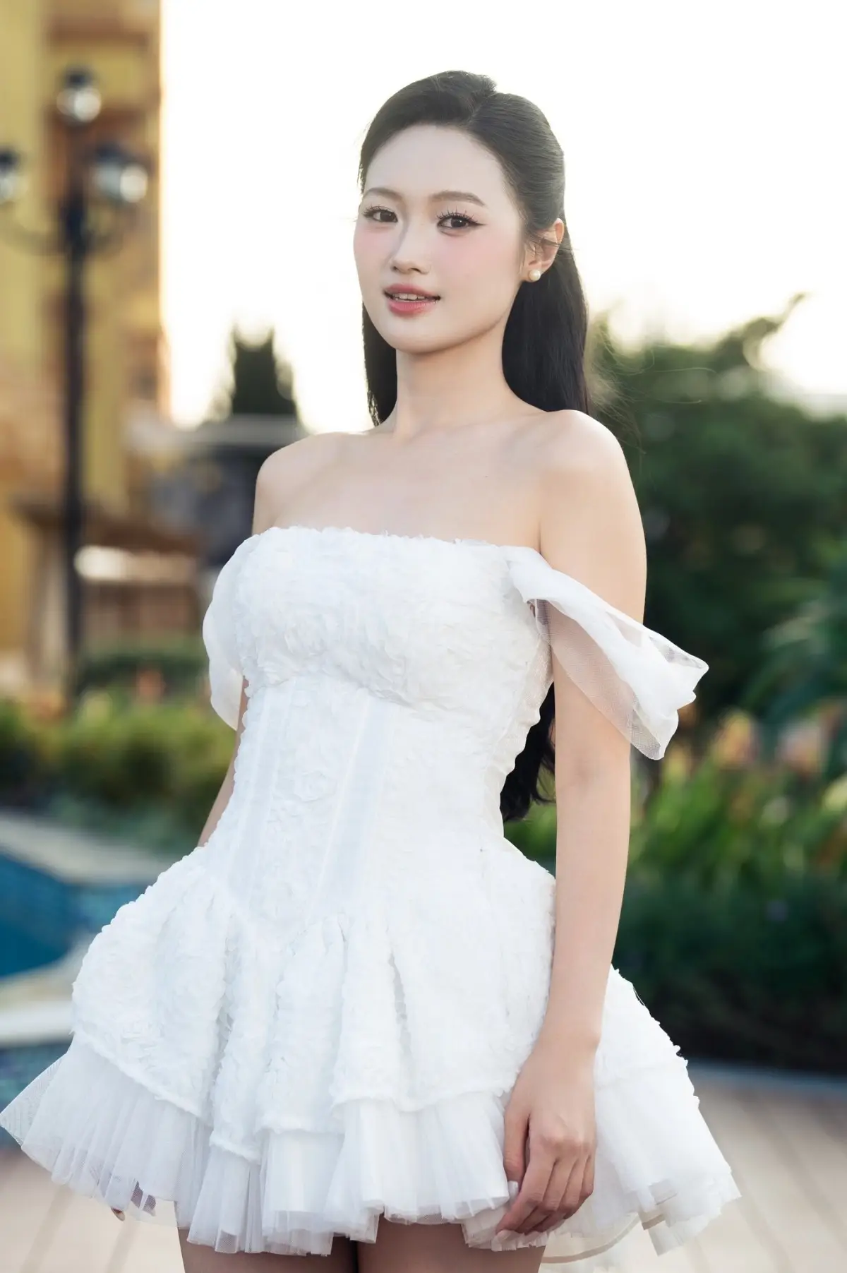 This image captures a moment of pure and graceful charm from a Miss World Vietnam 2025 contestant. With her long, silky black hair, the young woman exudes an elegant and gentle beauty. Her pristine white, off-shoulder dress, adorned with a delicate bow, further accentuates her sophisticated and pure aura. A radiant face and a soft smile convey confidence and the fresh vibrancy characteristic of her early twenties. She represents the talented Gen Z generation, possessing not only striking beauty but also the enthusiasm and aspiration to conquer the coveted crown. She is one of the promising candidates expected to bring many surprises to this prestigious beauty pageant.#MissWorldVietnam2025 #BeautyPageant #VietnameseBeauty #YouthfulGrace #GenZBeauty