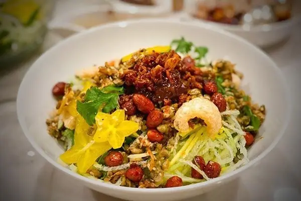 This image beautifully captures a signature dish of Hue cuisine, where the imperial city's cultural essence shines through every flavor. This refreshing, colorful shrimp salad (gỏi tôm) is not just a harmonious blend of fresh shrimp, crispy peanuts, aromatic herbs, and tangy starfruit, but also a testament to the delicate and refined cooking style of Hue people. Each ingredient is meticulously selected, creating a unique and profound culinary experience. This dish embodies the soul of Hue, where flavors narrate stories of the imperial city's rich history and heartfelt spirit.#HueCuisine #HueFood #ImperialCityFood #VietnameseFood #HueSpecialty