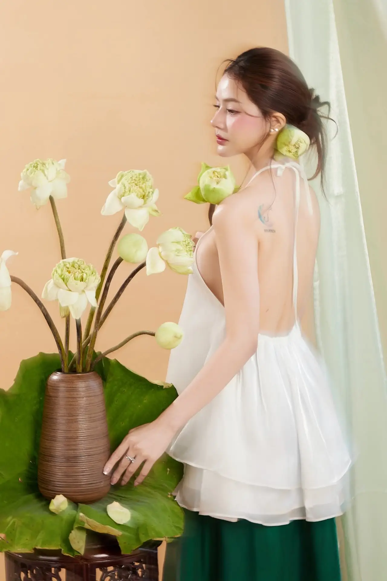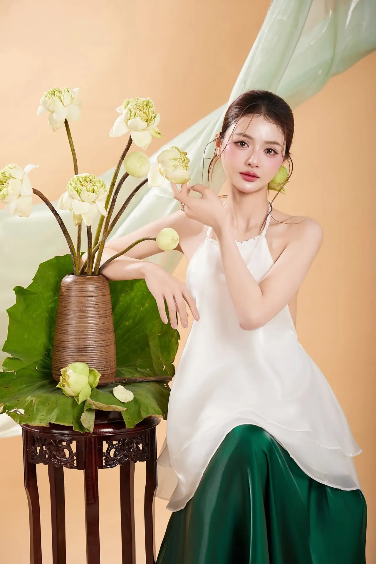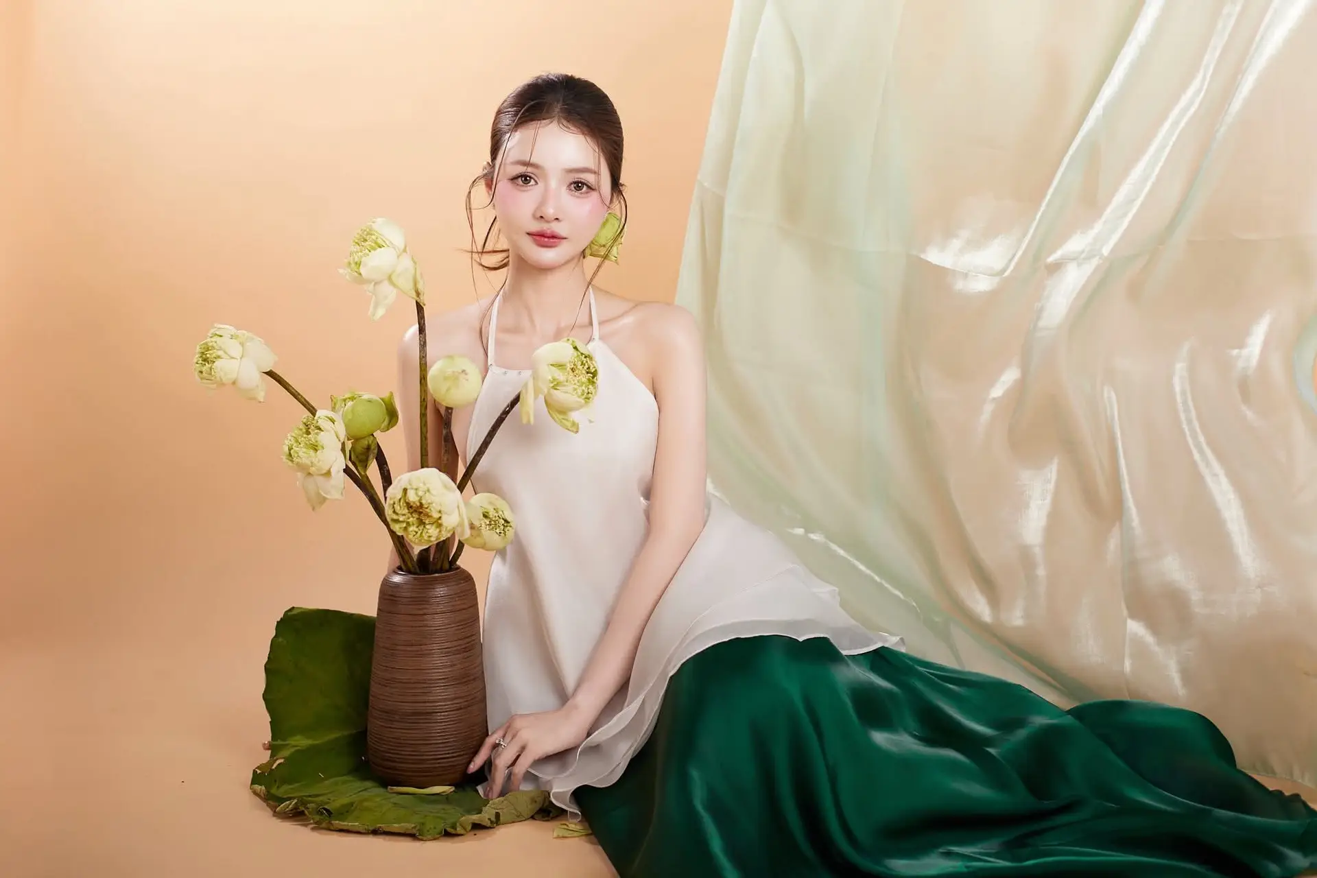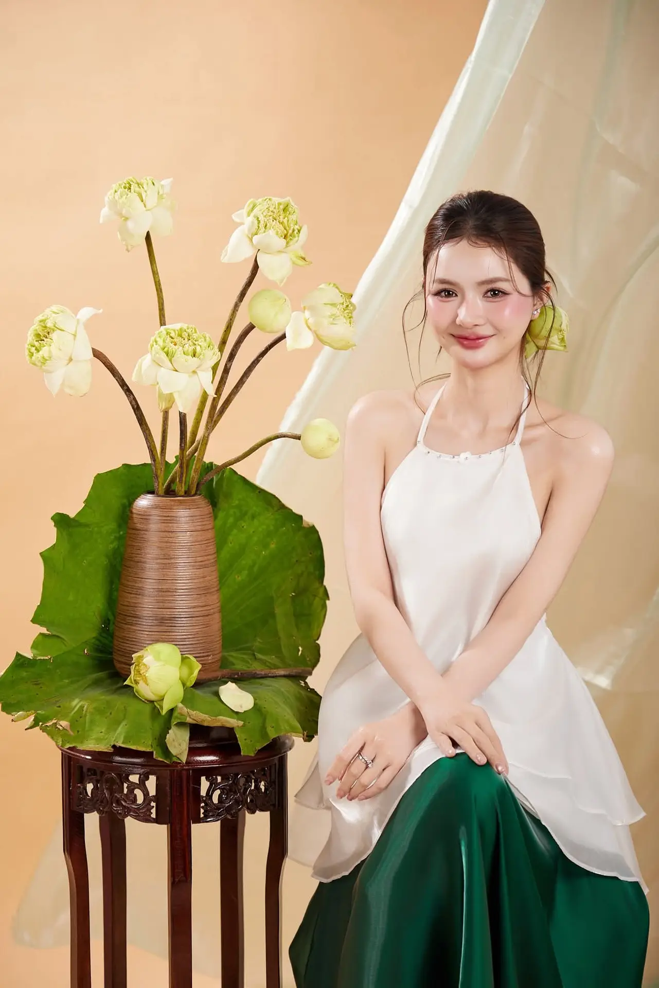 This exquisite photograph beautifully captures a Vietnamese woman embodying graceful and gentle beauty. She wears a sophisticated modernized outfit reminiscent of the traditional áo yếm, with the pure white of her top and the emerald green of her skirt creating a harmonious and captivating ensemble. Beside her stands a vase of blossoming white lotus flowers and delicate lotus buds, symbols of purity and nobility in Vietnamese culture. The woman gently cradles a lotus bud, her gaze dreamy and her demeanor exuding peace and charm. The entire setting is artfully arranged, from the soft flowing silk fabric to the classic wooden stool, all celebrating a blend of traditional and modern aesthetics. This is more than just a photograph; it is an artistic piece that narrates the beauty of the Vietnamese soul, a perfect union of human elegance and nature.#VietnameseBeauty #LotusFlower #ModernAoYem #VietnameseMuse #Elegance