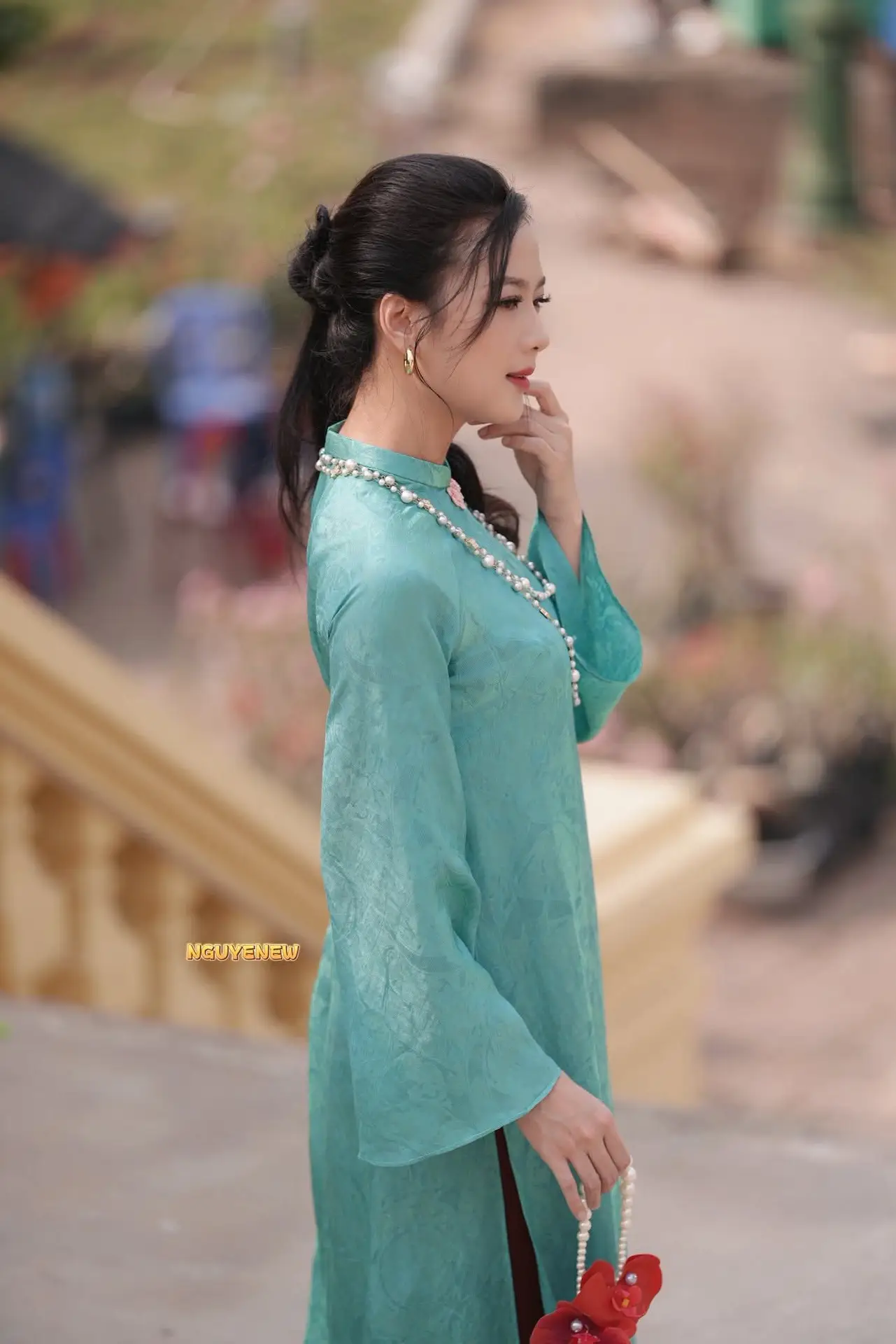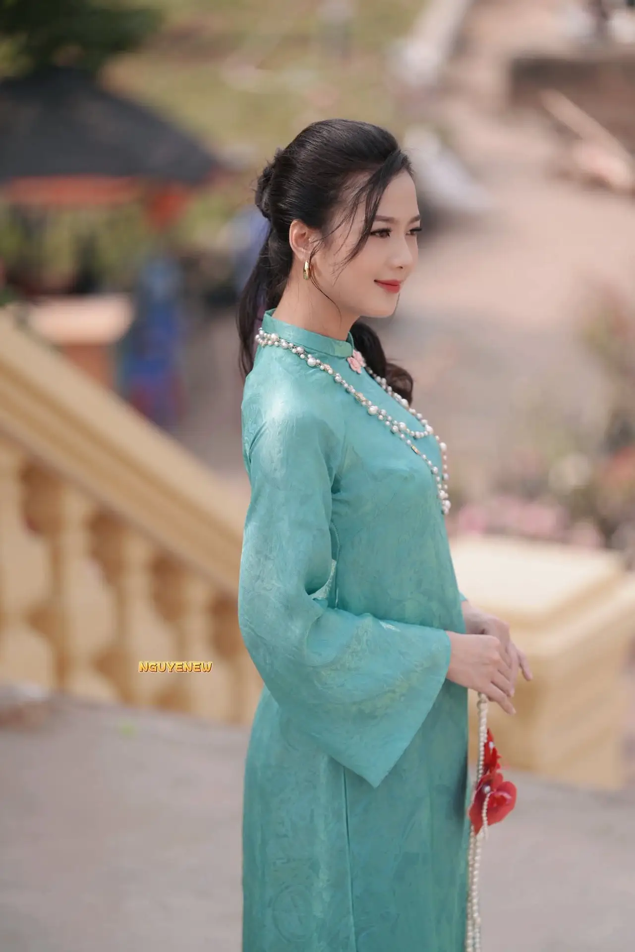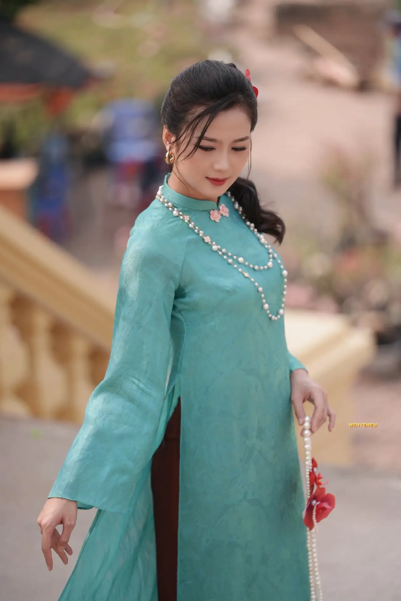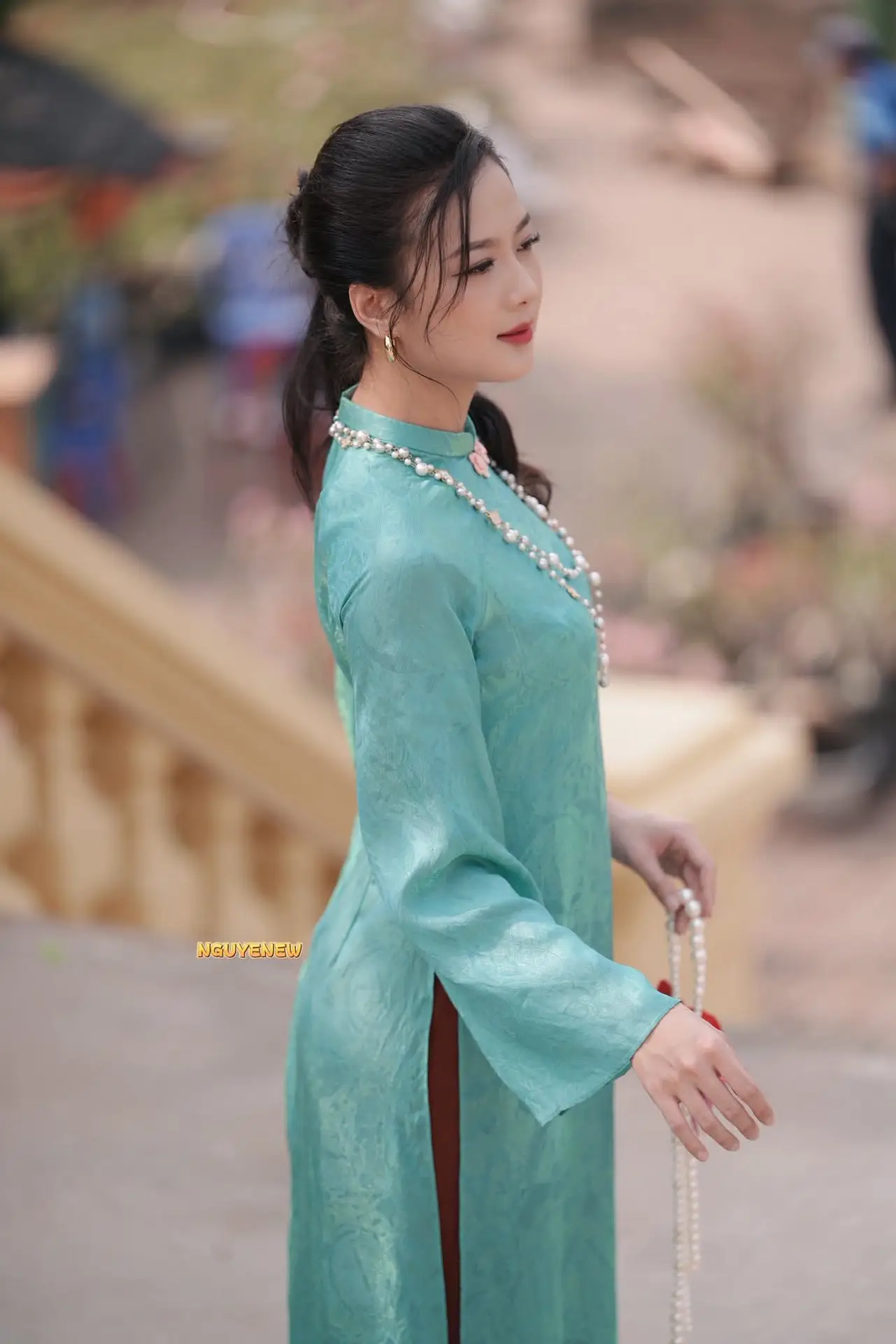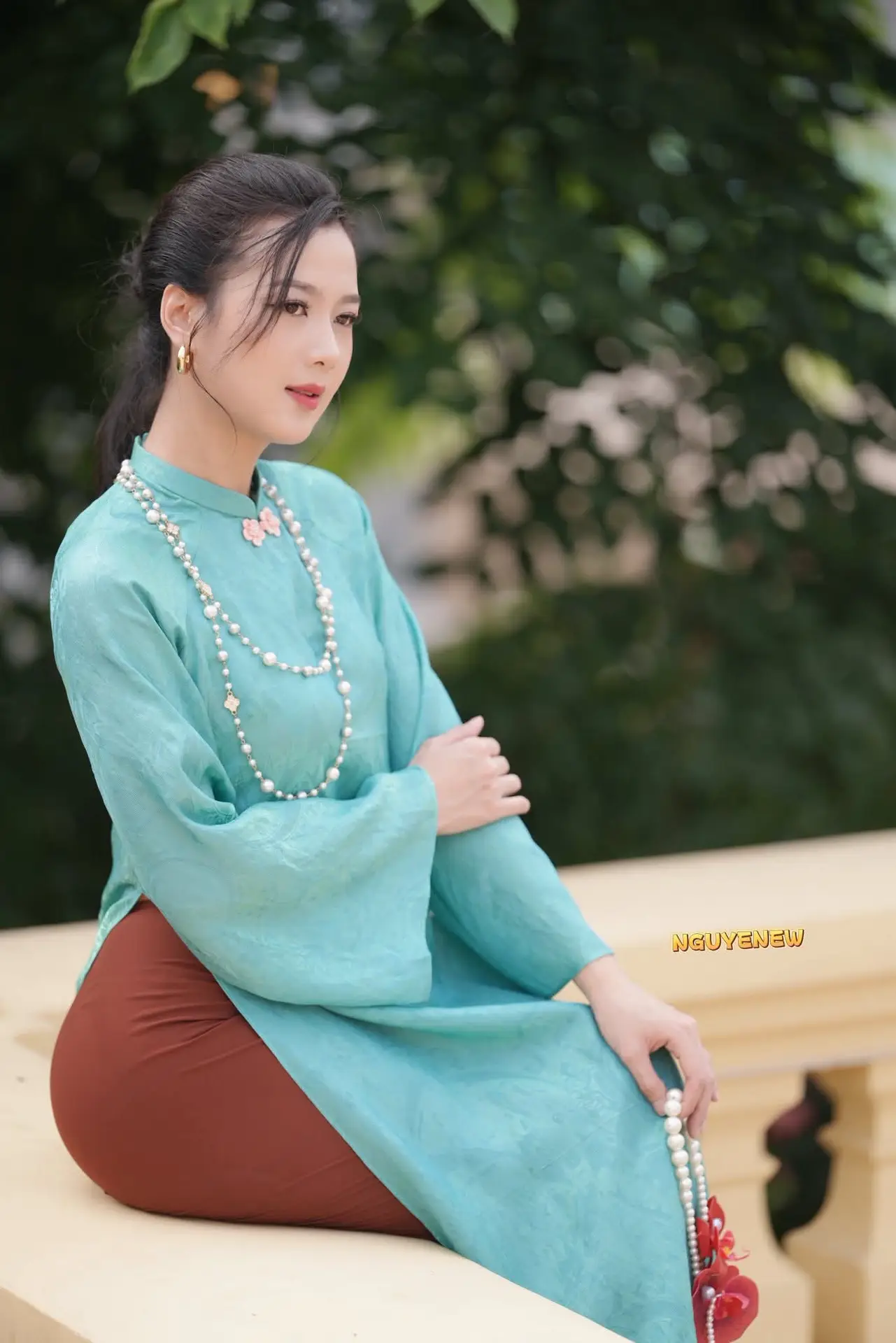 The photograph beautifully captures the ethereal grace of a Vietnamese girl in a refreshing mint green ao dai This classic traditional dress elegantly highlights her slender figure complemented by a long pearl necklace adding a touch of sophistication and nobility Her dreamy eyes and gentle expression exude the distinctive charm and elegance of Vietnamese women The blurred green foliage in the background further accentuates her pure and delicate presence This image perfectly represents traditional beauty and refined grace offering a sense of peace and admiration while showcasing unique cultural fashion#Vietnamese #AoDai #VietnameseBeauty #VietnameseGirl #MintGreenAoDai #VietnameseCulture