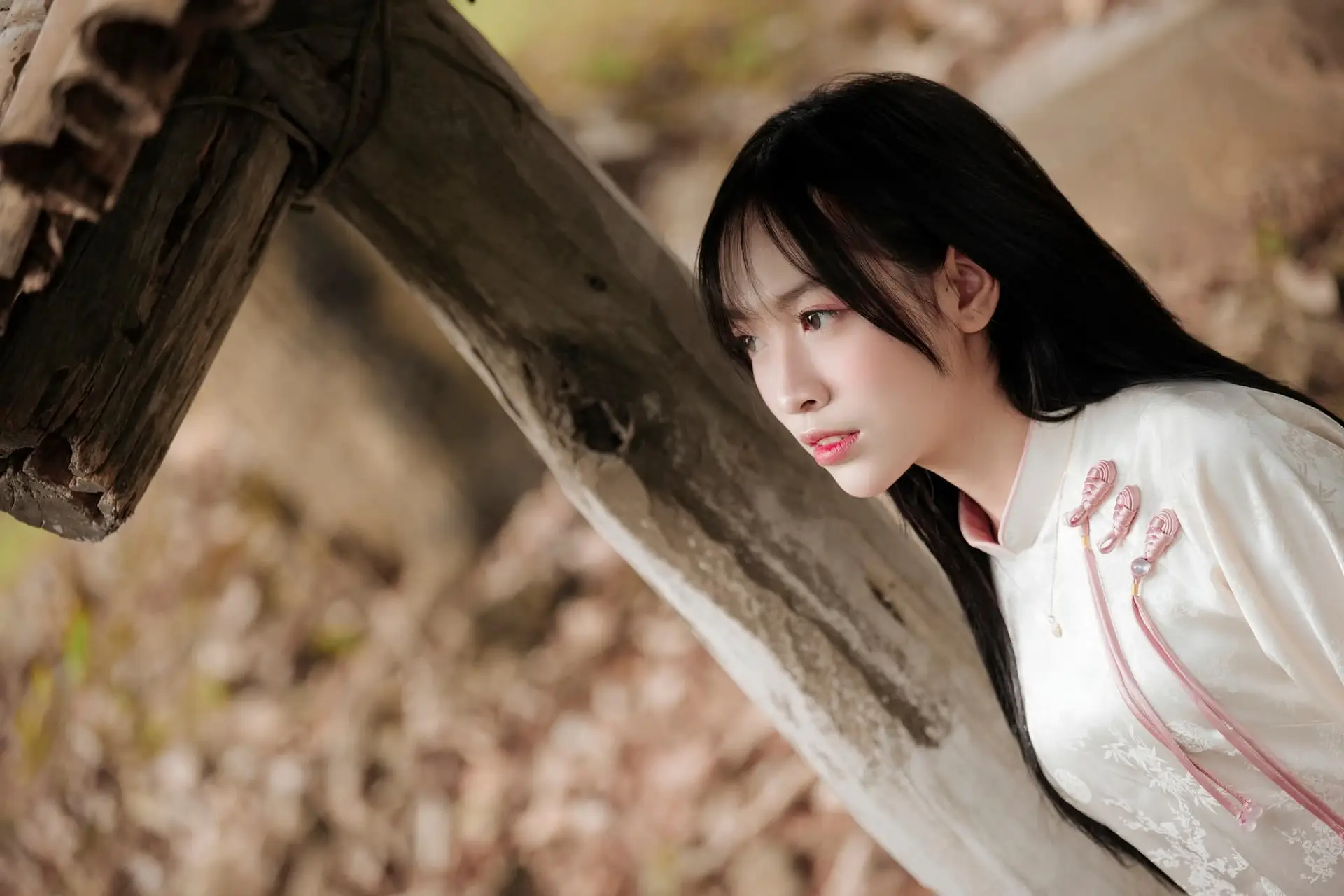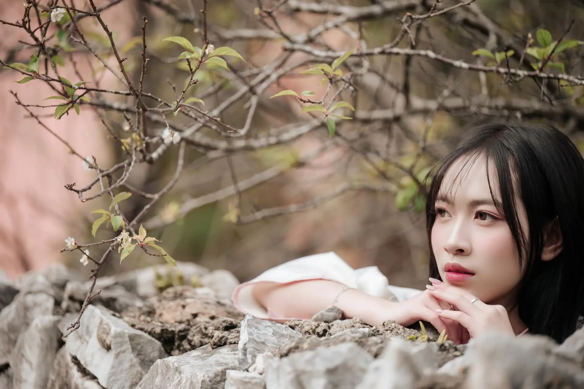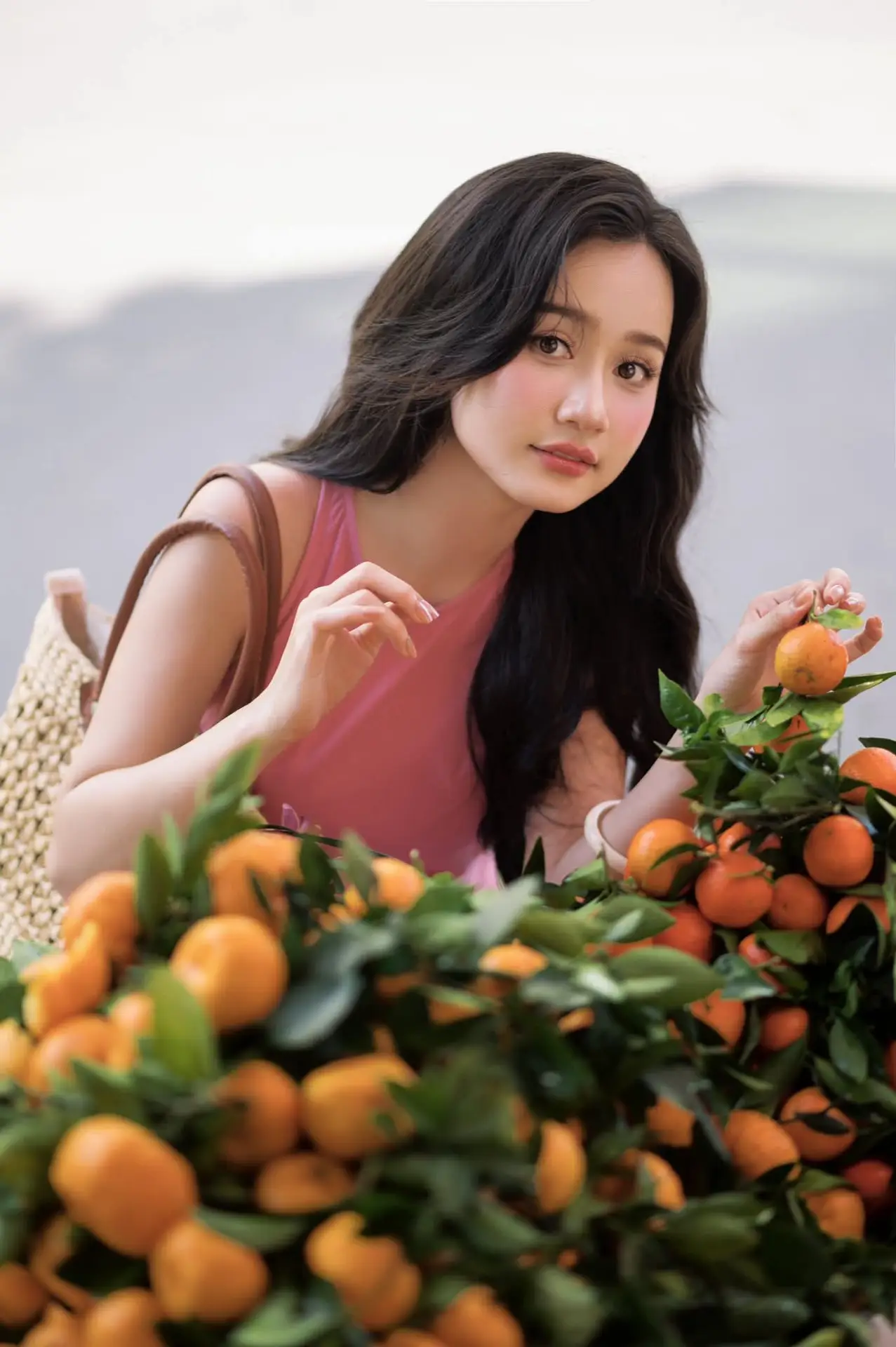 This captivating portrait features a young woman radiating serene beauty, her long dark wavy hair flowing elegantly. She wears a delicate soft pink top, complemented by sheer, flowing light-colored sleeves, enhancing her graceful and refined appearance. Her gaze is directed gently upwards and away, hinting at a thoughtful, dreamy introspection, as if lost in a moment of quiet contemplation. Her fair complexion, subtle makeup, and gentle expression highlight her natural, pure charm. It is a moment of calm depth, evoking peace and poetic beauty, a truly moving image.#VietnameseBeauty #LongHairGoals #PinkFashion #PortraitPhotography #GracefulWoman