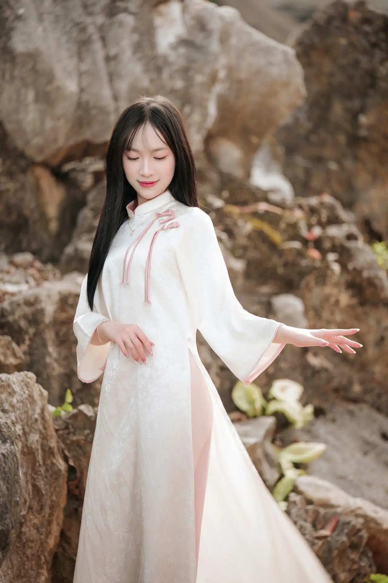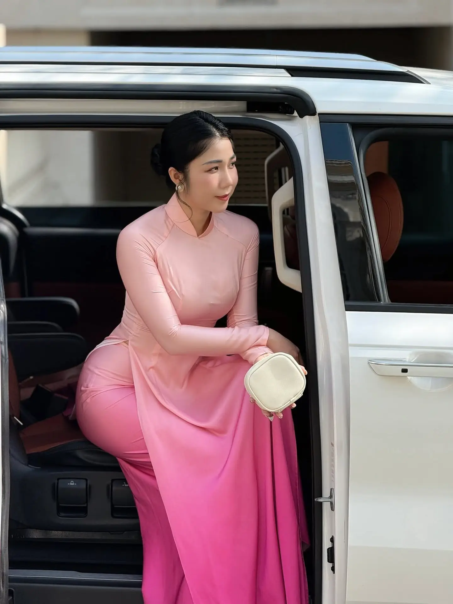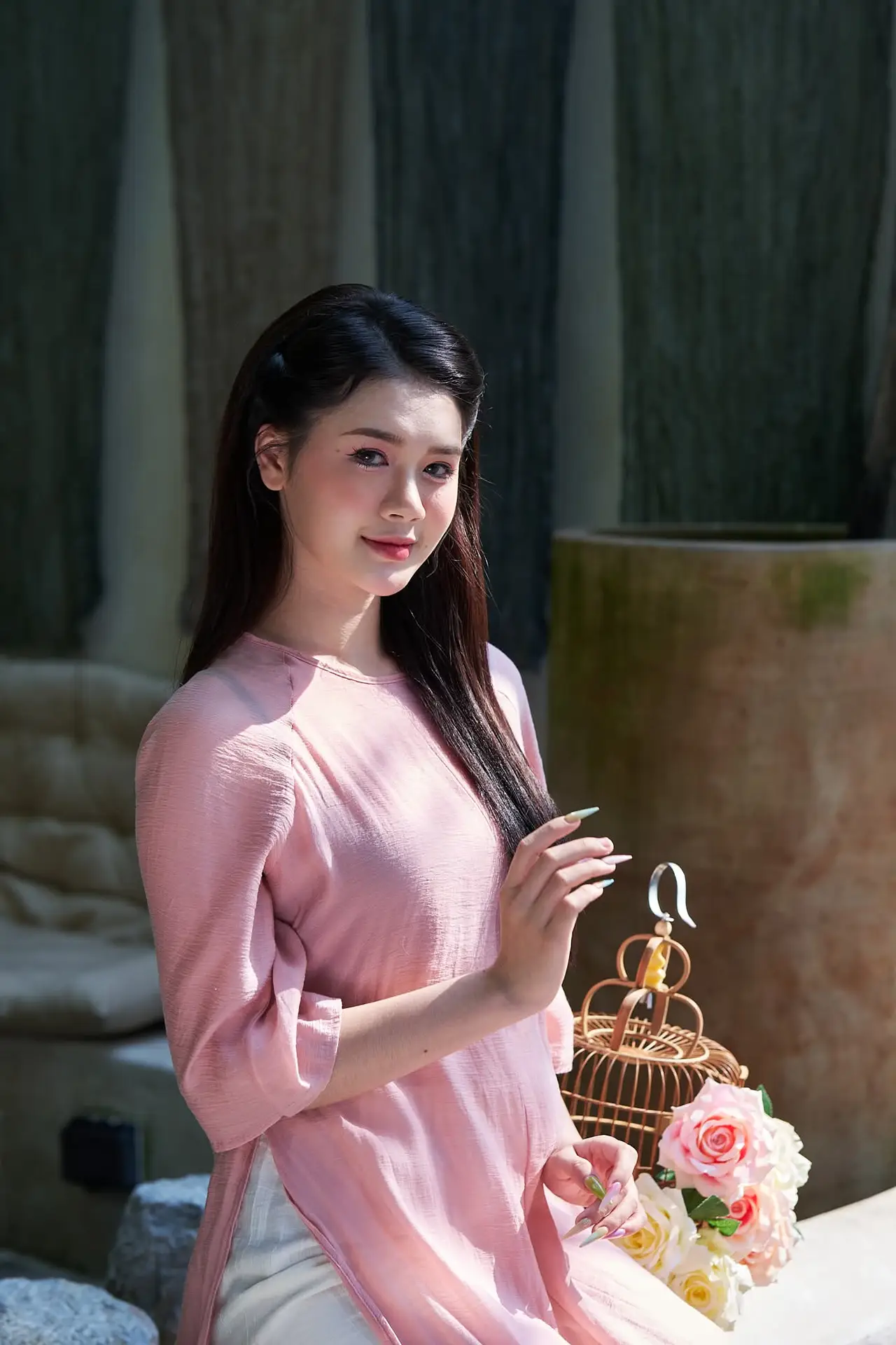 This stunning photograph captures a graceful Vietnamese woman adorned in a traditional pink ao dai. With lustrous black hair and a gently made-up face, she radiates an elegant and gentle beauty characteristic of East Asian women. The fitted ao dai subtly accentuates her delicate curves, highlighting her innate grace and charm. This moment not only celebrates physical beauty but also conveys a deep sense of traditional culture. She embodies the confidence and subtle allure of Vietnamese women navigating modern life while steadfastly preserving their unique cultural identity.#PinkAoDai #VietnameseBeauty #VietnameseWoman #ElegantStyle #TraditionalAttire