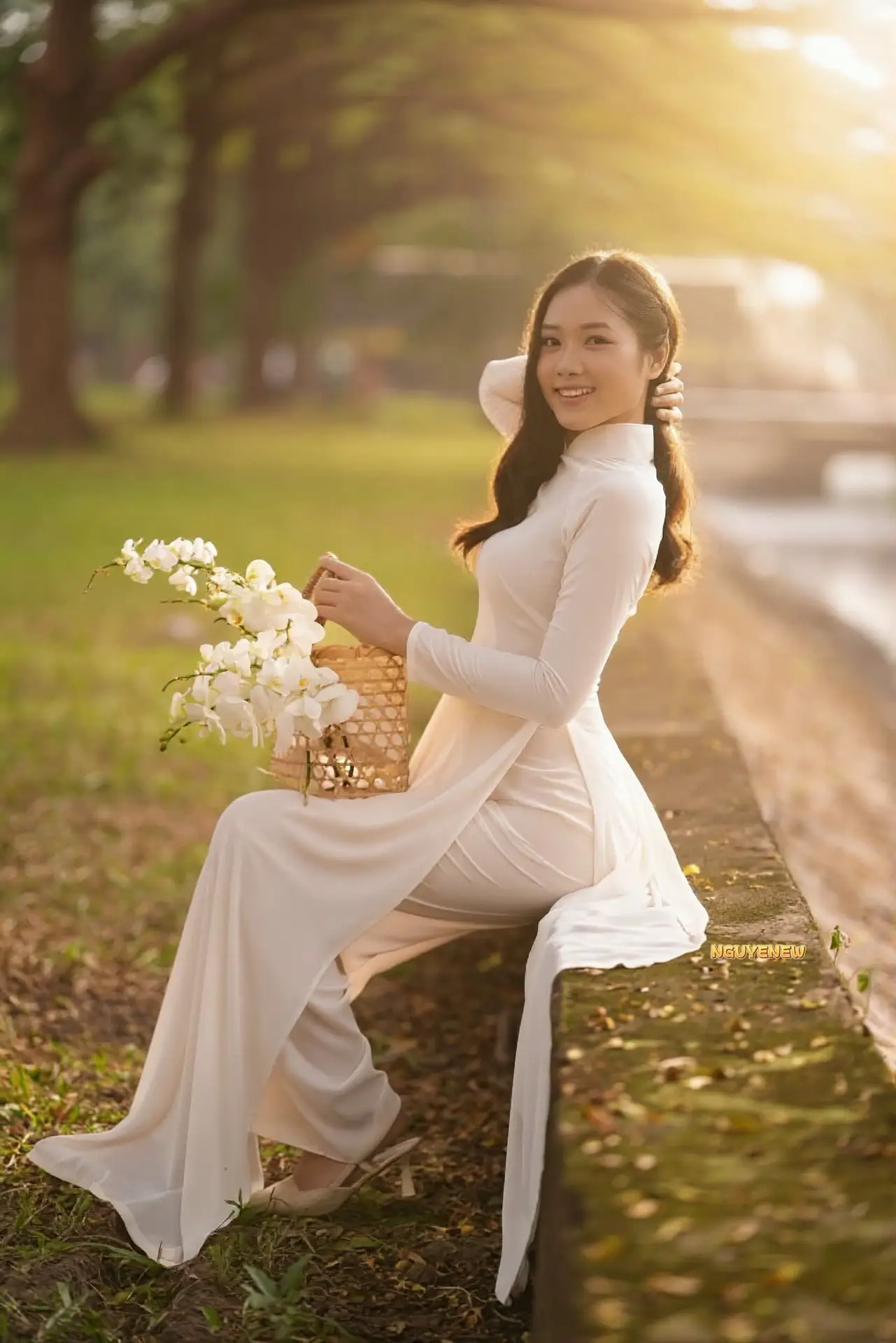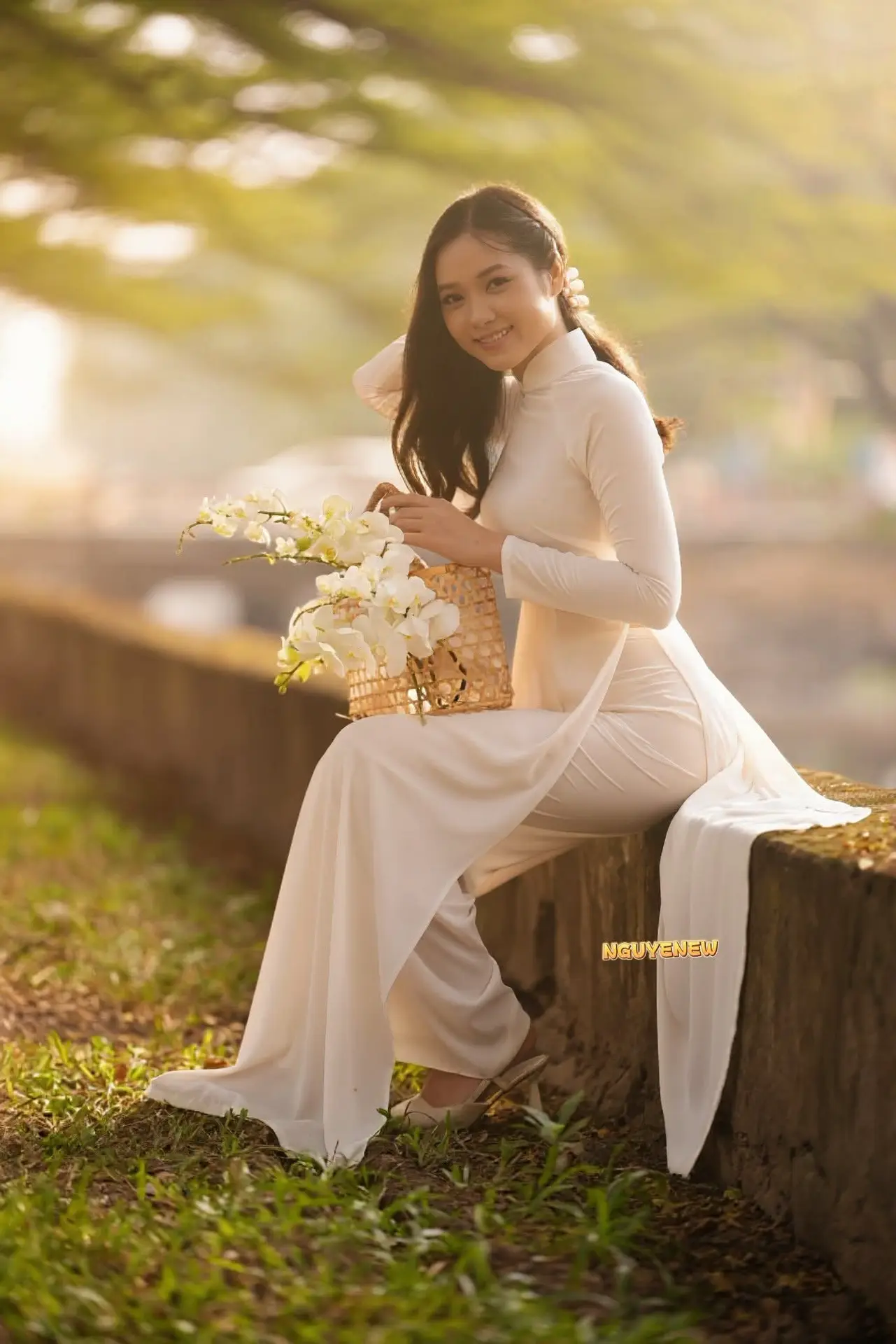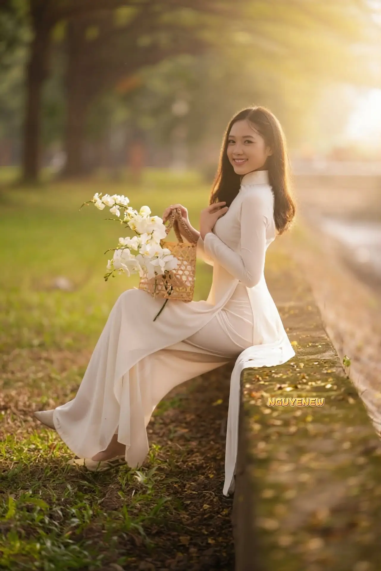 A beautiful Vietnamese girl in a pristine white Ao Dai sits gracefully by a tranquil lakeside as the golden hour sun casts a warm glow upon her Her gentle smile radiates peace and charm illuminating the entire scene She holds a delicate basket of white flowers enhancing her elegant and graceful presence This photograph beautifully captures the timeless traditional beauty of Vietnamese women The harmonious blend of traditional attire and natural landscape creates a truly serene and poetic moment Viewers can feel the purity and subtle charm of Vietnamese culture This image symbolizes enduring beauty and the grace of the Vietnamese spirit a moment of quiet reflection and deep emotion amidst natures splendor#WhiteAoDai #VietnameseBeauty #GoldenHour #VietnameseGirl #VietnamCulture
