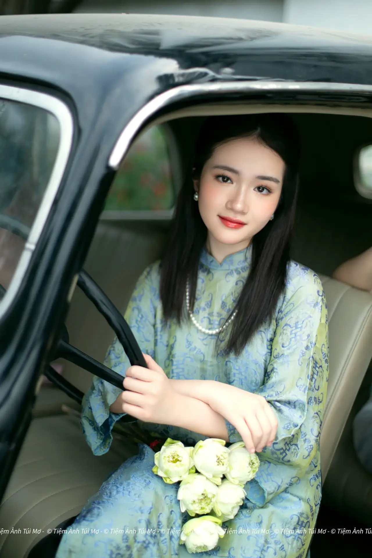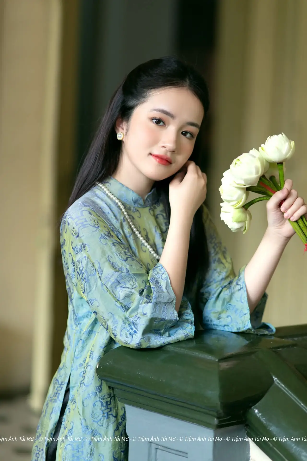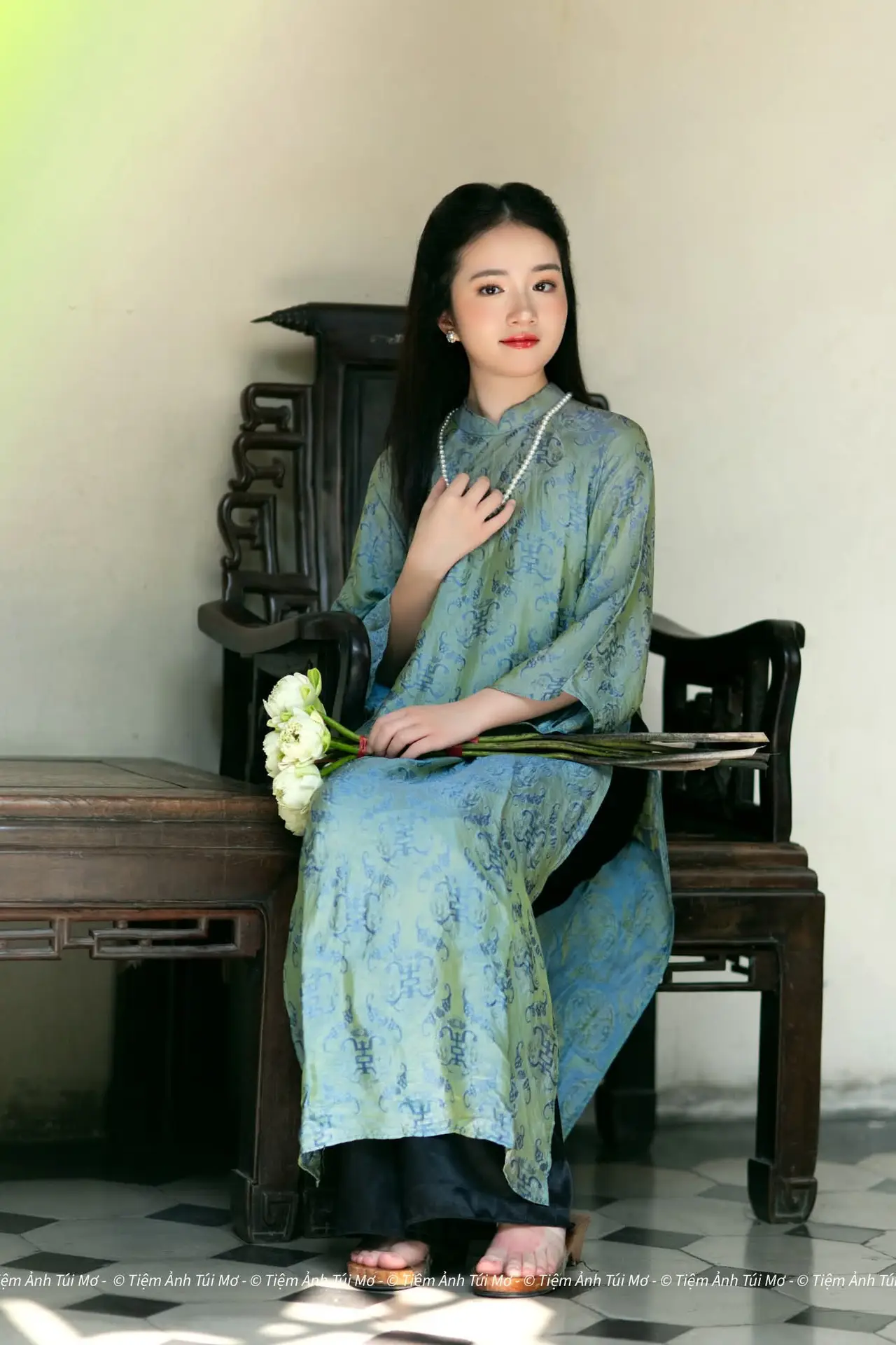 This stunning photograph captures the gentle and elegant beauty of a Vietnamese young woman dressed in a traditional ao dai. The lady exudes grace with her long flowing dark hair and a soft, serene smile. Her exquisite teal ao dai featuring intricate patterns not only enhances her slender figure but also reflects the sophistication of Vietnamese culture. A delicate pearl necklace and a bouquet of white flowers held in her hand further elevate her pure and noble charm. Seated on a classic carved wooden chair, her image evokes timeless traditional values. This portrayal symbolizes the graceful East Asian aesthetic and the enduring elegance of Vietnamese women across generations.#Vietnamese #AoDai #VietnameseBeauty #TraditionalAoDai #VietnameseCulture #AsianElegance #PrettyGrils