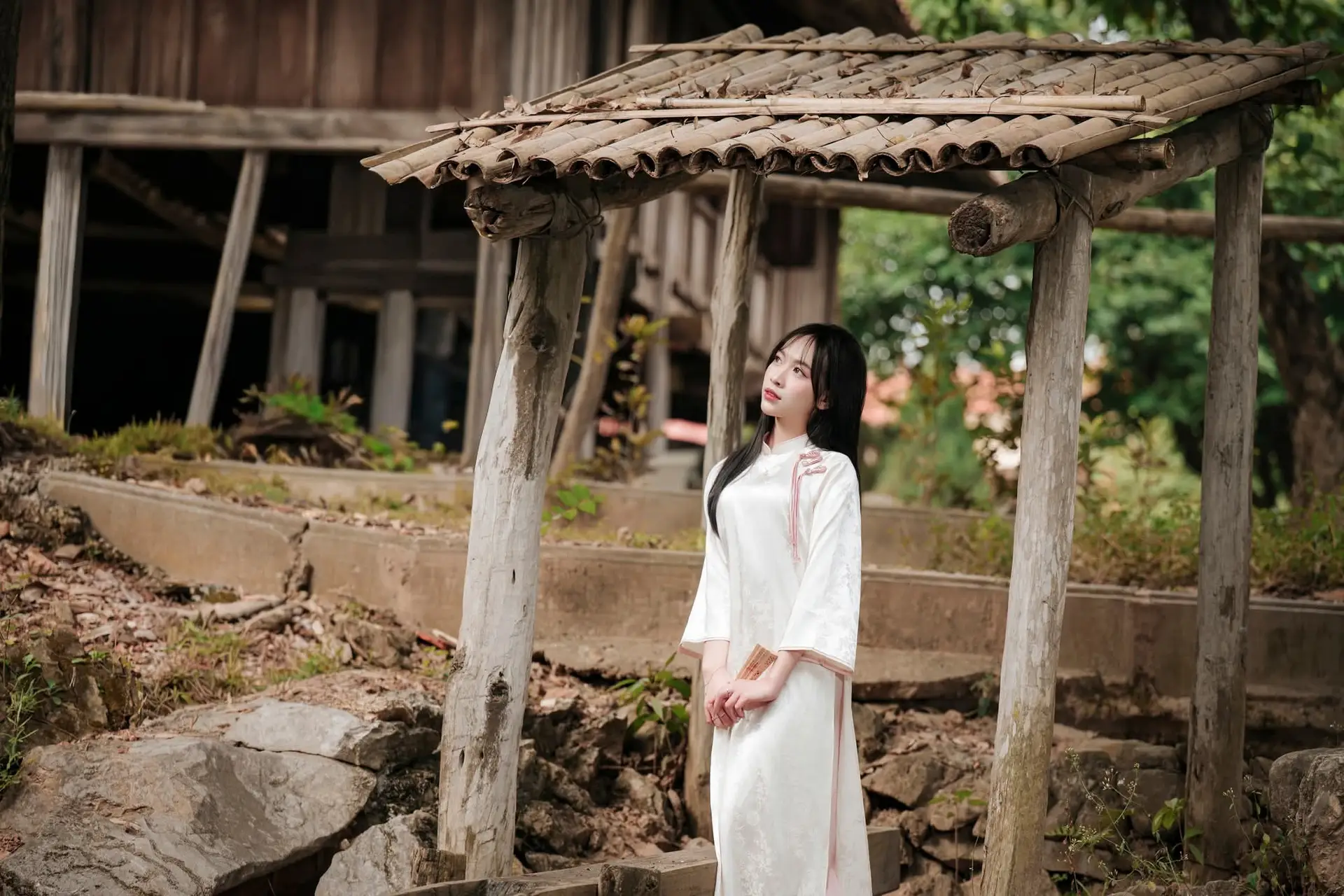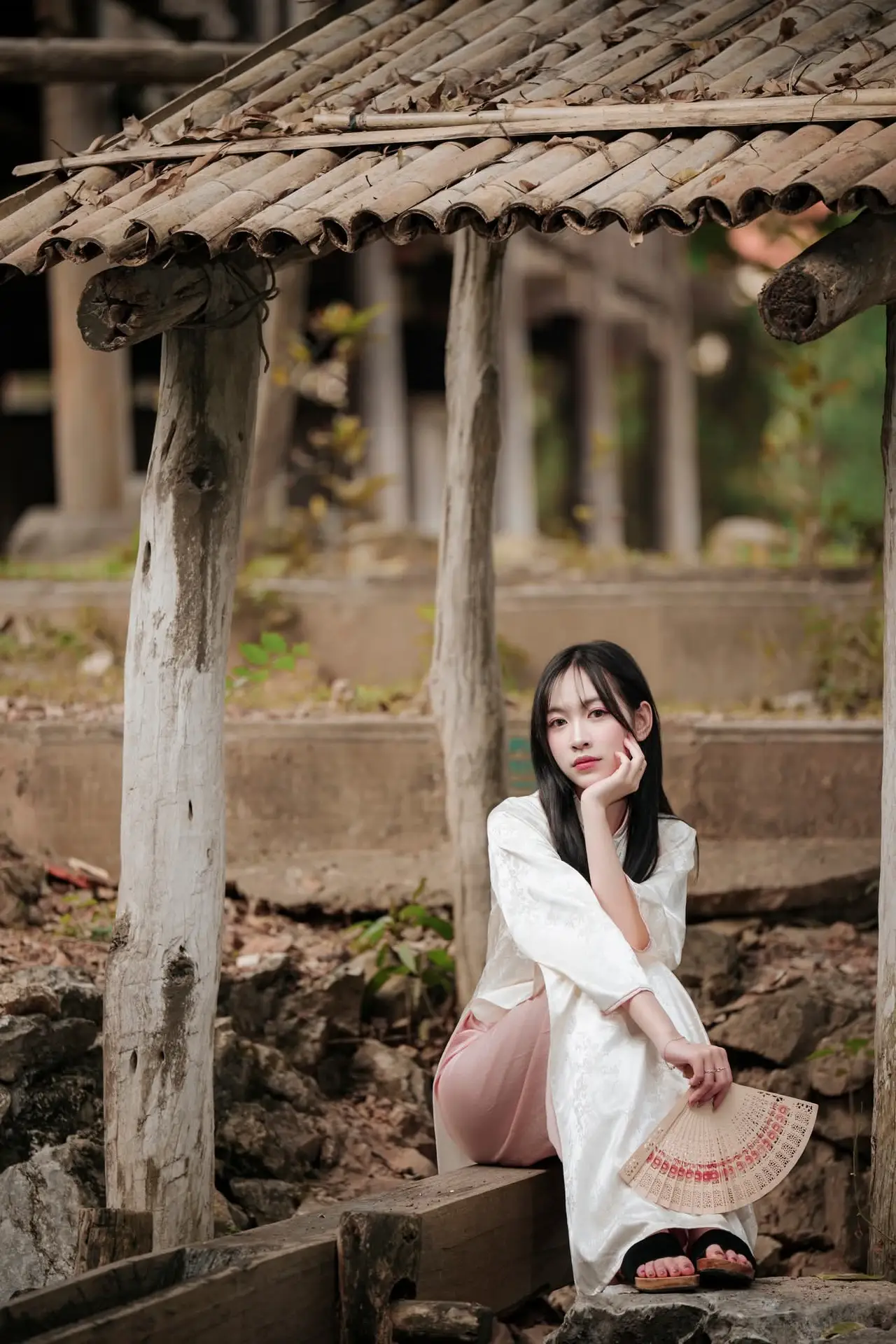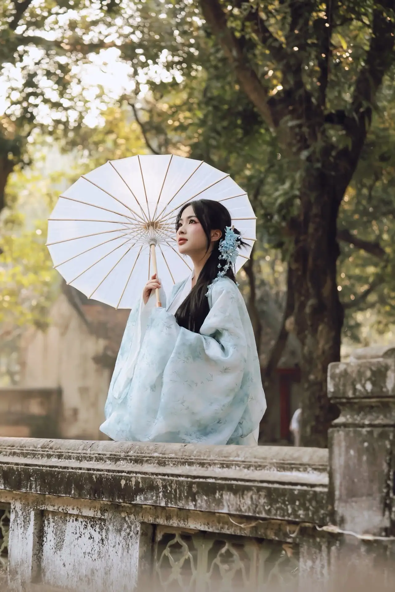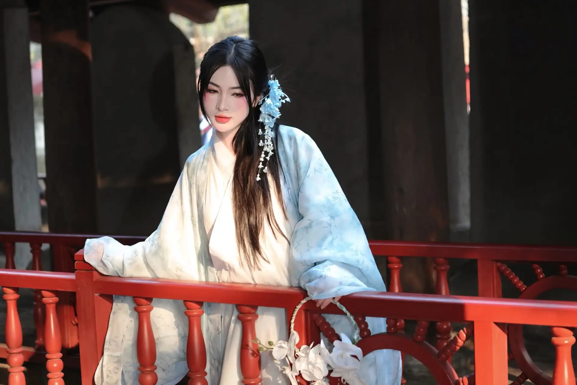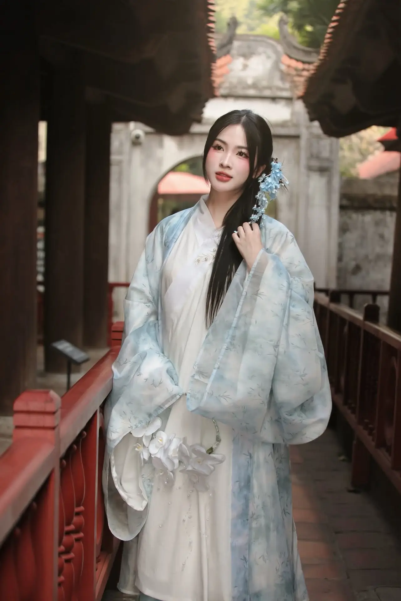 This captivating image features a young Vietnamese woman exuding gentle elegance and grace adorned in a sophisticated traditional costume of delicate blue and white hues. The attire a modern interpretation of ancient styles beautifully highlights her serene East Asian charm. Posed within the solemn embrace of ancient architecture possibly a revered temple or pagoda her figure leaning against a vibrant red railing creates a remarkably harmonious scene. Her contemplative gaze and the subtle floral hair accessory enhance the romantic and tranquil atmosphere. More than just a beautiful photograph it is a refined blend of human beauty and cultural heritage reminding us of the enduring value of tradition in contemporary life and evoking a sense of nostalgia and peace.#VietnameseBeauty #TraditionalAttire #AncientArchitecture #CulturalHeritage #AsianFashion