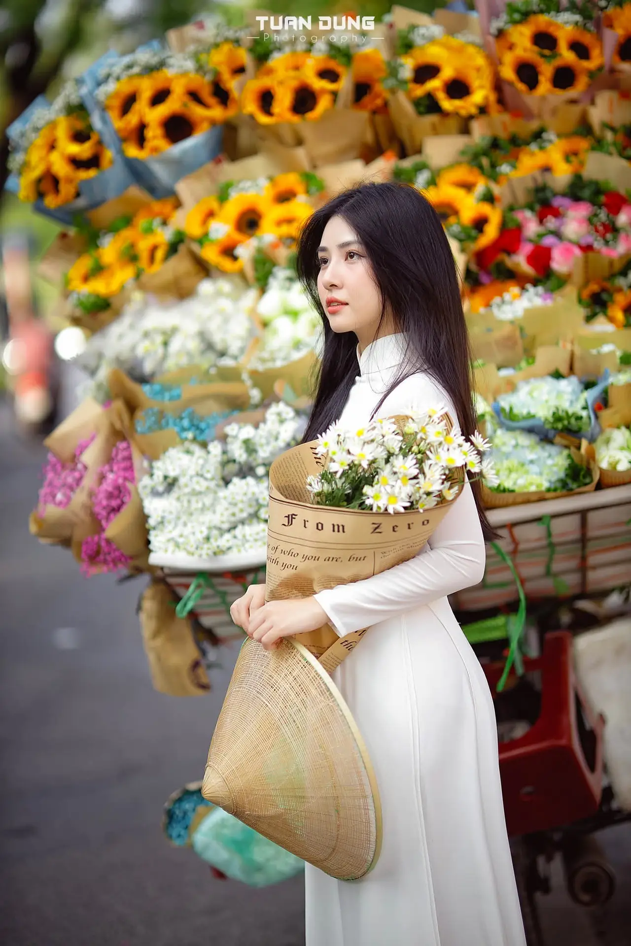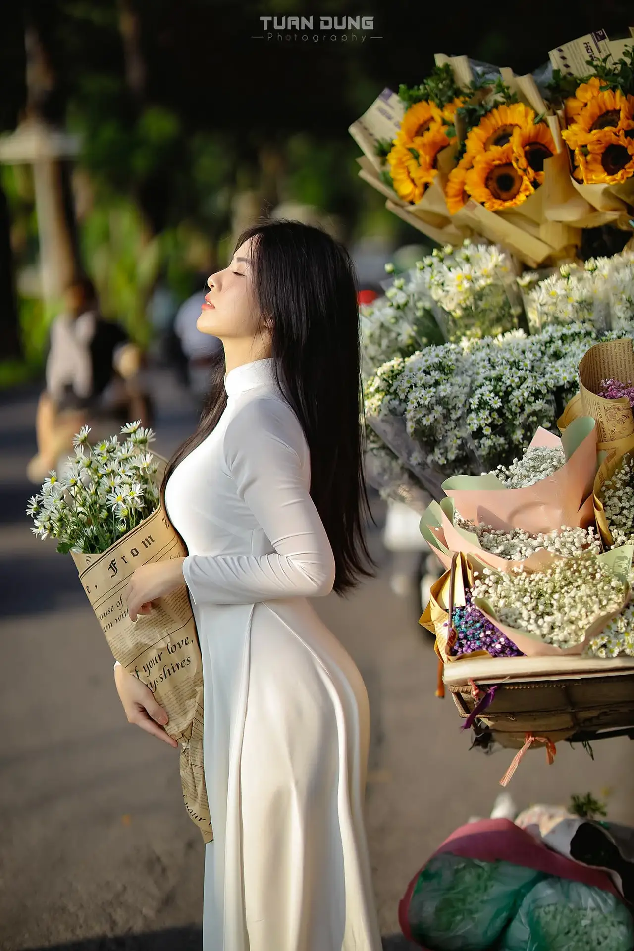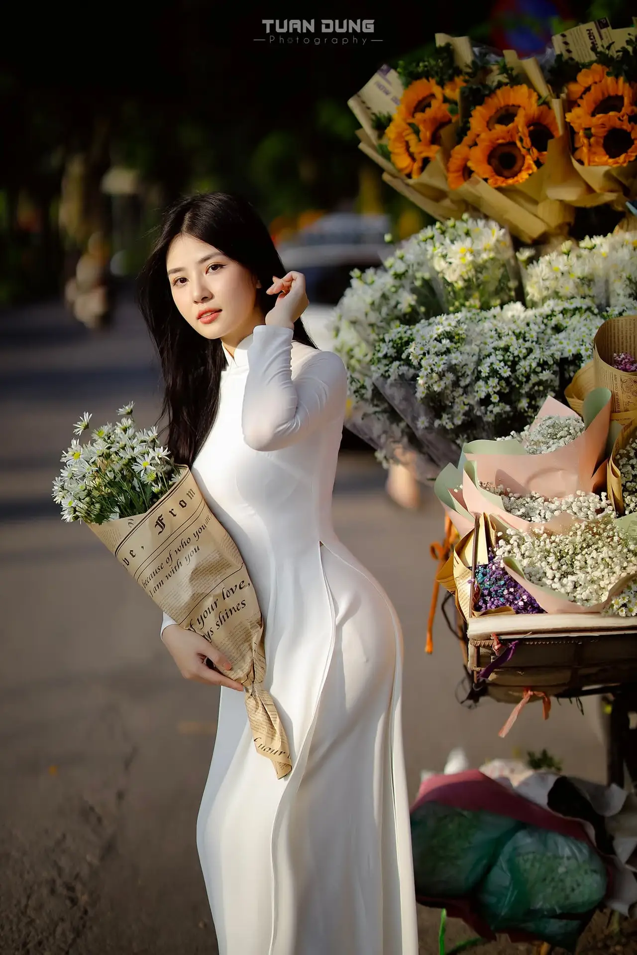 This captivating photograph portrays a Vietnamese young woman exuding graceful and elegant beauty, adorned in a pristine white Ao Dai. This traditional attire not only accentuates her slender figure but also embodies profound cultural elegance and charm. She gently cradles a bouquet of pure white daisies, simple yet meaningful flowers symbolizing purity and the dreamy innocence of student youth. Her gentle gaze and subtle smile radiate a bright, vibrant beauty, full of youthful vitality. The image perfectly blends the traditional allure of the Ao Dai, the pristine charm of the daisies, and the natural grace of a Vietnamese woman, creating an emotionally rich and captivating artistic moment.#AoDai #VietnameseBeauty #Daisies #TraditionalDress #YouthfulCharm