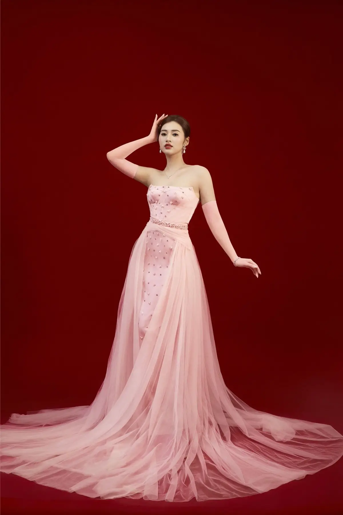 Graceful Pink Ao Dai Beauty: Elegant Vietnamese Woman with Alluring Pearl Jewelry