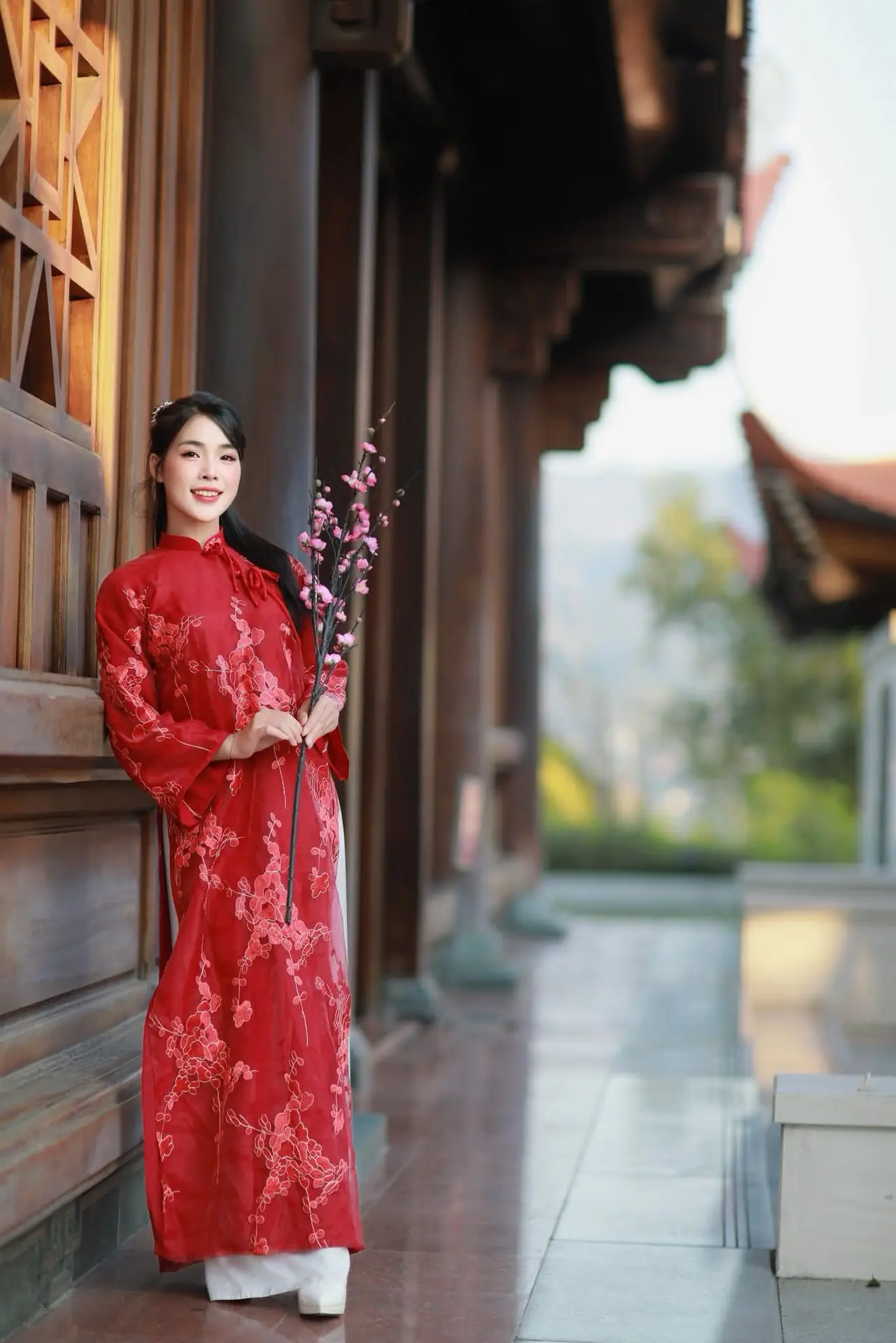 This stunning photo captures a graceful Vietnamese girl in a vibrant red Ao Dai, showcasing her beauty amidst ancient architecture. The intricate patterns on her dress highlight the elegant and traditional charm of Vietnamese women. She gently leans against a wooden pillar, holding a branch of pink cherry blossoms, bringing a joyful and lively spring atmosphere. The traditional wooden architecture in the background further emphasizes distinctive Vietnamese culture, creating a harmonious picture of human beauty and heritage. This image not only portrays confident grace but also pride in national attire and Vietnamese scenery, evoking feelings about enduring cultural values.#AoDai #VietnameseBeauty #VietnameseCulture #CherryBlossom #AncientArchitecture