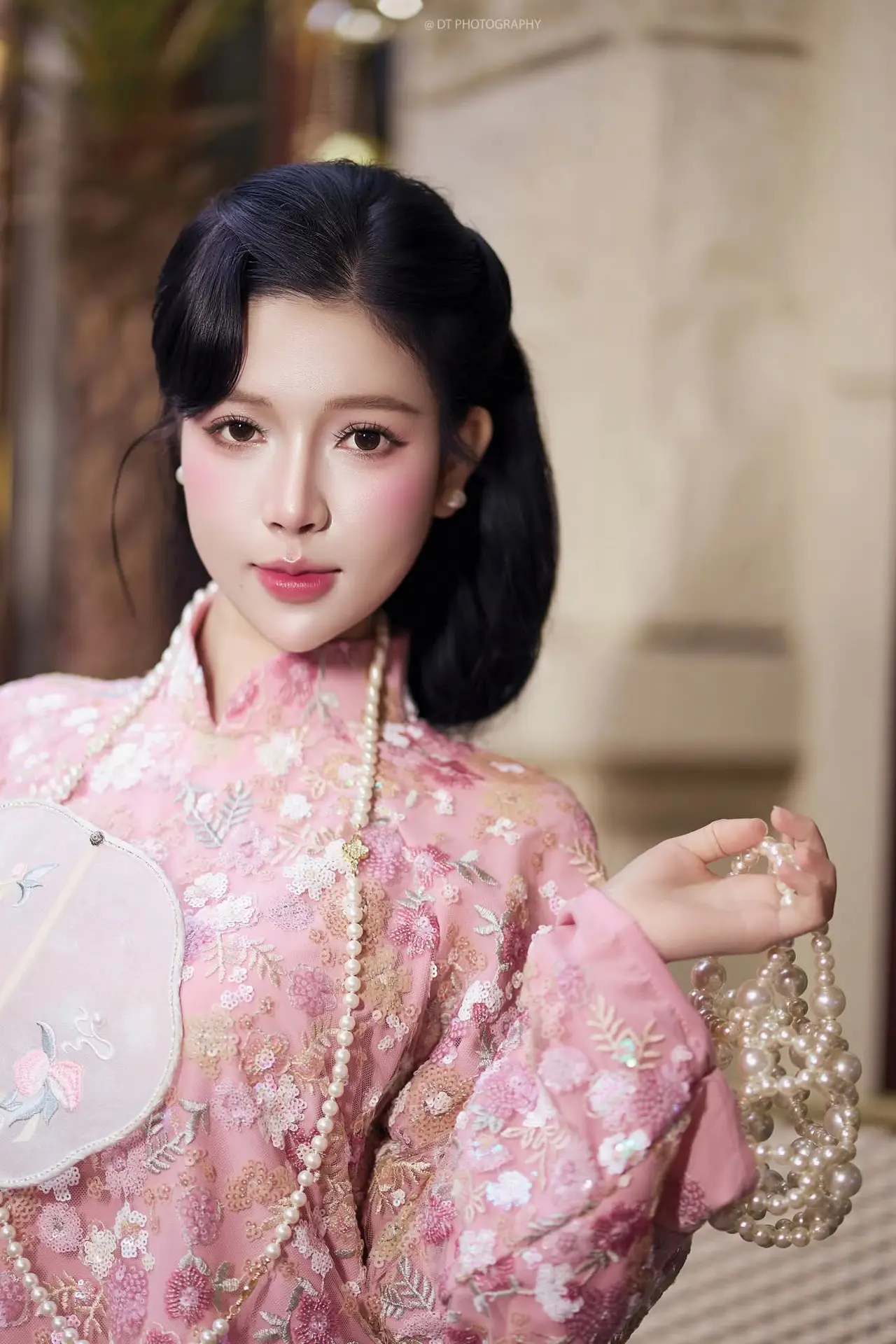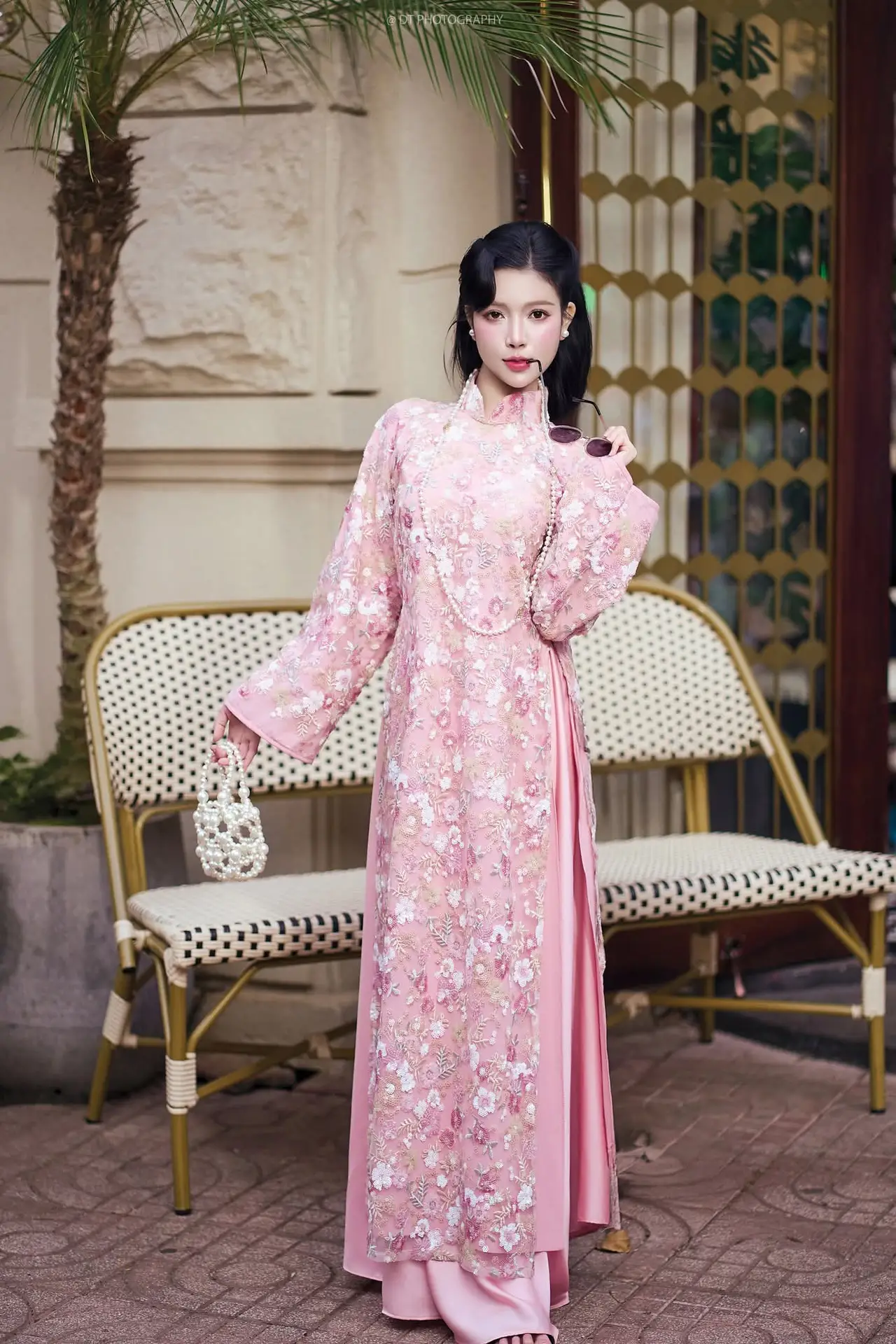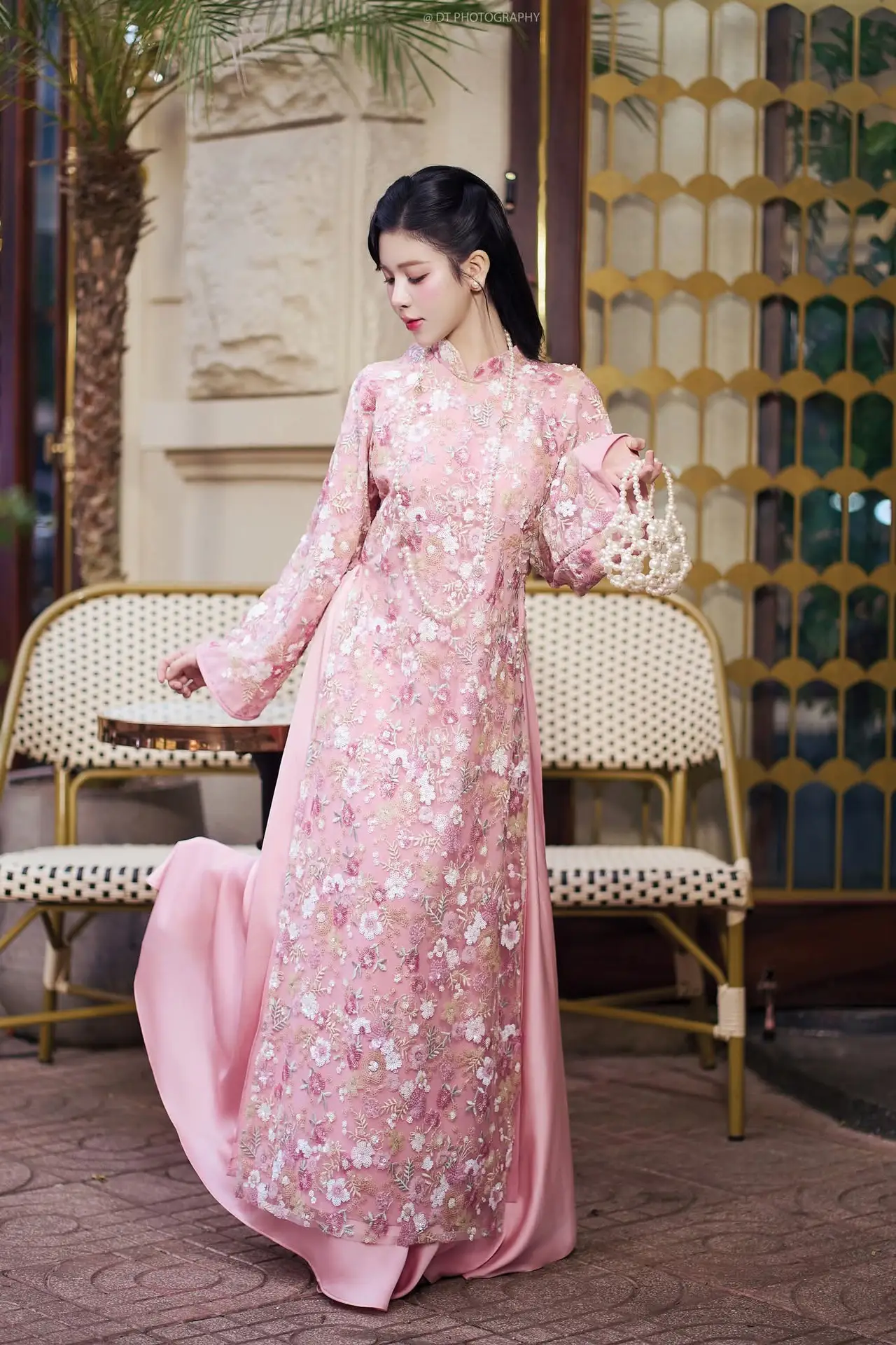 This exquisite photograph captures the graceful and elegant beauty of a Vietnamese woman in a traditional pink Ao Dai. The attire is intricately embroidered with delicate floral patterns, exuding sophistication and femininity. She embodies a gentle Asian charm with her sleek dark hair and radiant fair skin. The shimmering pearl necklace and the small, elegant hand fan add a touch of classic nobility to her appearance. Her serene expression reflects both confidence and modesty, creating a captivating image. This is not merely a portrait but a celebration of the traditional beauty of Vietnamese women through the timeless Ao Dai.#PinkAoDai #VietnameseBeauty #AsianGirl #TraditionalAttire #GracefulCharm