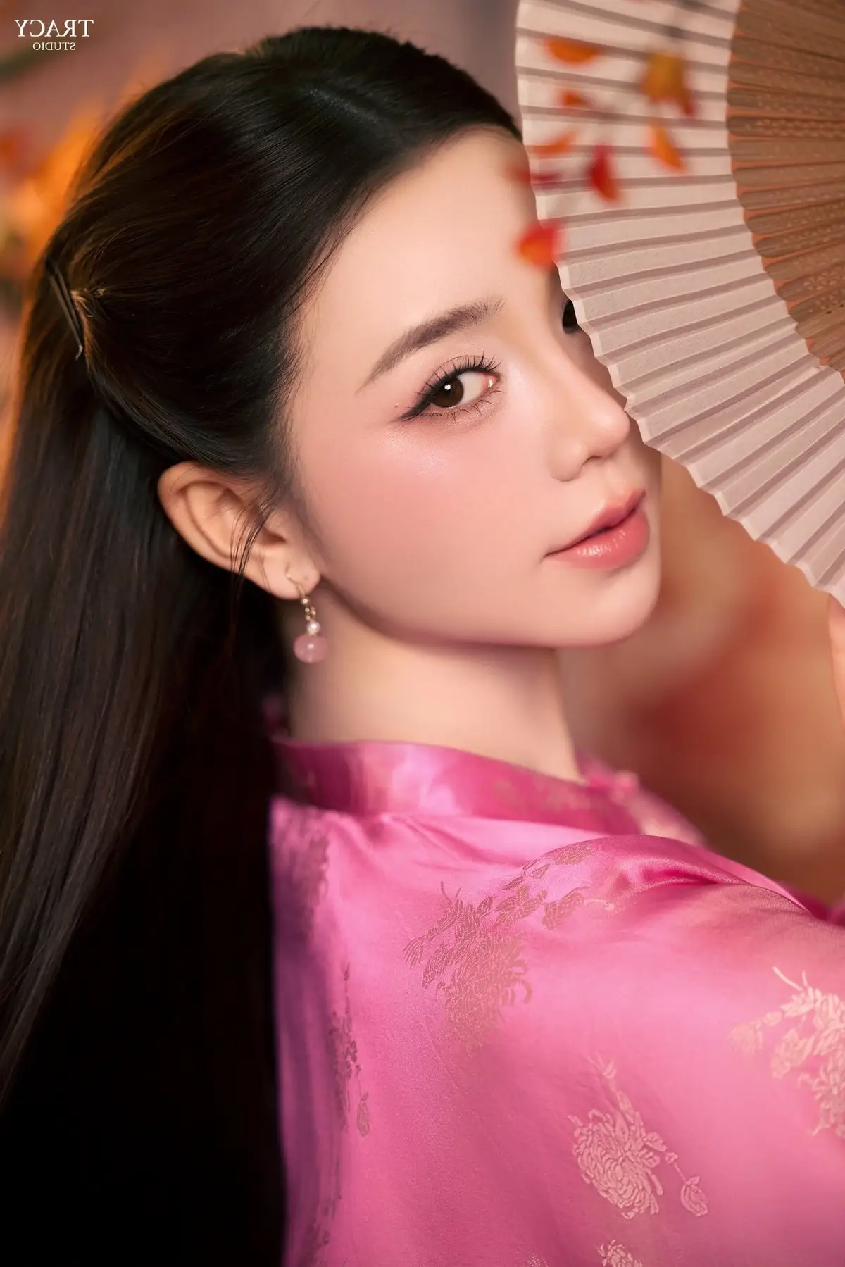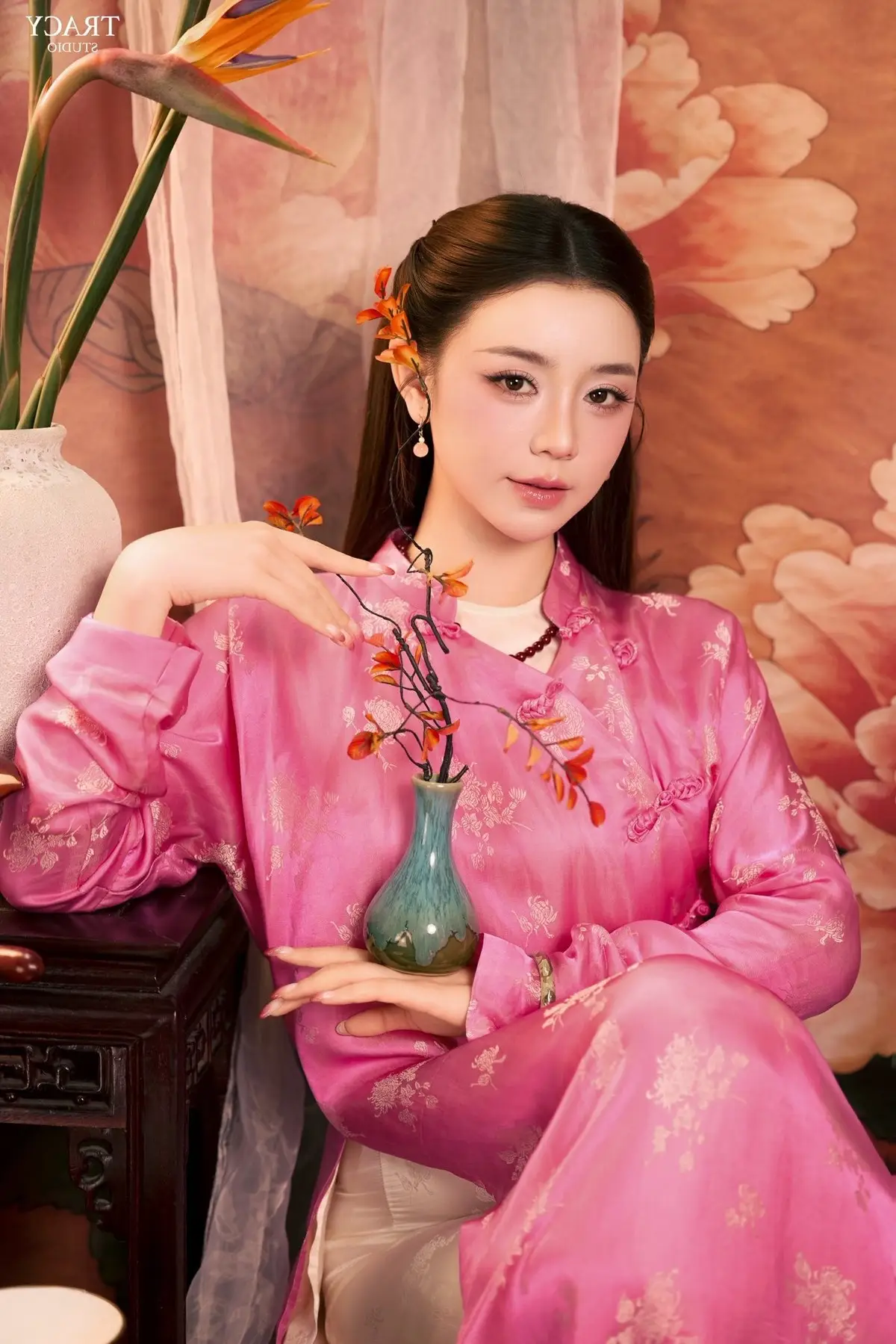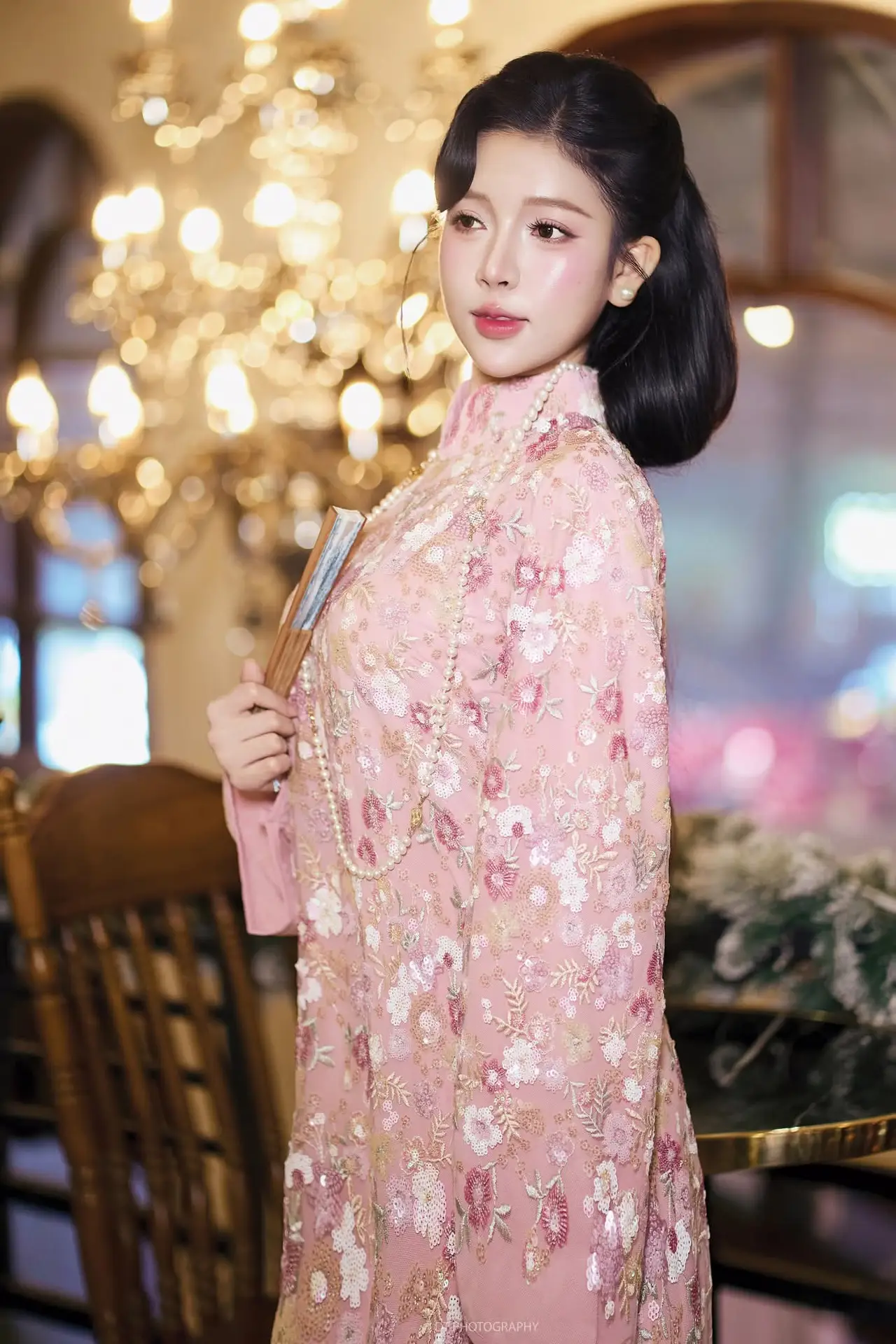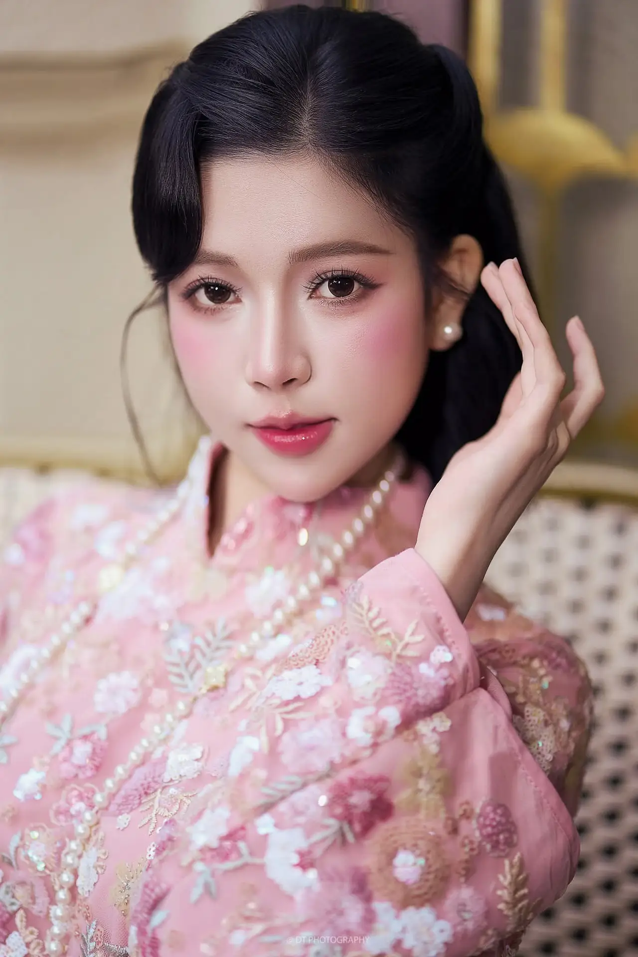 This exquisite photograph captures the graceful and elegant beauty of a Vietnamese woman in a traditional pink Ao Dai. The attire is intricately embroidered with delicate floral patterns, exuding sophistication and femininity. She embodies a gentle Asian charm with her sleek dark hair and radiant fair skin. The shimmering pearl necklace and the small, elegant hand fan add a touch of classic nobility to her appearance. Her serene expression reflects both confidence and modesty, creating a captivating image. This is not merely a portrait but a celebration of the traditional beauty of Vietnamese women through the timeless Ao Dai.#PinkAoDai #VietnameseBeauty #AsianGirl #TraditionalAttire #GracefulCharm