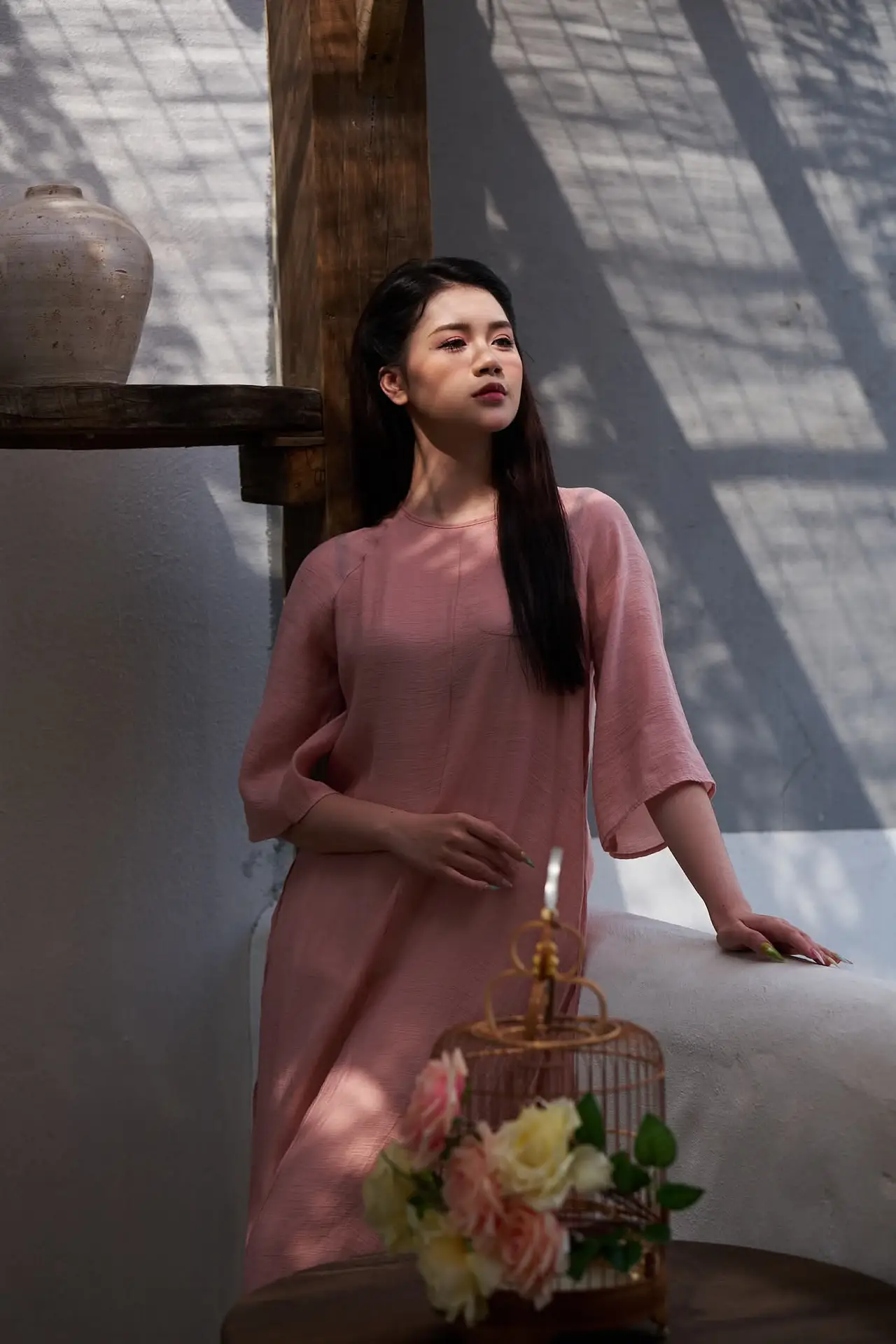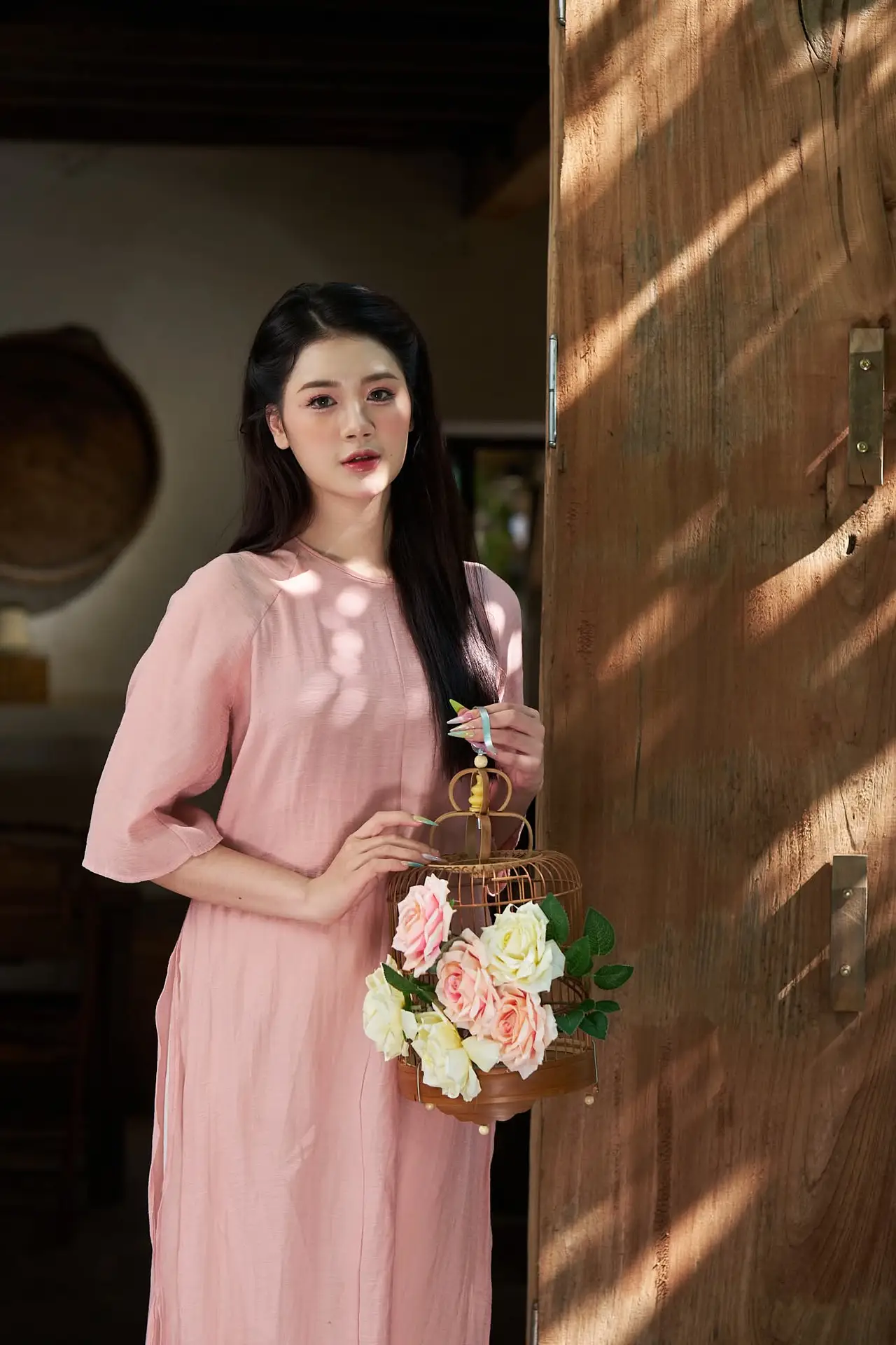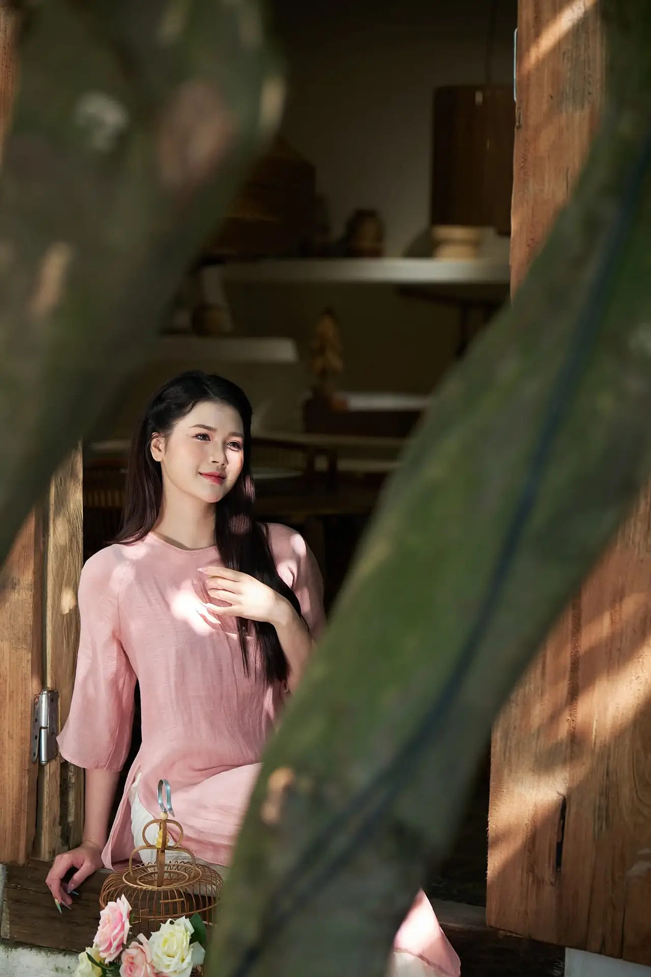 This stunning photograph beautifully captures the elegant Vietnamese beauty through the image of a young woman. With a gentle smile and a dreamy gaze, she leans by a rustic wooden window frame, fully embracing the natural light pouring in. Her soft pastel pink attire further enhances her graceful and delicate charm. The harmonious blend of the peaceful setting, vibrant flowers, and the pure beauty of the young lady creates a poetic and emotional moment. This is not just a portrait but also a story of serenity and subtle sophistication in the soul of a Vietnamese girl.#VietnameseBeauty #GracefulGirl #NaturalLight #Elegance #VietnameseStyle #AoDai