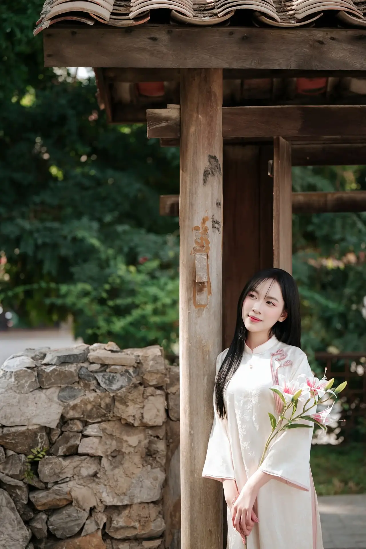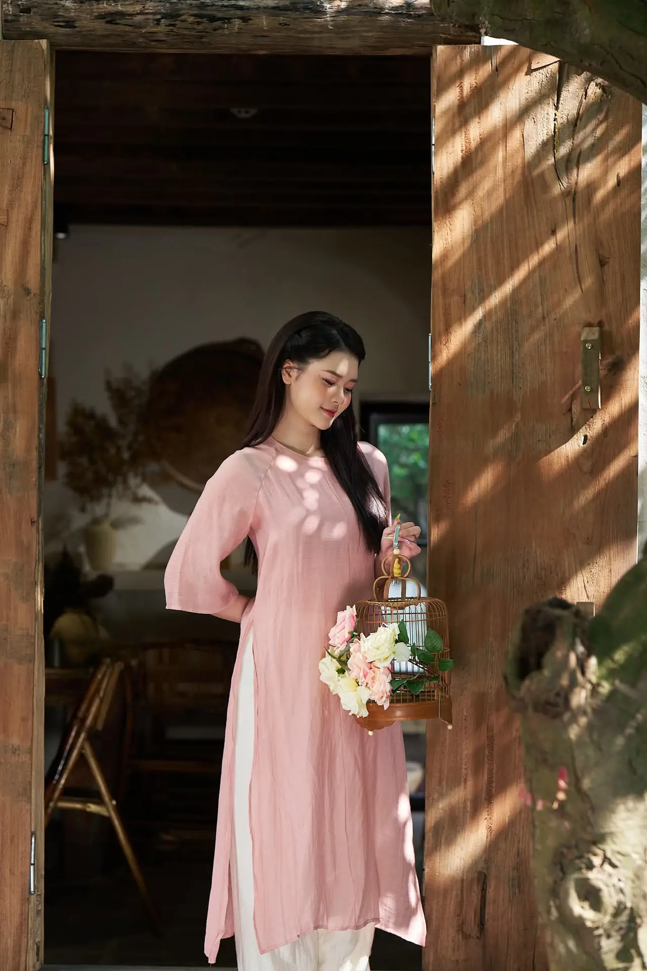 This stunning photograph captures the elegant and graceful beauty of a Vietnamese woman adorned in the traditional Ao Dai. The young lady with her long flowing hair and gentle expression embodies purity and charm. Her cream-colored Ao Dai with delicate pink accents perfectly complements her figure highlighting her softness and poise. The backdrop features traditional wooden pillars and lush greenery creating a harmonious and culturally rich Vietnamese setting. The bouquet of soft pink flowers she holds further enhances her feminine allure. This image vividly portrays a traditional yet modern Vietnam through the beauty of its people and national attire.#AoDai #VietnameseBeauty #TraditionalAttire #VietnamCulture #AsianGrace