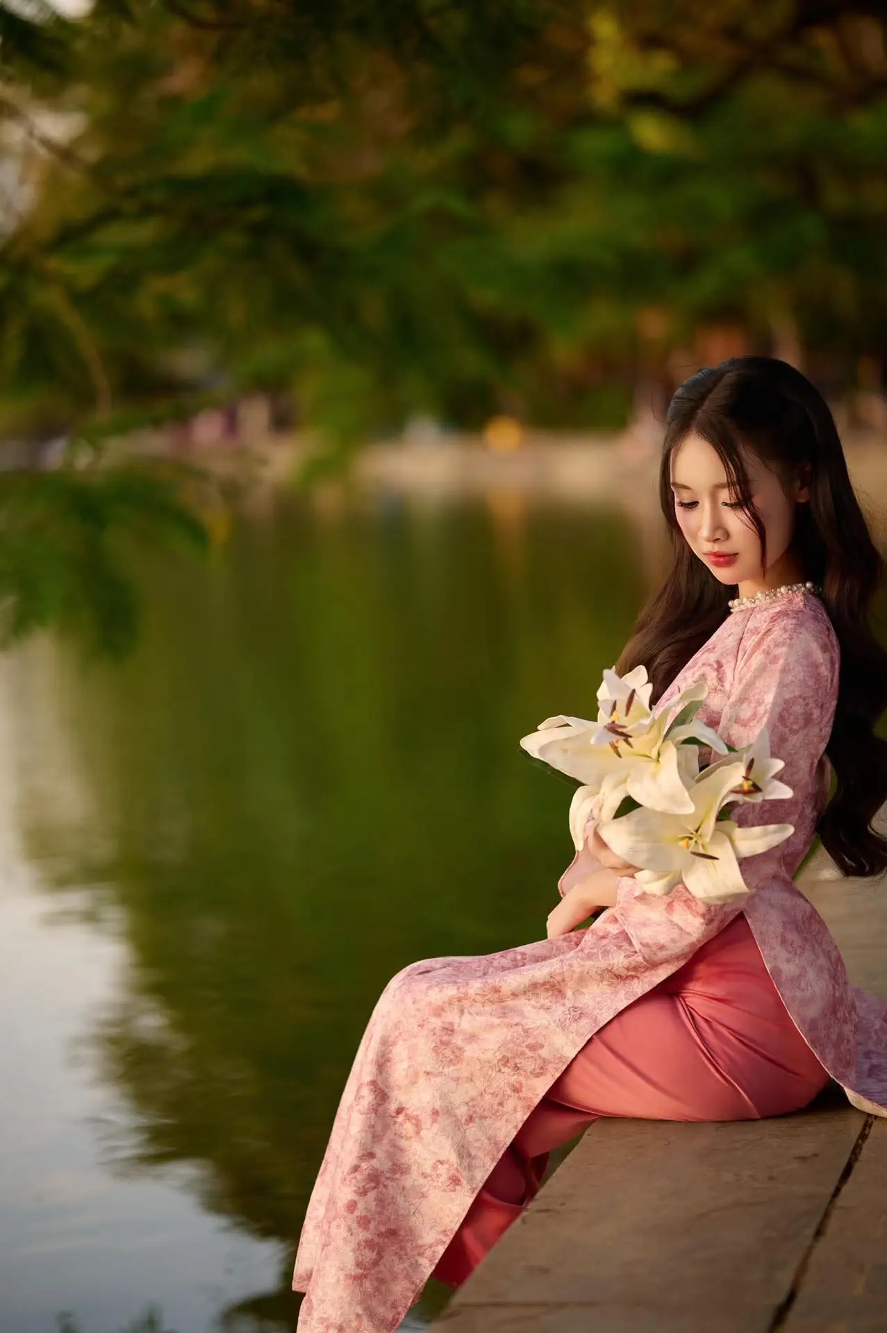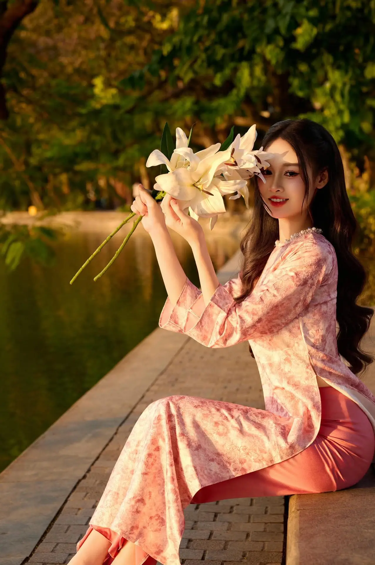 This stunning photograph captures the graceful moment of a Vietnamese young woman in a traditional pink Ao Dai set against a romantic sunset backdrop She kneels gently by the lakeside holding a bouquet of pristine white flowers her gaze softly directed into the distance The golden light of the setting sun bathes her long hair and flowing dress creating an elegant yet captivating beauty This image not only celebrates the gentle and demure charm of Vietnamese women but also illustrates a wonderful harmony between human and nature Every detail from the vibrant colors of her attire to the natural lighting contributes to an emotional work of art that touches the viewers heart It truly embodies cultural beauty and the Vietnamese soul#AoDai #VietnameseBeauty #Sunset #TraditionalDress #VietnamCulture