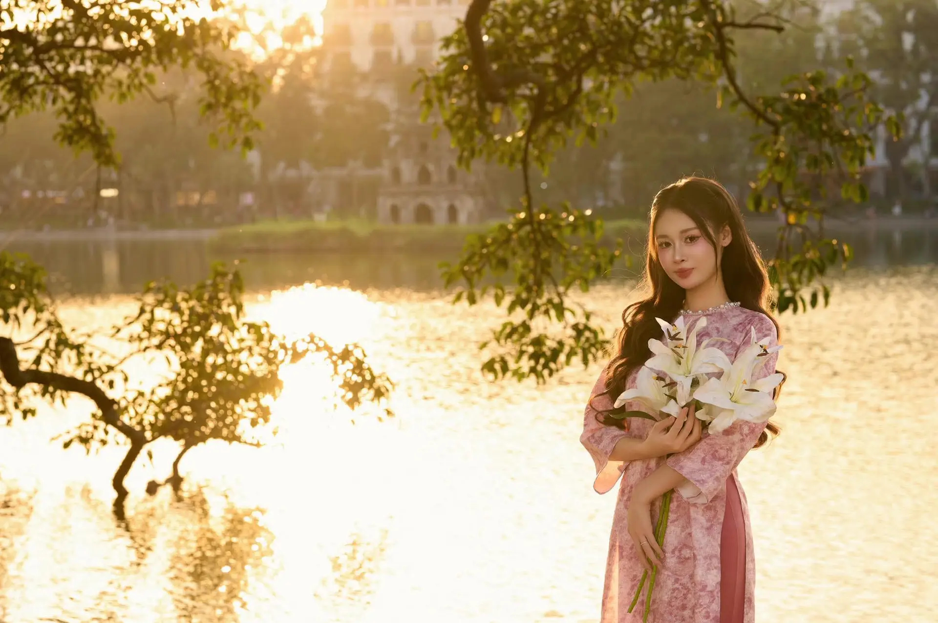 Captivating Vietnamese Beauty in Pink Ao Dai by the Lakeside at Sunset
