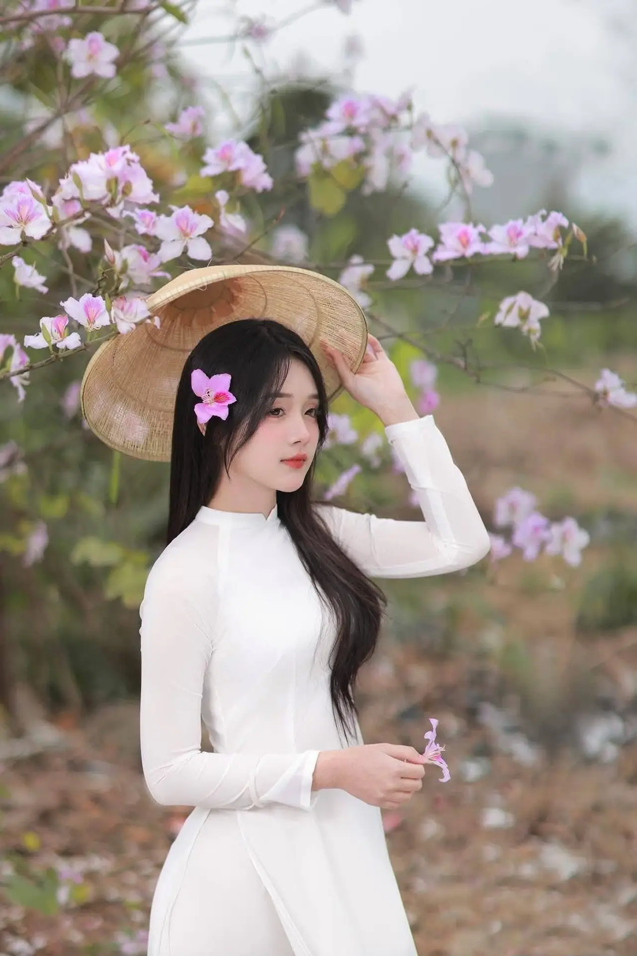 Elegant Vietnamese Student in Ao Dai Amidst Bauhinia Flowers