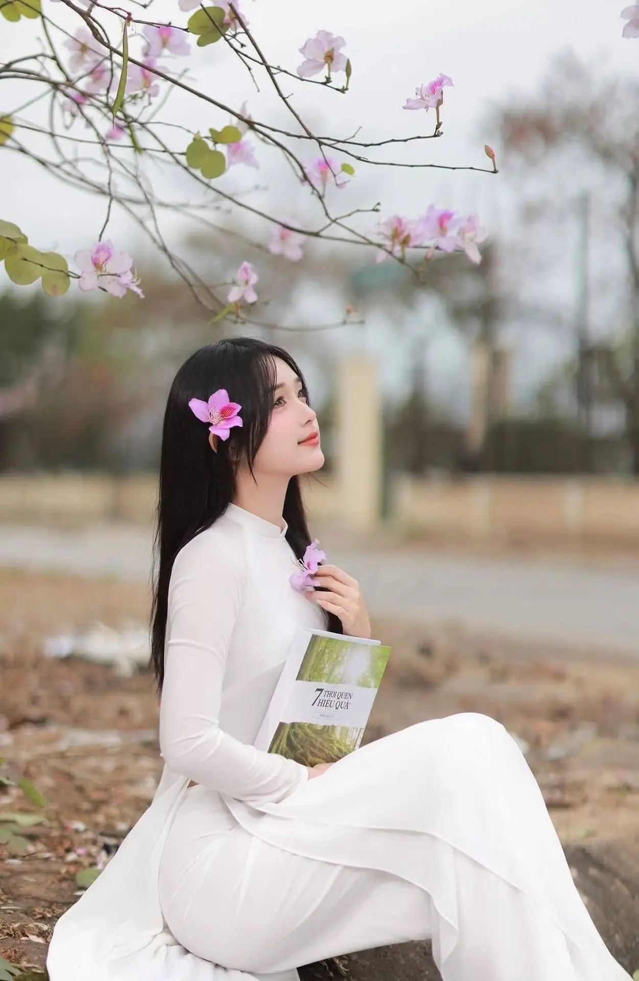 This enchanting photo captures a beautiful Vietnamese student gracefully adorned in a pristine white Ao Dai. The young woman, with her long dark hair elegantly styled and a charming pink Bauhinia flower tucked in, exudes an ethereal and gentle beauty. Her subtle smile and clear, bright eyes further enhance the captivating charm of her student years. In her hands, she holds a book, a symbol of knowledge and learning, blending seamlessly with her traditional aesthetic. Behind her, vibrant pink Bauhinia flowers bloom profusely, creating a romantic and poetic backdrop that evokes the beauty of spring. This image not only celebrates the timeless elegance of the Ao Dai but also beautifully portrays the refined grace of Vietnamese women, an enduring emblem of Vietnamese culture and spirit.#AoDai #VietnameseBeauty #StudentLife #BauhiniaFlowers #Graceful