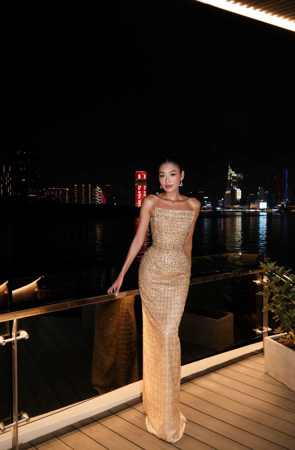 Miss Ý Nhi Radiates Elegance: A Vision in Her Sophisticated Evening Gown on Grand Ancient Stairs