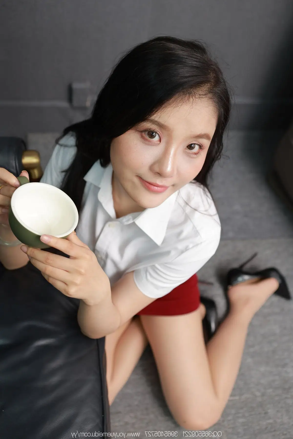 The IESS SXJ No2113 photo series features Wan Ping in a moment of captivating grace and elegance. The Chinese model is seen in classic office attire a crisp white shirt paired with a striking red mini skirt. Her relaxed pose on the floor with sheer stockings and delicate high heels creates an image that is both approachable and alluring. Wan Ping gently holds a small cup her gaze thoughtful hinting at the untold story behind her gentle beauty. This photograph not only celebrates her physical charm but also portrays the modern and refined elegance of an East Asian woman.#WanPingIESS #OfficeFashion #RedSkirt #SheerStockings #ChineseModel
