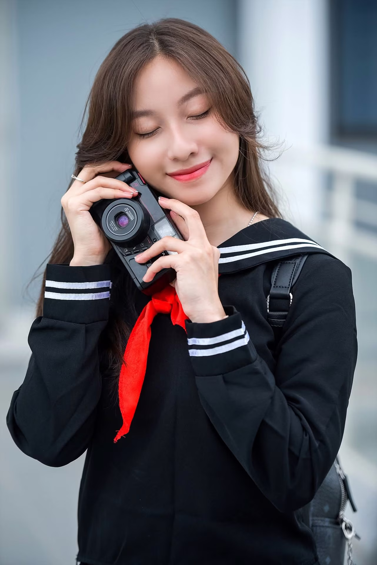 VGU No.17 captures a fresh moment of a youthful student on the VGU campus. The girl exudes a dynamic and confident charm with her modern school style. Her black sailor-collar top paired with a pleated skirt and a fashionable backpack creates a harmonious and striking ensemble. The distinctive platform shoes and white socks further enhance the unique flair of her outfit. Her gentle smile and radiant eyes reflect the vibrant spirit of youth. This image is not just a beautiful portrait but also symbolizes the youthful energy and dynamism of VGU students. #Vietnamese #pretty #charmVGU No.16: Discover the Gentle Charm of White Ao Dai and Lotus – Captivating Vietnamese Beauty