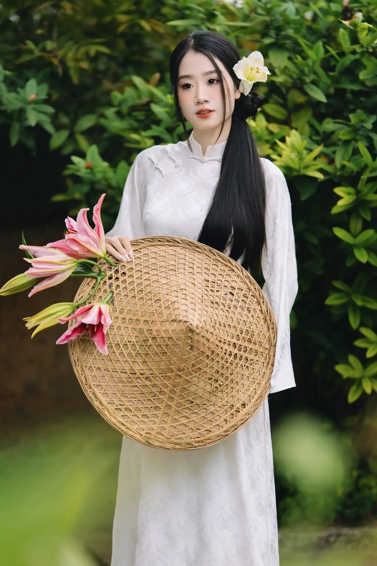This exquisite photograph beautifully captures a graceful Vietnamese woman adorned in a pristine white Ao Dai. She radiates an elegant and gentle charm, with long flowing hair and a serene gaze. The vibrant pink lilies in her hands not only emphasize her purity but also enhance her feminine allure. The traditional Ao Dai, featuring subtle embossed patterns, perfectly accentuates her slender figure and the inherent grace of Vietnamese women. A delicate yellow flower placed in her hair serves as a soft highlight, harmonizing with her natural beauty and innocence. More than just a portrait, this image is a heartfelt tribute to Vietnam's rich cultural heritage, evoking feelings of peace, elegance, and enduring charm.#WhiteAoDai #VietnameseGirl #Lilies #TraditionalBeauty #VietnameseCulture #AoDai