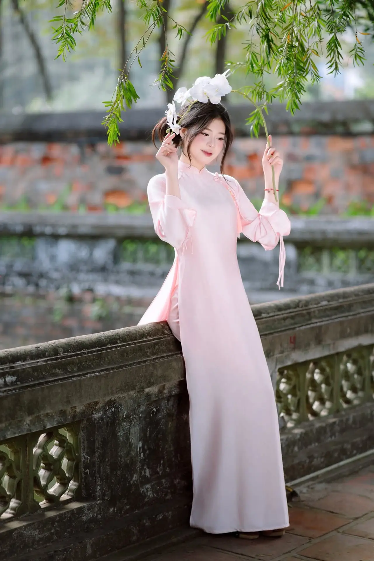 This stunning photograph captures the graceful moment of a young Vietnamese woman in a soft pastel pink Ao Dai. Leaning gently against an ancient stone bridge railing, she delicately holds a bouquet of pristine white orchids, creating a harmonious and poetic scene. The traditional beauty of Vietnamese women is beautifully celebrated through the elegant Ao Dai, complemented by her gentle demeanor and radiant smile. This image is not just a fashion statement; it is a subtle expression of East Asian culture and beauty, evoking a sense of tranquility and serenity.#PinkAoDai #VietnameseBeauty #TraditionalDress #WhiteOrchids #VietCulture