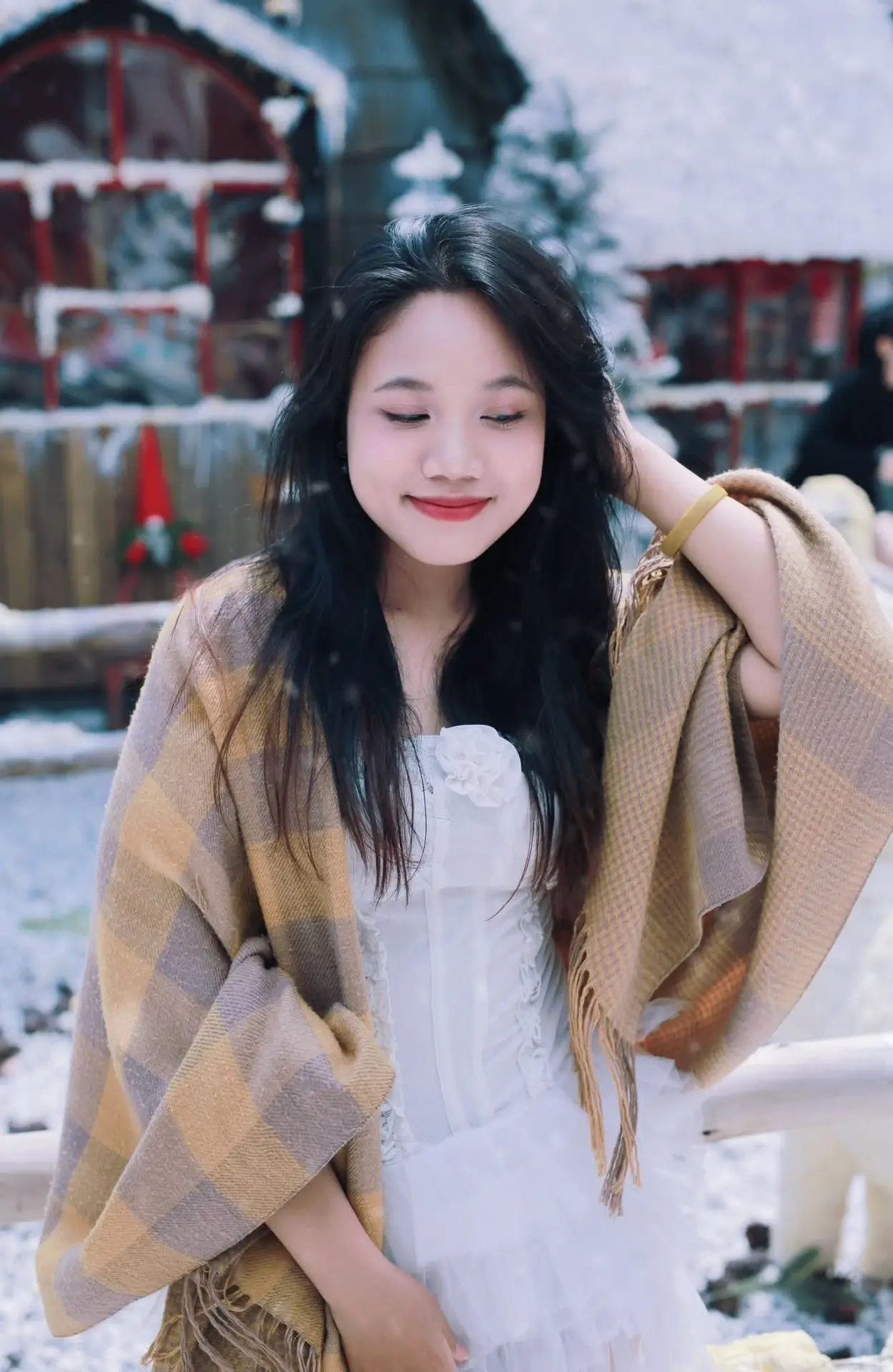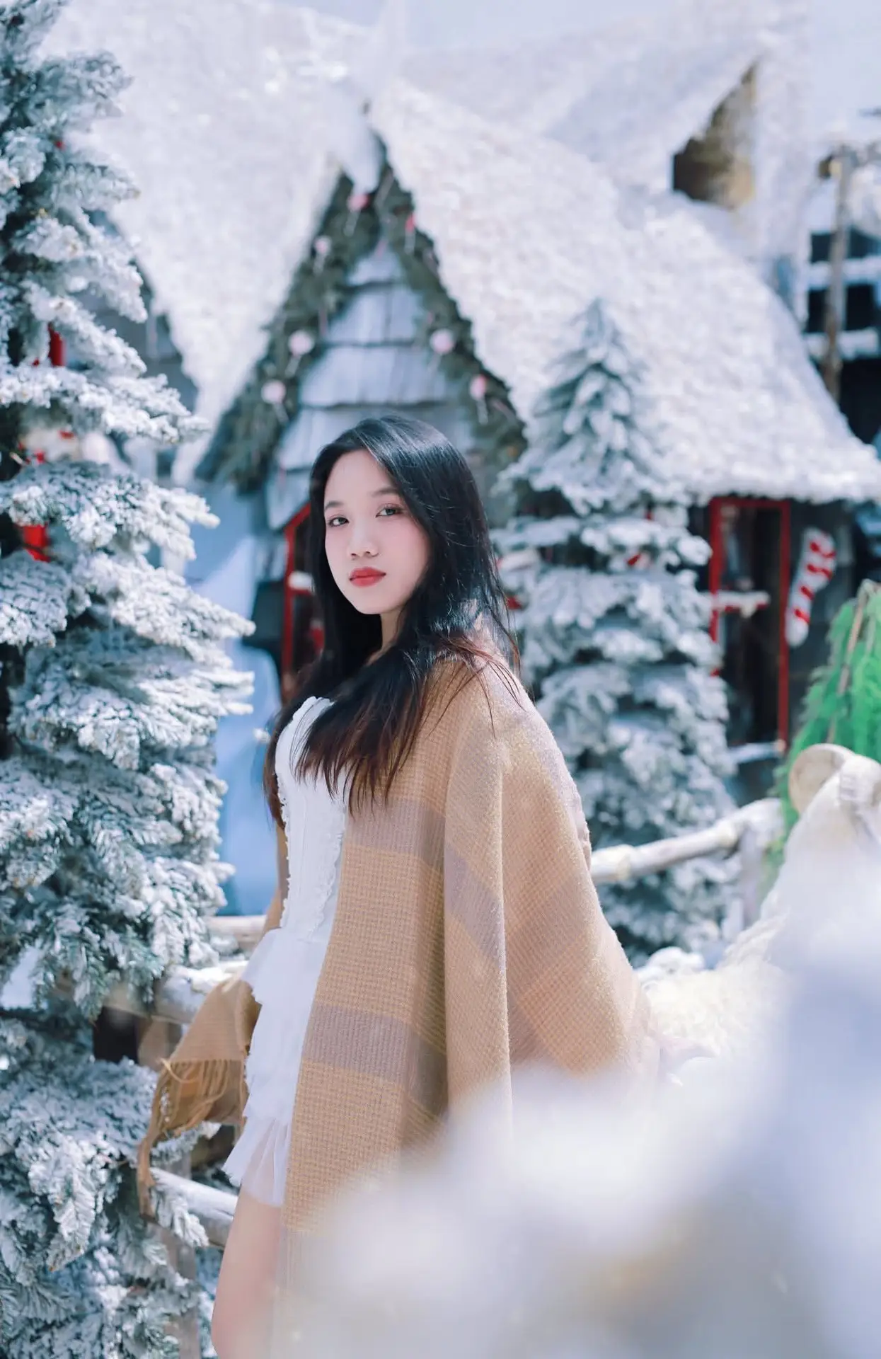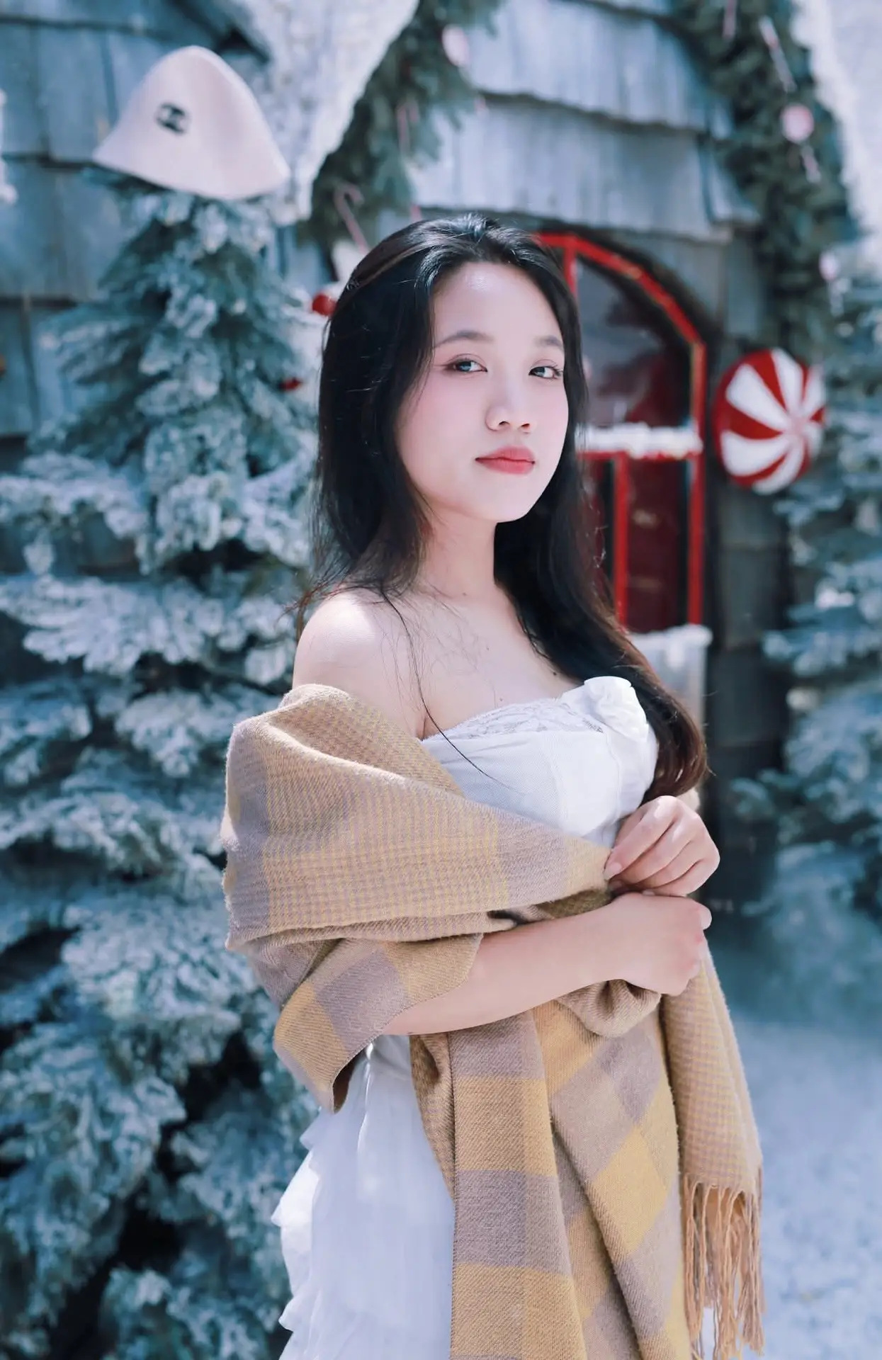 This beautiful image captures a charming young woman in a serene moment. She adorns a pristine white dress, delicately revealing her graceful bare shoulders, complemented by a warm brown shawl. This ensemble creates an elegant yet alluring look. Her bright smile and dreamy gaze further enhance her captivating presence. The background features a faux snow-covered winter scene, evoking a magical and romantic fairytale setting. The girl appears like a muse wandering into a wondrous land, bringing a sense of warmth and tranquility. This photograph is a perfect blend of human beauty and artistic ambiance, sure to enchant every viewer.#VietnameseGirl #WinterFashion #WhiteDress #SnowyScene #WinterWonderland