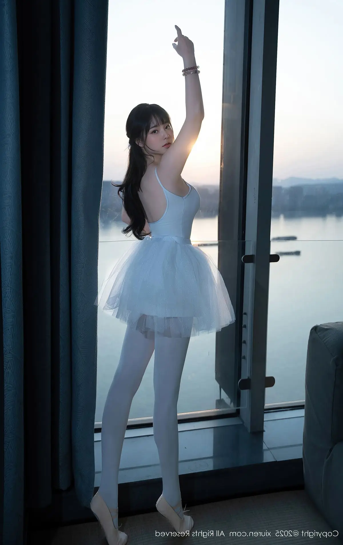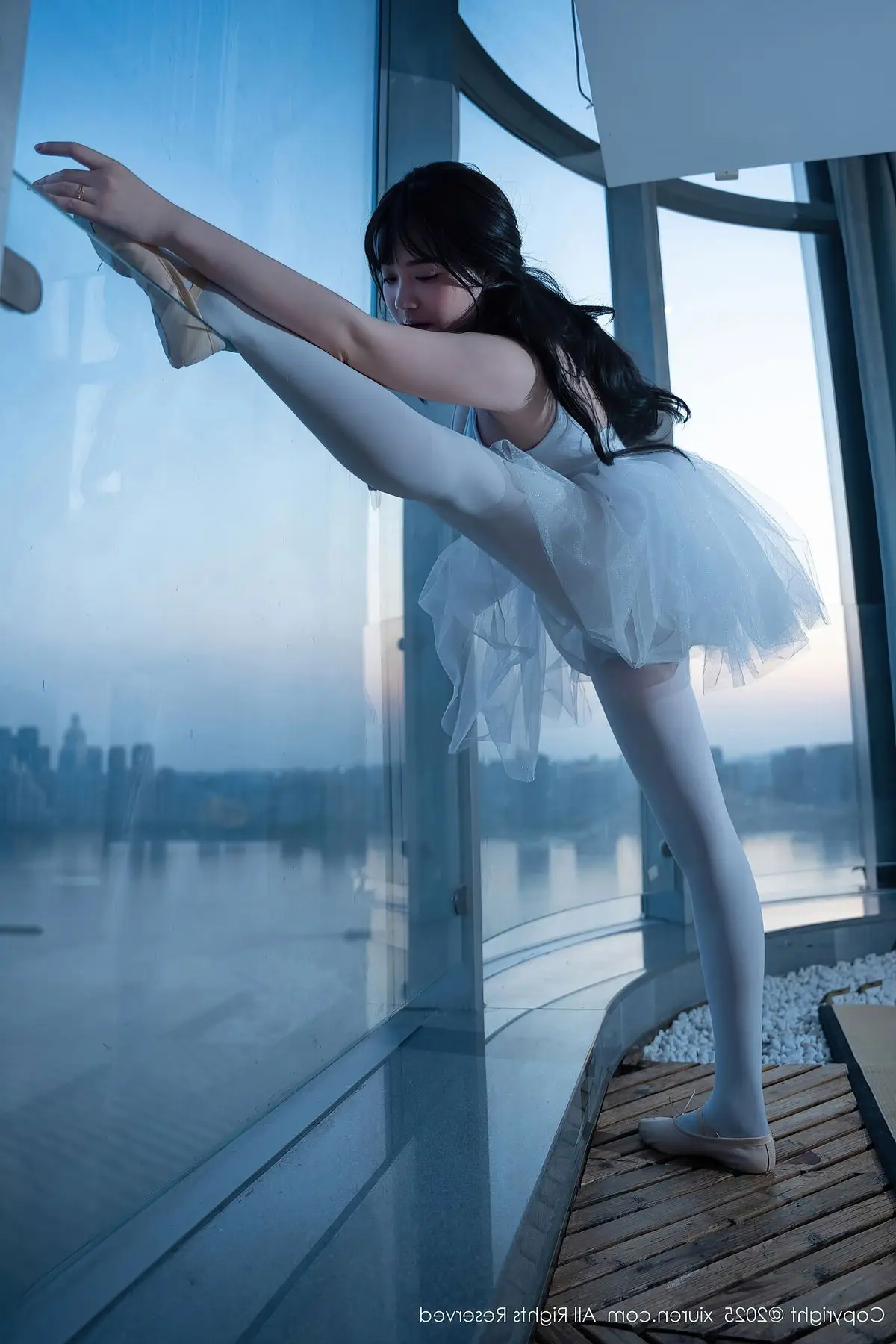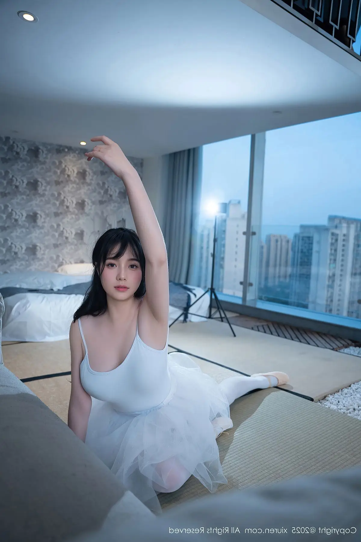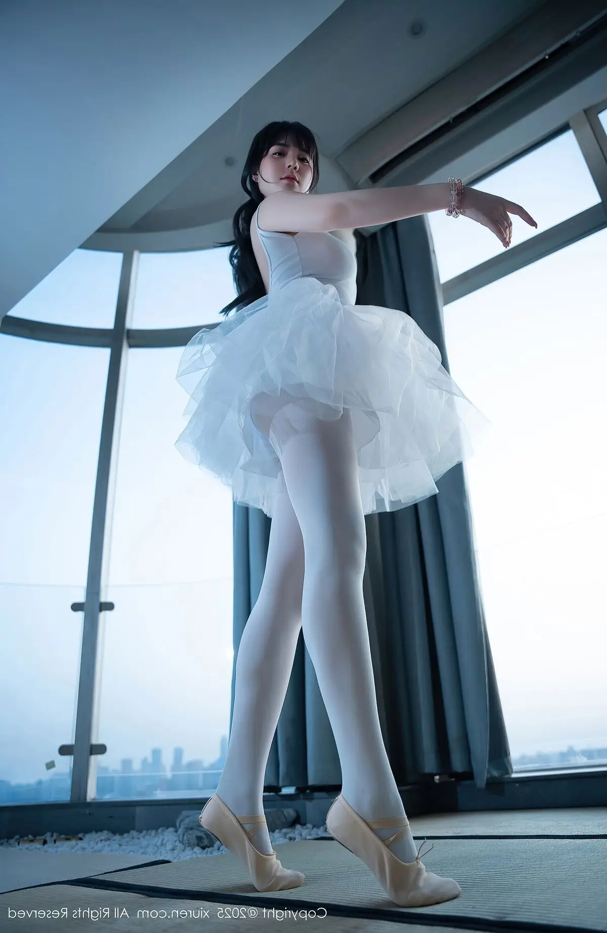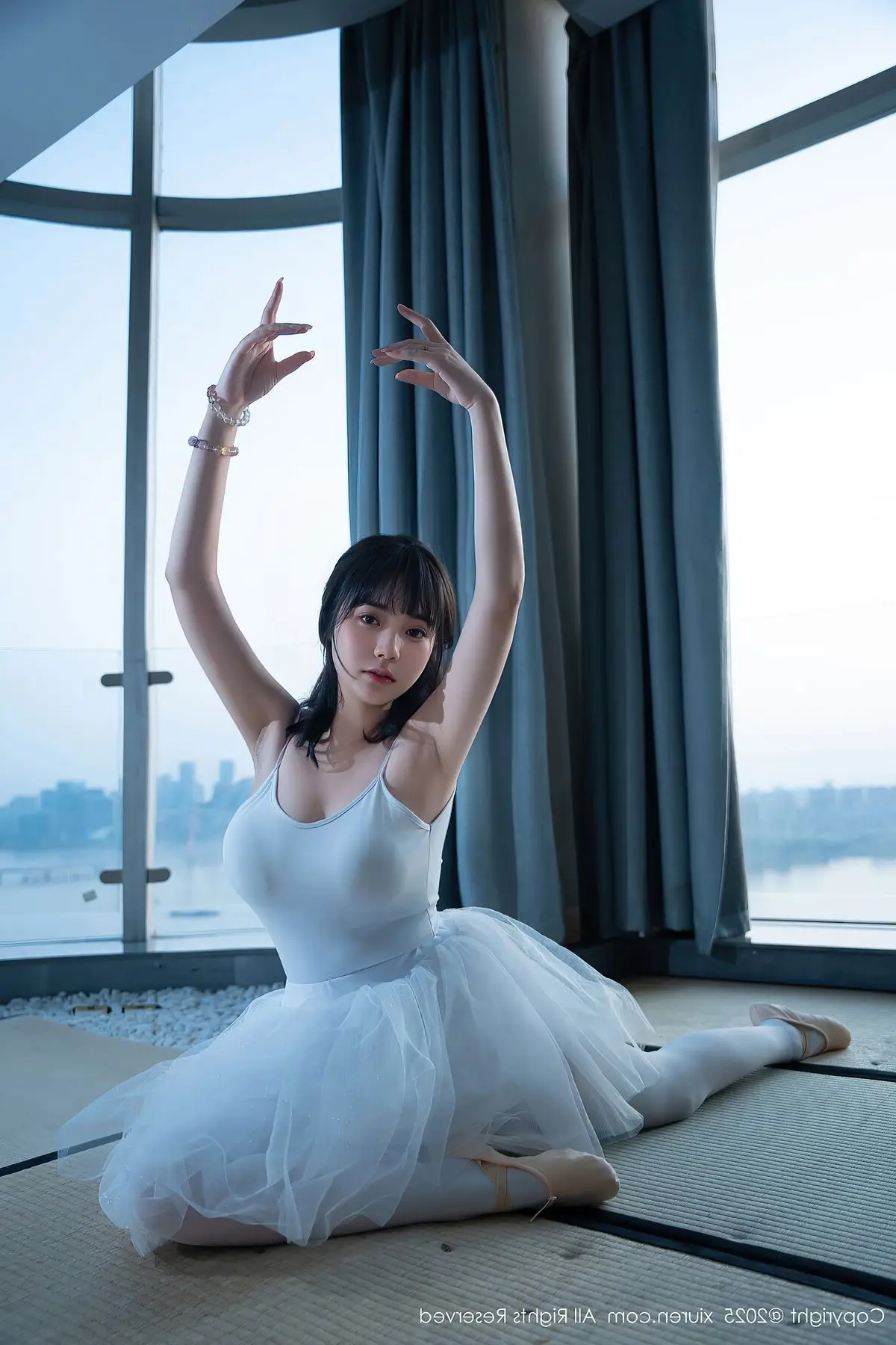 This stunning photo captures model Ruan Qing in a pristine white ballet ensemble, exuding both elegance and allure. She sits gracefully on the floor, her delicate arms raised in a classic ballet pose, showcasing remarkable fluidity and artistry. Soft light streaming through the large windows behind her highlights her figure and the ethereal flow of her tutu, creating a dreamlike atmosphere. Ruan Qing presents an image that is simultaneously pure and captivating, evoking a sense of tranquility and artistic beauty. She truly embodies the spirit of a ballet dancer, enchanting viewers with her grace and charm.#RuanQing #WhiteBallet #GracefulPose #DancerLife #XiuRen