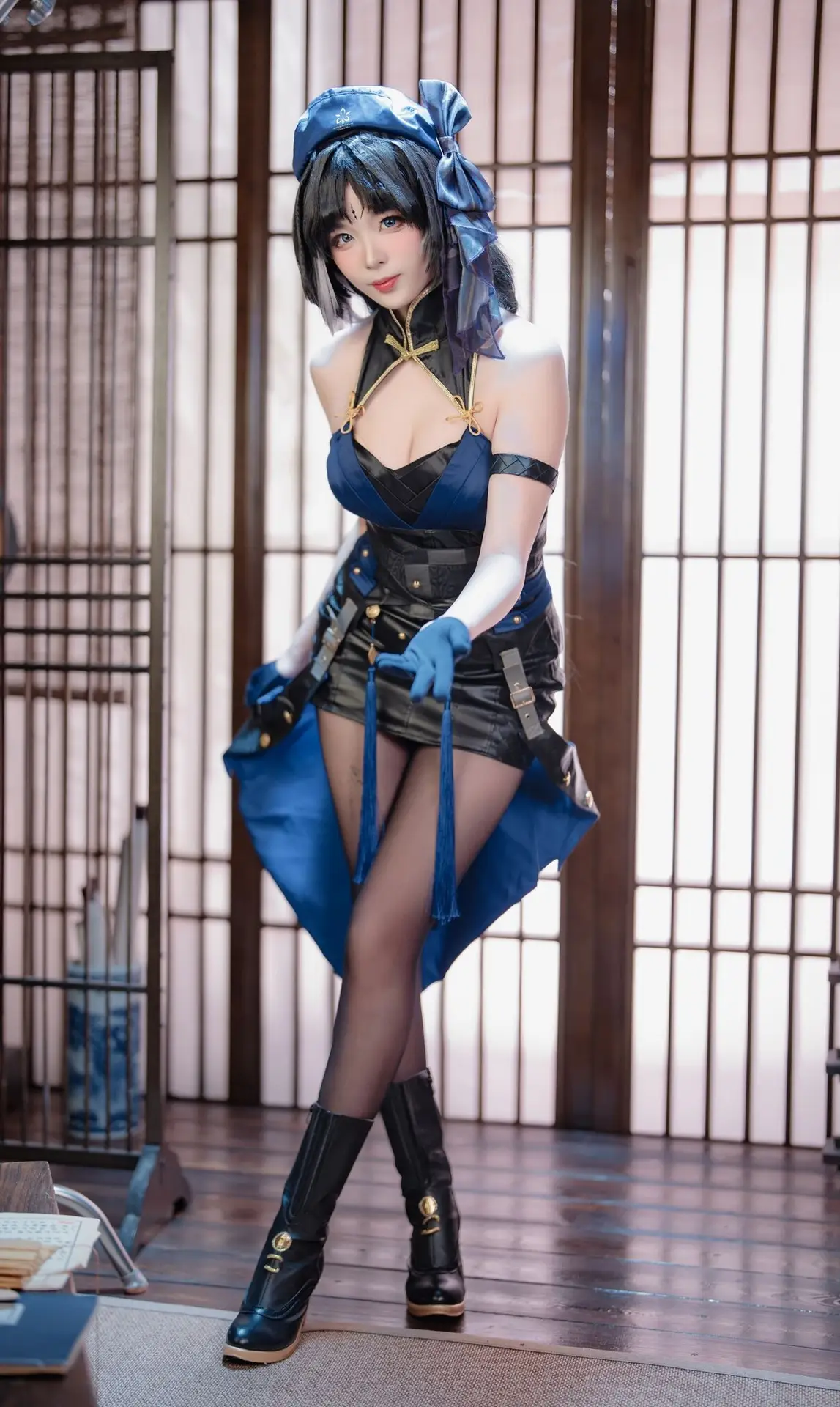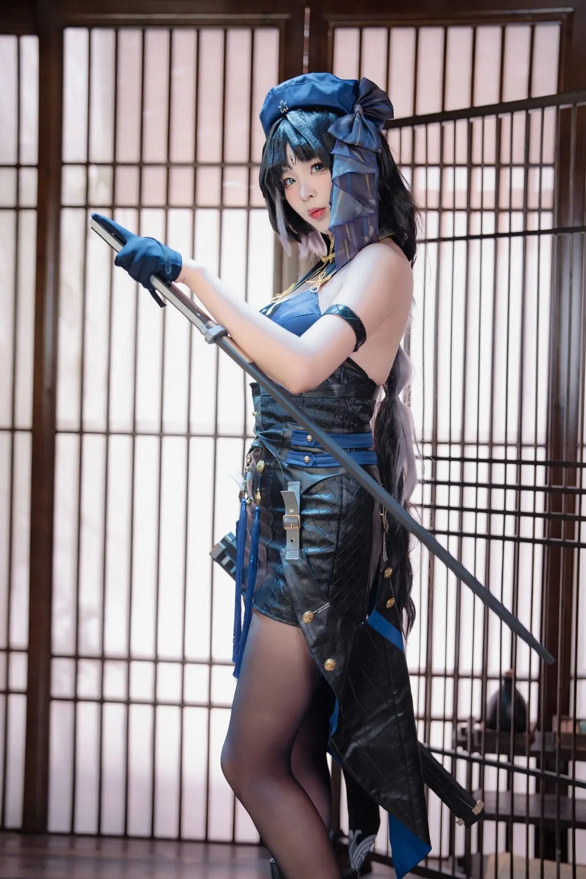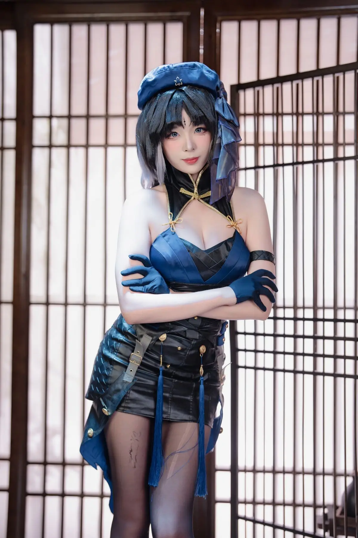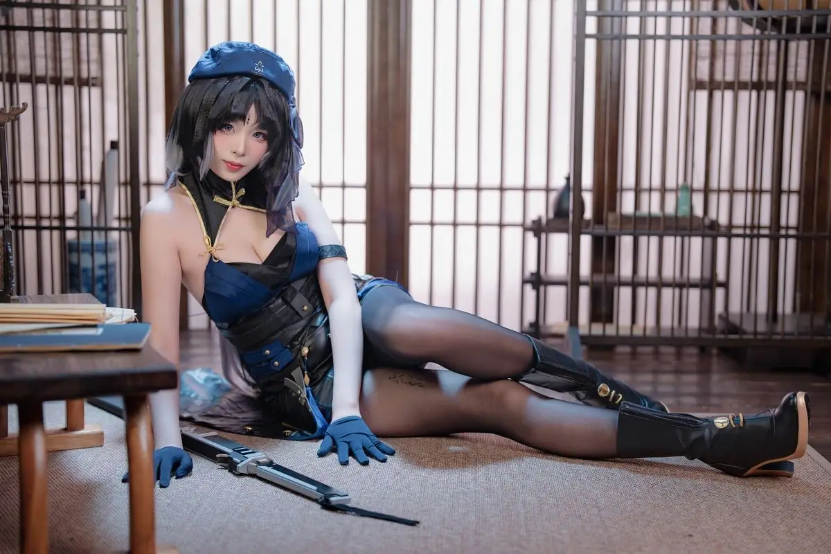 This stunning image showcases cosplayer Xuan Xiao Xue Jie embodying the character Yang Yang with captivating grace. Adorned in a striking dark blue costume complemented by alluring black stockings Xuan Xiao Xue Jie exudes the characters mysterious and powerful essence. Her confident gaze and elegant pose holding a distinctive weapon perfectly capture the spirit of a female warrior. The traditional Asian setting provides a serene yet intriguing backdrop enhancing the overall visual appeal. This piece is part of Xuan Xiao Xue Jies impressive cosplay collection demonstrating her meticulous attention to detail and dedication to the role. Viewers will undoubtedly be drawn to the harmonious blend of modern aesthetics and traditional ambiance.