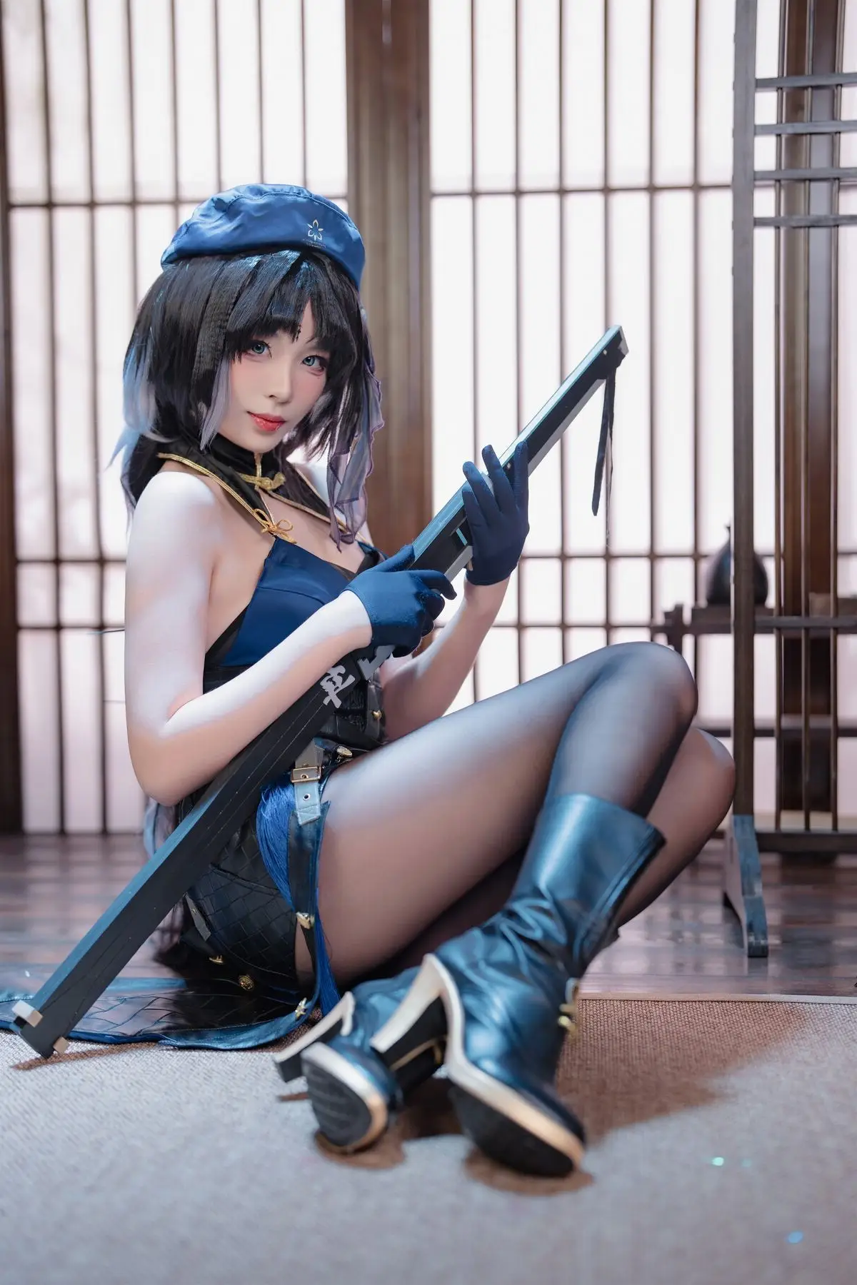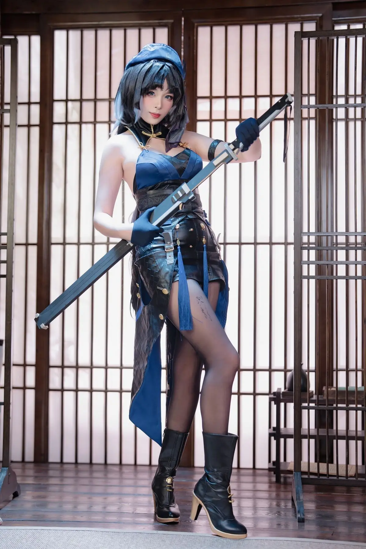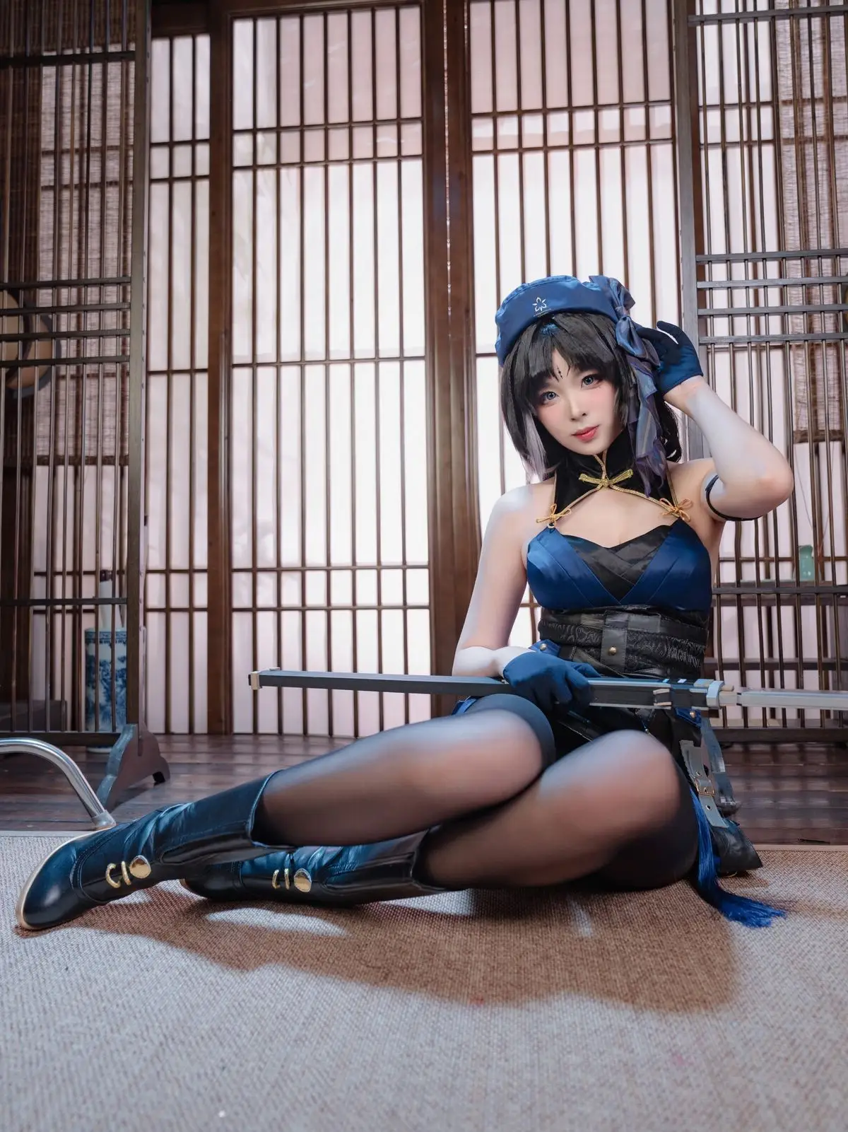 This stunning image showcases cosplayer Xuan Xiao Xue Jie embodying the character Yang Yang with captivating grace. Adorned in a striking dark blue costume complemented by alluring black stockings Xuan Xiao Xue Jie exudes the characters mysterious and powerful essence. Her confident gaze and elegant pose holding a distinctive weapon perfectly capture the spirit of a female warrior. The traditional Asian setting provides a serene yet intriguing backdrop enhancing the overall visual appeal. This piece is part of Xuan Xiao Xue Jies impressive cosplay collection demonstrating her meticulous attention to detail and dedication to the role. Viewers will undoubtedly be drawn to the harmonious blend of modern aesthetics and traditional ambiance.
