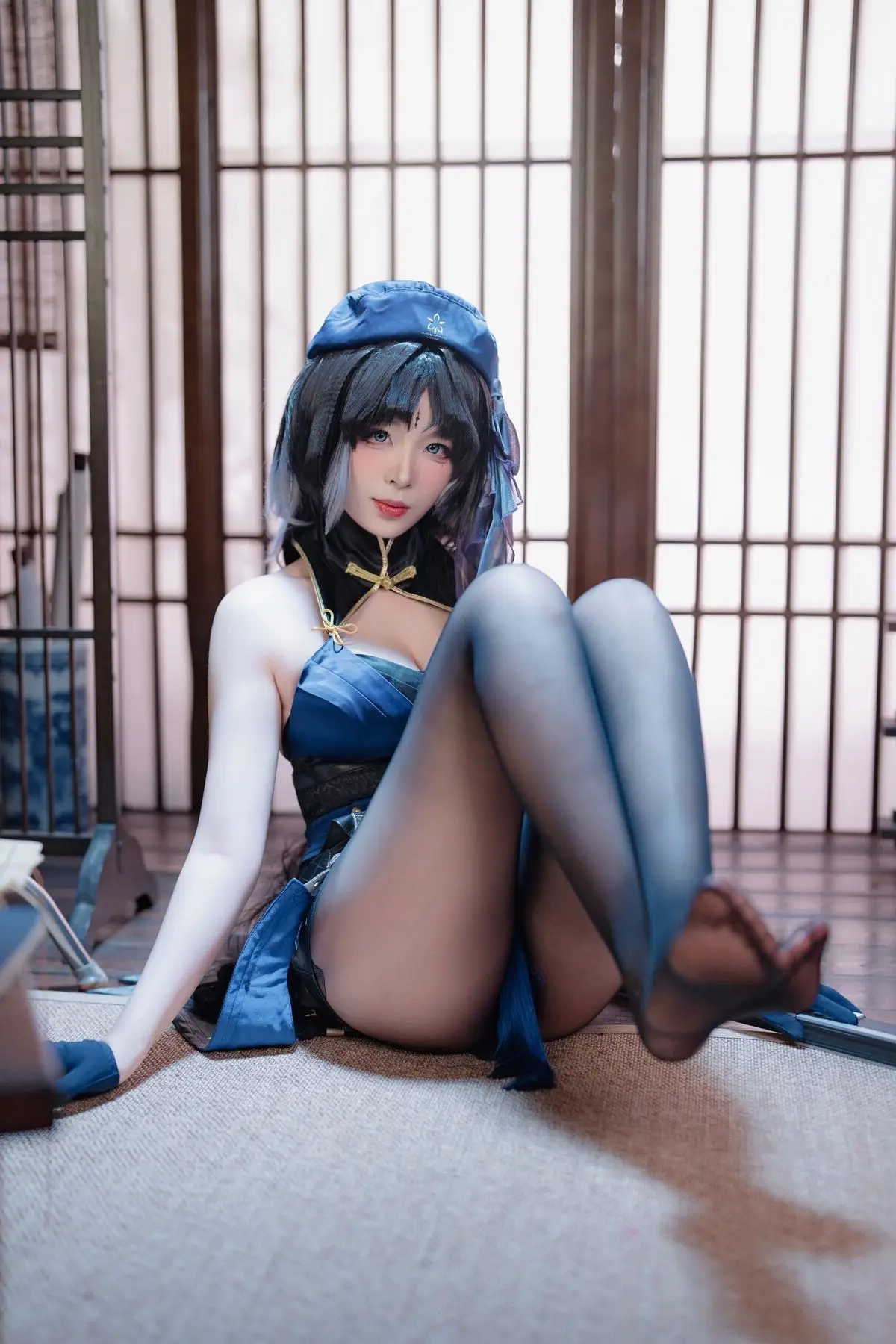 In this captivating series, Coser 轩萧学姐 flawlessly embodies the character 秧秧 Part02, presenting a truly mesmerizing visual. Dressed in a sophisticated dark blue and black costume with intricate details, 轩萧学姐 showcases her dedication and grace. Her elegant seated pose, combined with a captivating gaze, creates an aura that is both mysterious and refined. The meticulous styling from the elaborate headpiece to the delicate sheer stockings perfectly complements the character's aesthetic highlighting the cosplayer's figure and expressive presence. This collection stands as a testament to the cosplayer's artistry and passion offering viewers an impressive and emotionally resonant experience of the cosplay world.