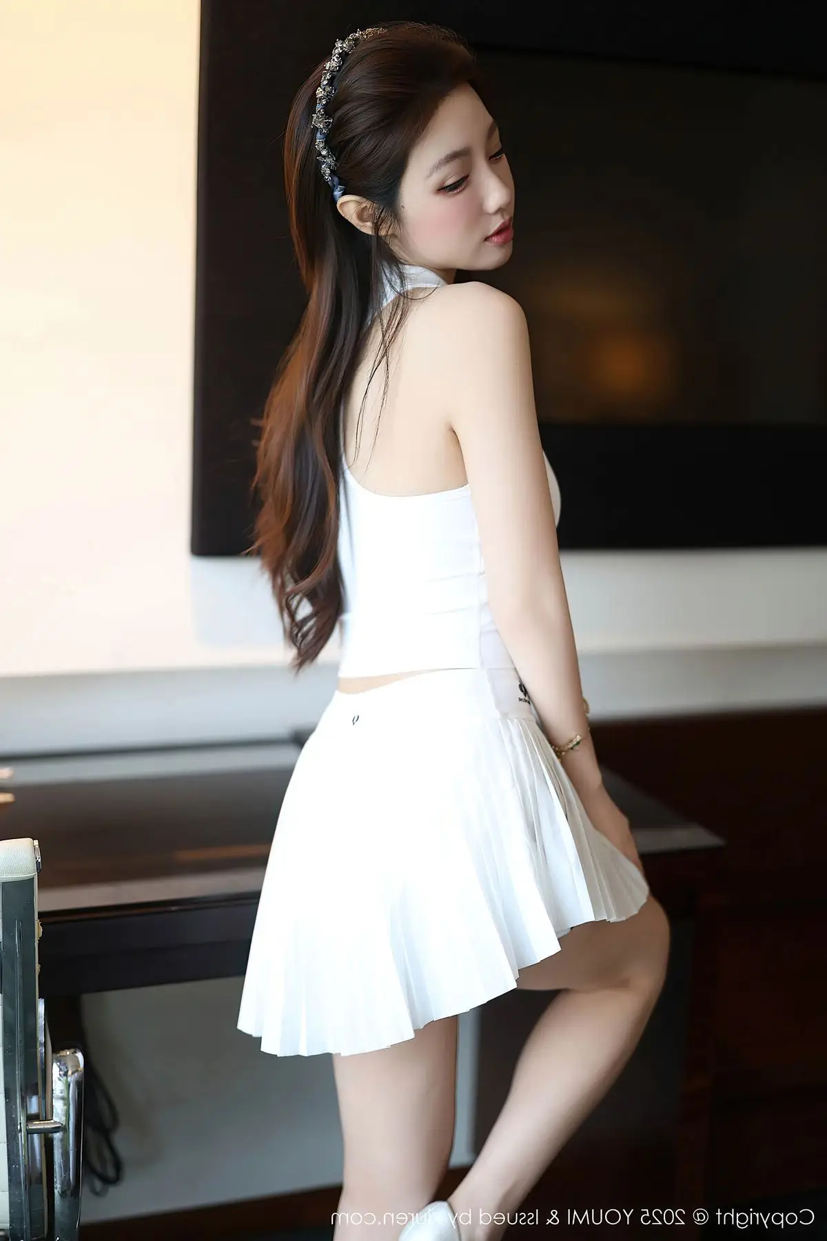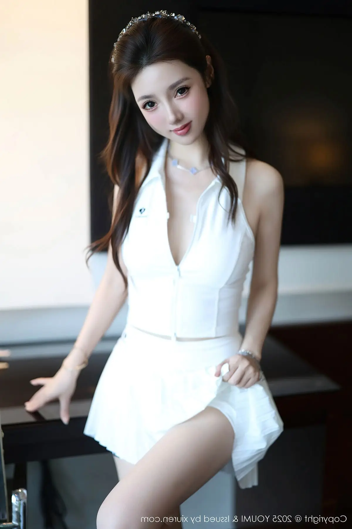 In the YouMi Vol1165 Tao Tao Yao Yao Twins collection this Chinese model shines with elegant and captivating beauty. Her pristine white outfit consisting of a sleeveless crop top and a delicate pleated skirt highlights her slender figure and confident demeanor. With flowing brown hair a gentle smile and alluring eyes she exudes irresistible charm. The luxurious modern interior setting further enhances her refined beauty and sophisticated style creating a perfect image of the blend between East Asian aesthetics and contemporary fashion. The pen and small paper in her hands hint at a professional and poised presence.#YouMi #ChineseModel #TaoTao #YaoYao £Twins #FashionModel #AsianBeauty