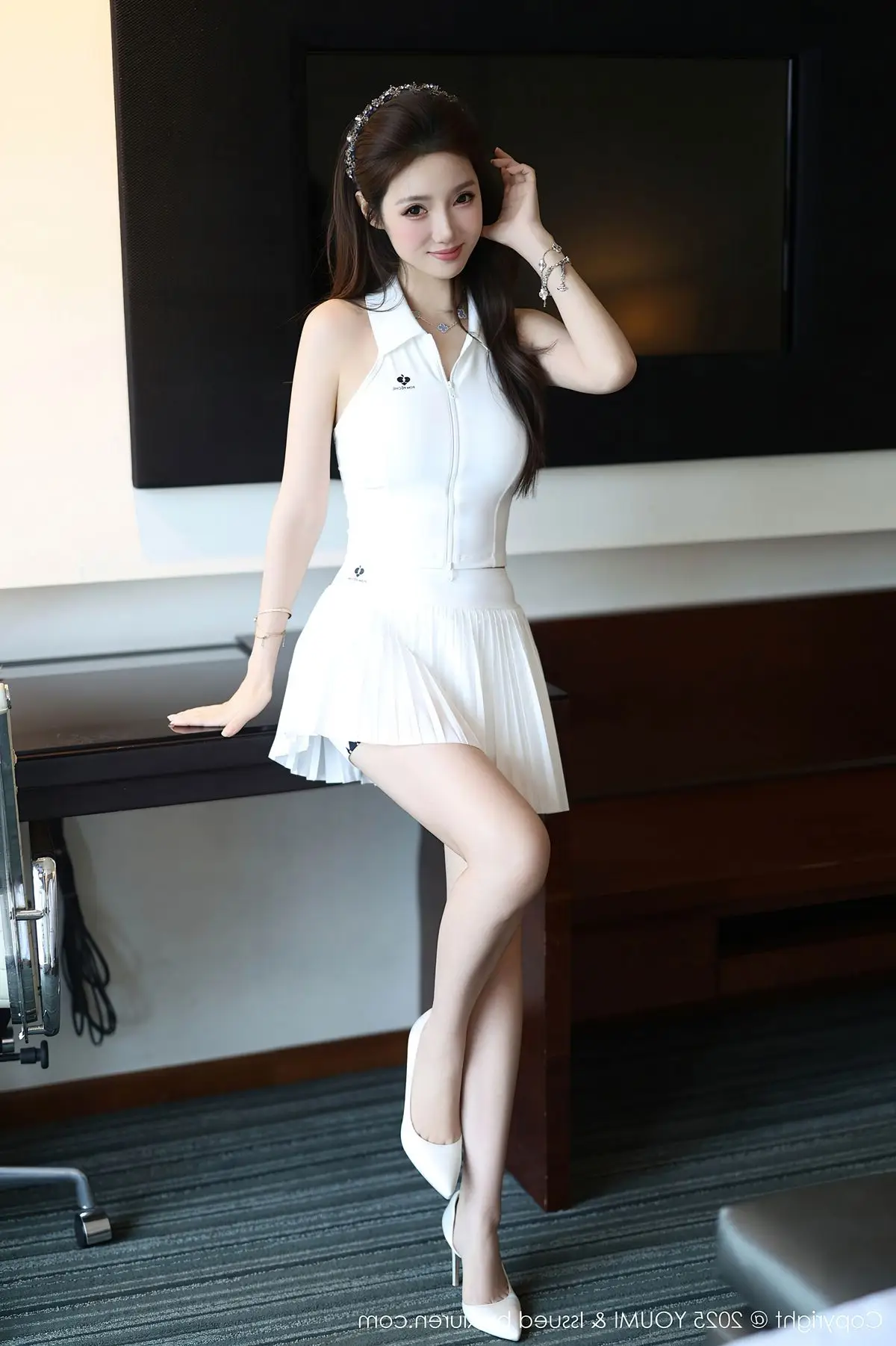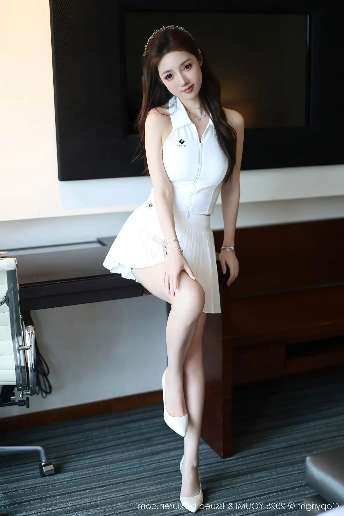 Step into the captivating world of Asian fashion and beauty with YouMi Vol.1169, featuring the radiant Chinese model Kai Zhu Quinn. In this stunning photograph, Kai Zhu Quinn effortlessly showcases her slender figure and remarkably long legs in a stylish ensemble. The elegant white top, patterned mini skirt, and high heels perfectly accentuate her alluring yet sophisticated charm. From her intense gaze to her confident pose leaning against the desk, every element speaks volumes of her self-assured beauty and irresistible appeal. This is a must-see piece from Kai Zhu Quinn's exclusive photo collection, offering an intimate and emotive glimpse into a true icon of Chinese glamour.#KaiZhuQuinn #YouMi #ChineseModel #FashionBeauty #AsianGlamour