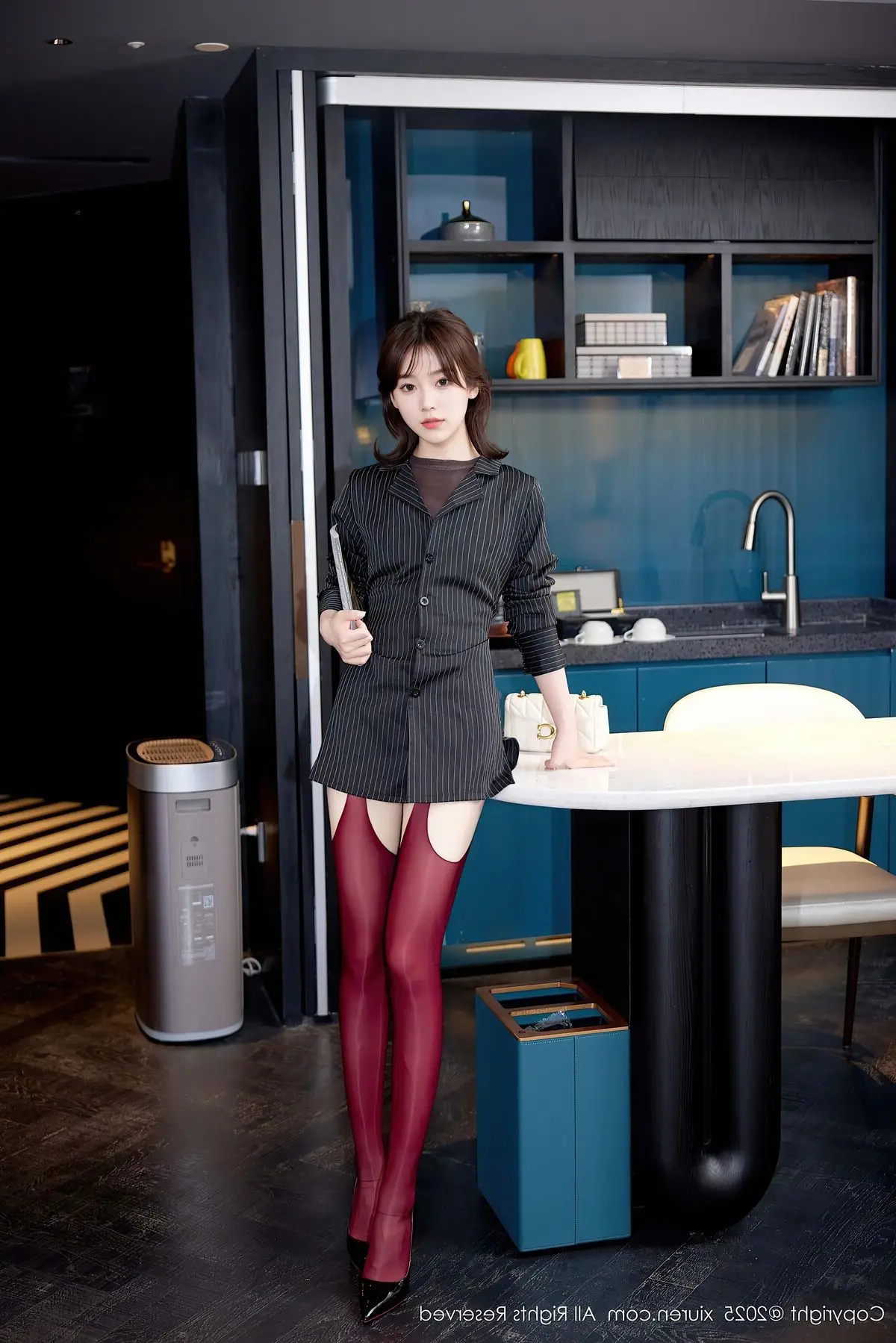 The XiuRen No.10633 collection features model Zhi Zhi presenting an undeniably captivating office style. In this striking image Zhi Zhi dons an elegant black blazer dress perfectly paired with seductive red stockings creating a unique and bold fashion statement. Her confident demeanor and engaging gaze highlight her modern beauty and alluring charm. The sophisticated interior backdrop further enhances the overall refined aesthetic. Zhi Zhi effortlessly conveys both professionalism and an irresistible allure showcasing her distinctive style and undeniable class.#ZhiZhi #XiuRen #OfficeFashion #BlazerDress #RedStockings